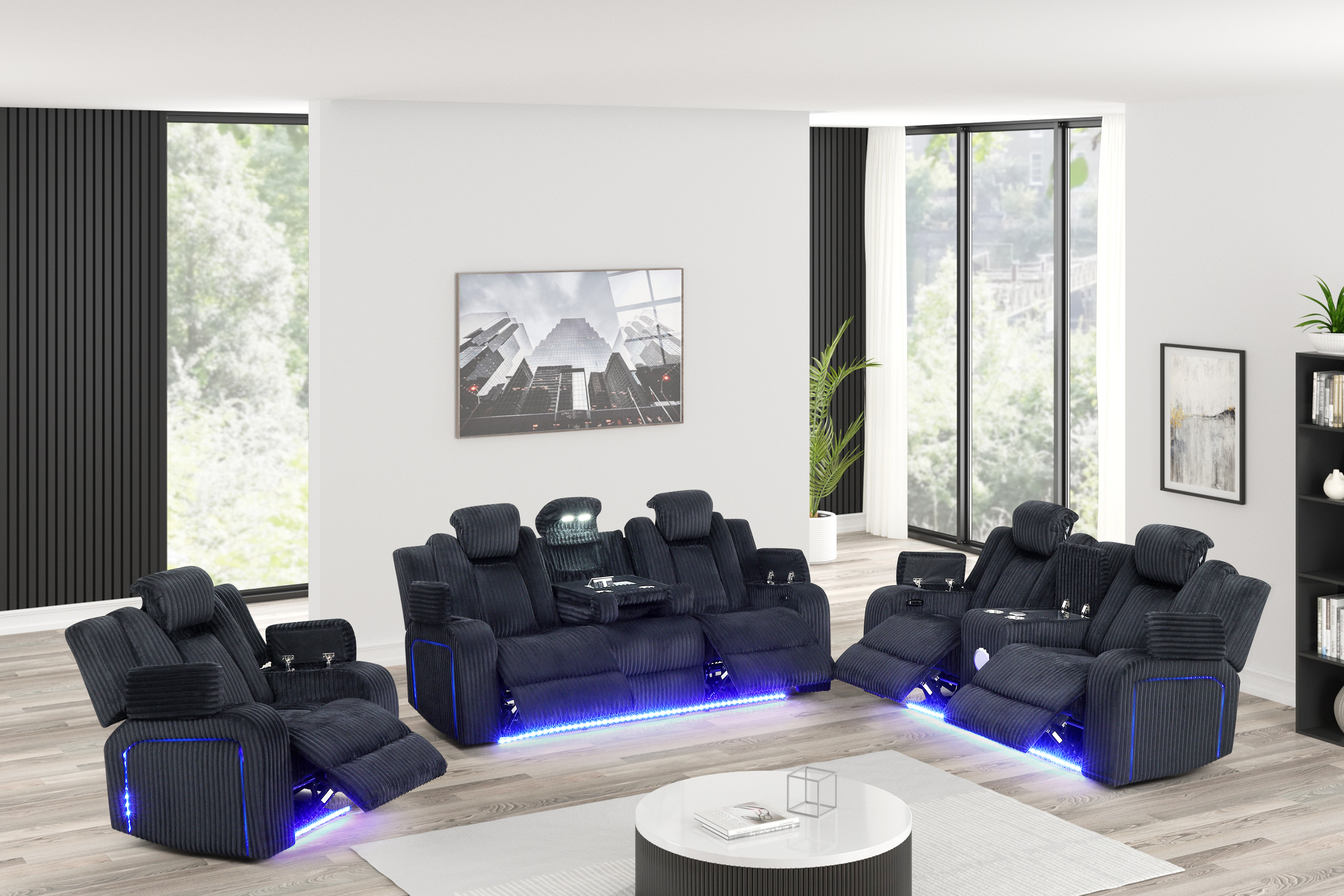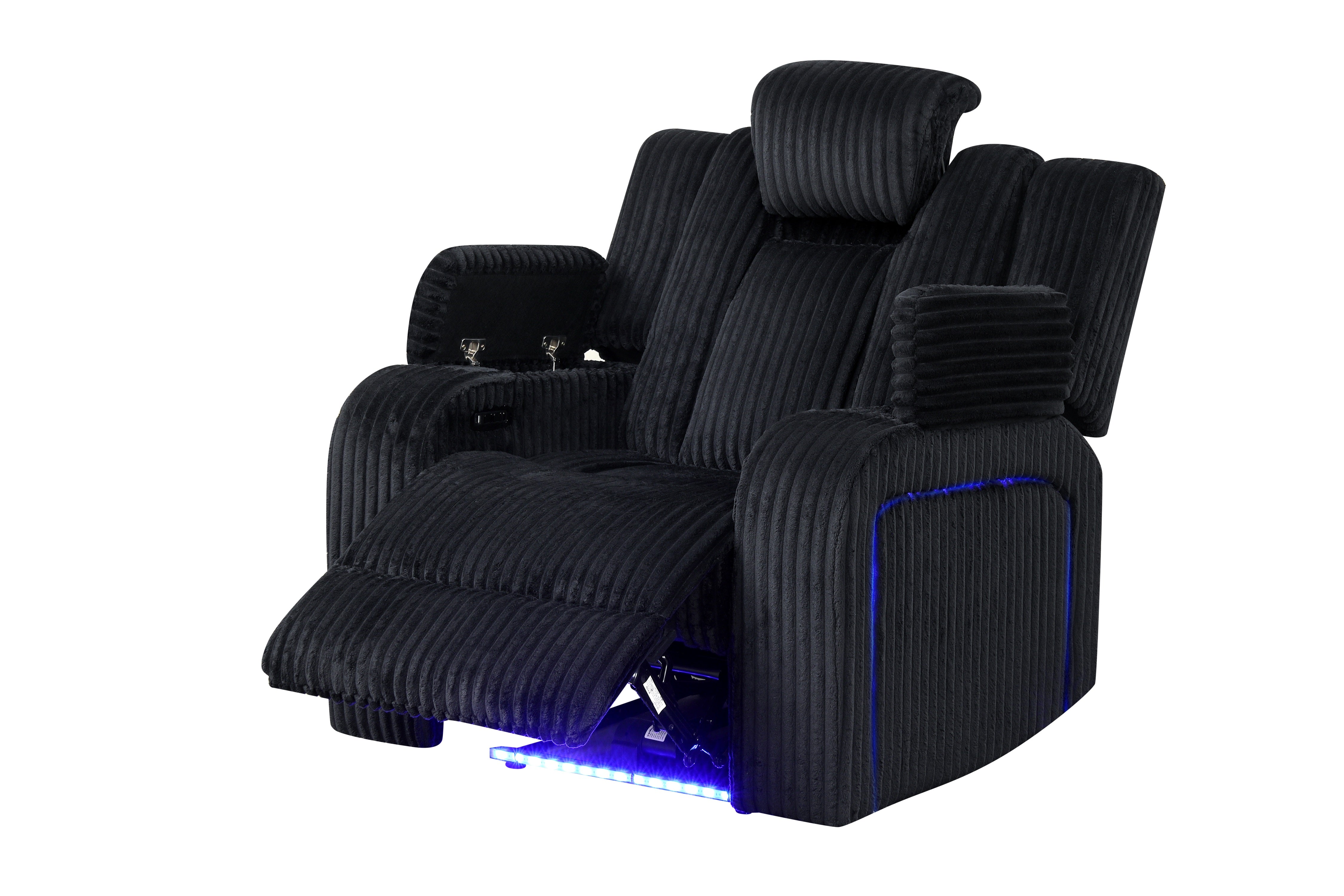 Turn your living room into the ultimate movie-night zone with the Black power reclining set. Upholstered in ultra-soft black ribbed corduroy, this set delivers deep cushioning, supportive backrests, and next-level convenience—complete with blue LED accent lighting, built-in speakers, and a charging-ready console for snacks, drinks, and devices.