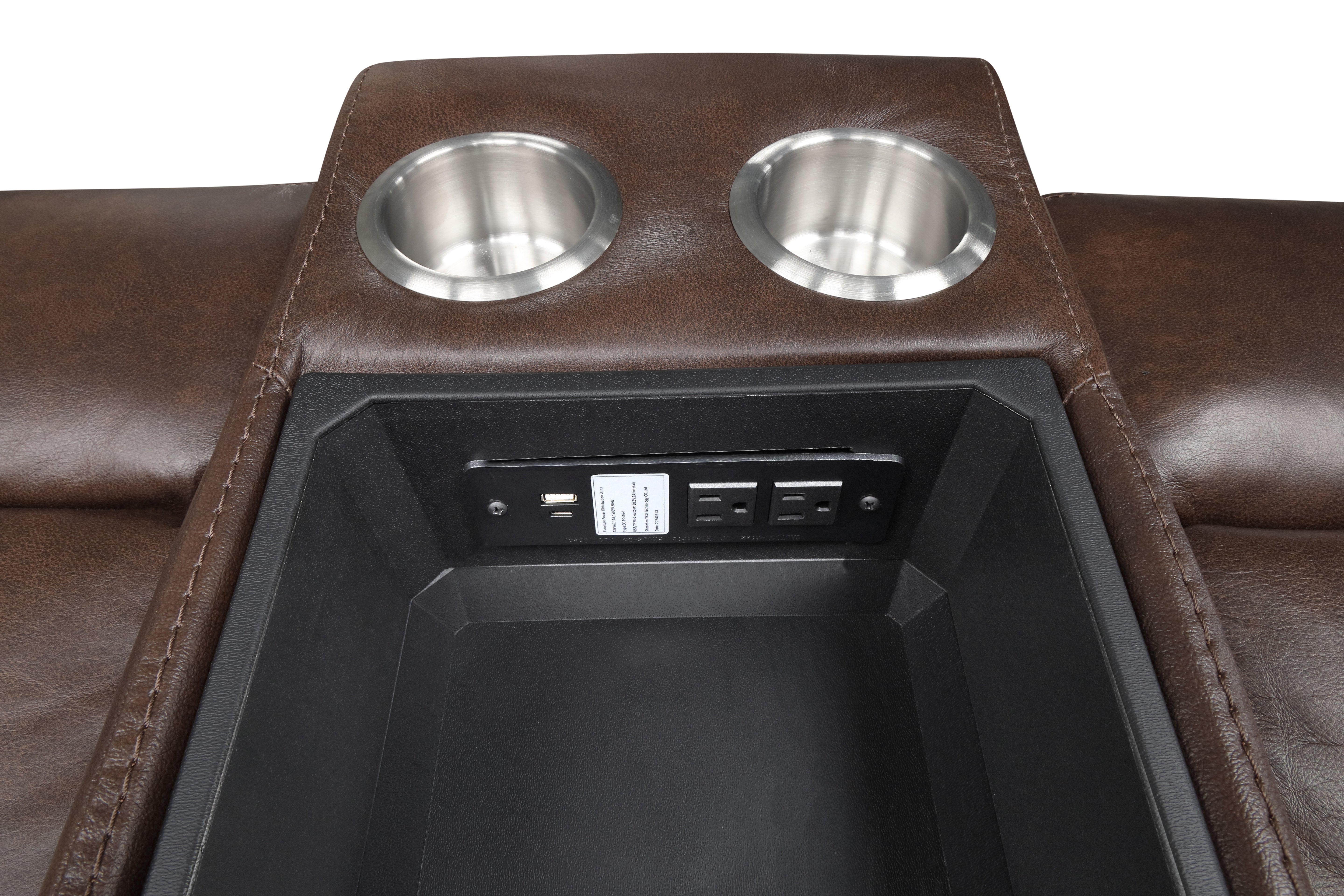 Experience the ultimate in comfort and style with this Power Reclining Sectional. Crafted from premium top-grain leather in a rich brown hue, this sectional combines luxurious materials with advanced features to enhance your living space. The sectional includes two power reclining seats on either end, allowing you to find the perfect position for relaxation at the touch of a button. The power-adjustable headrests provide personalized comfort, perfectly supporting your head and neck. The built-in storage console offers 2 cup holders for your drinks and a handy electric outlet, ensuring easy access to your devices while you relax.