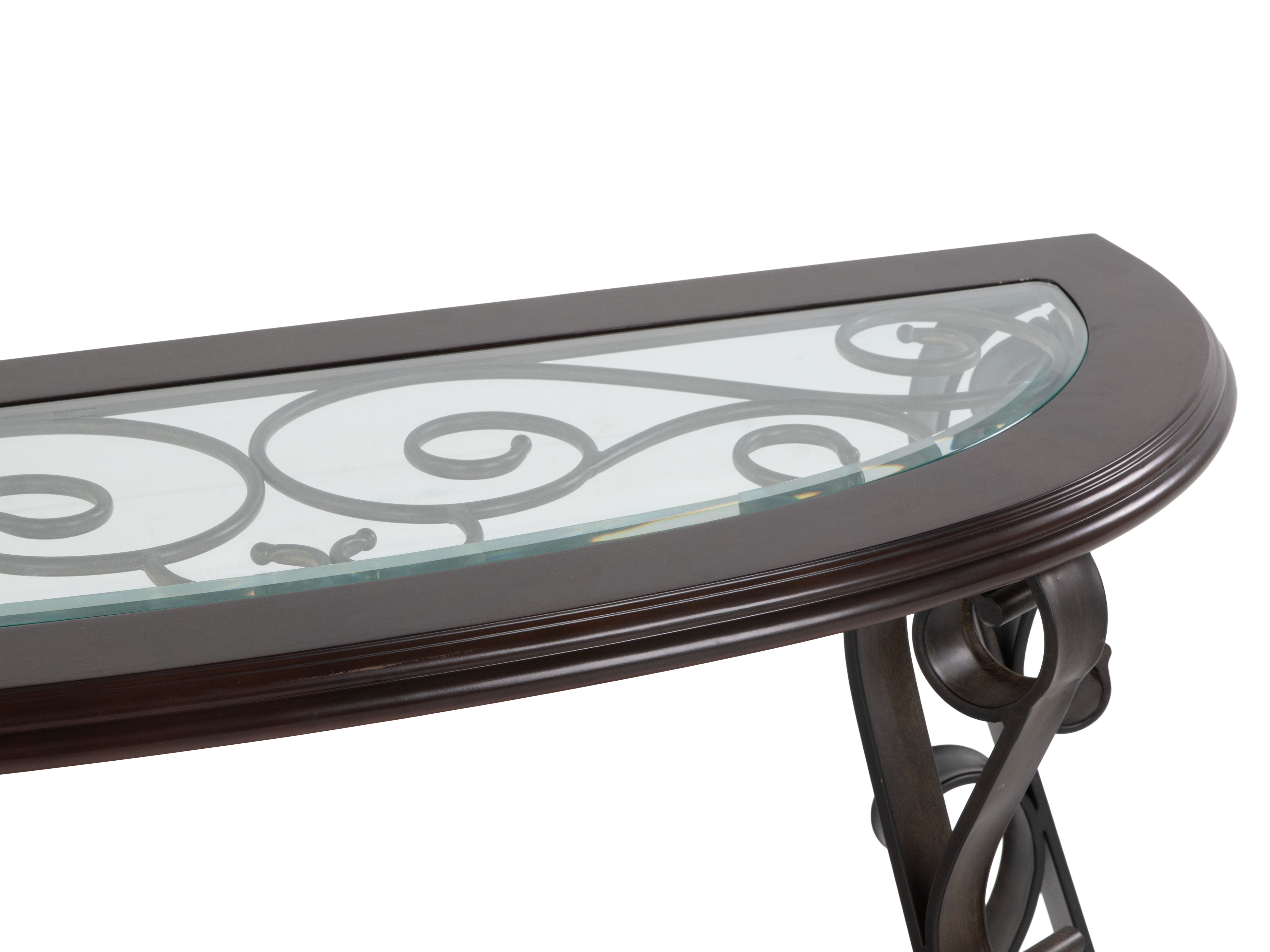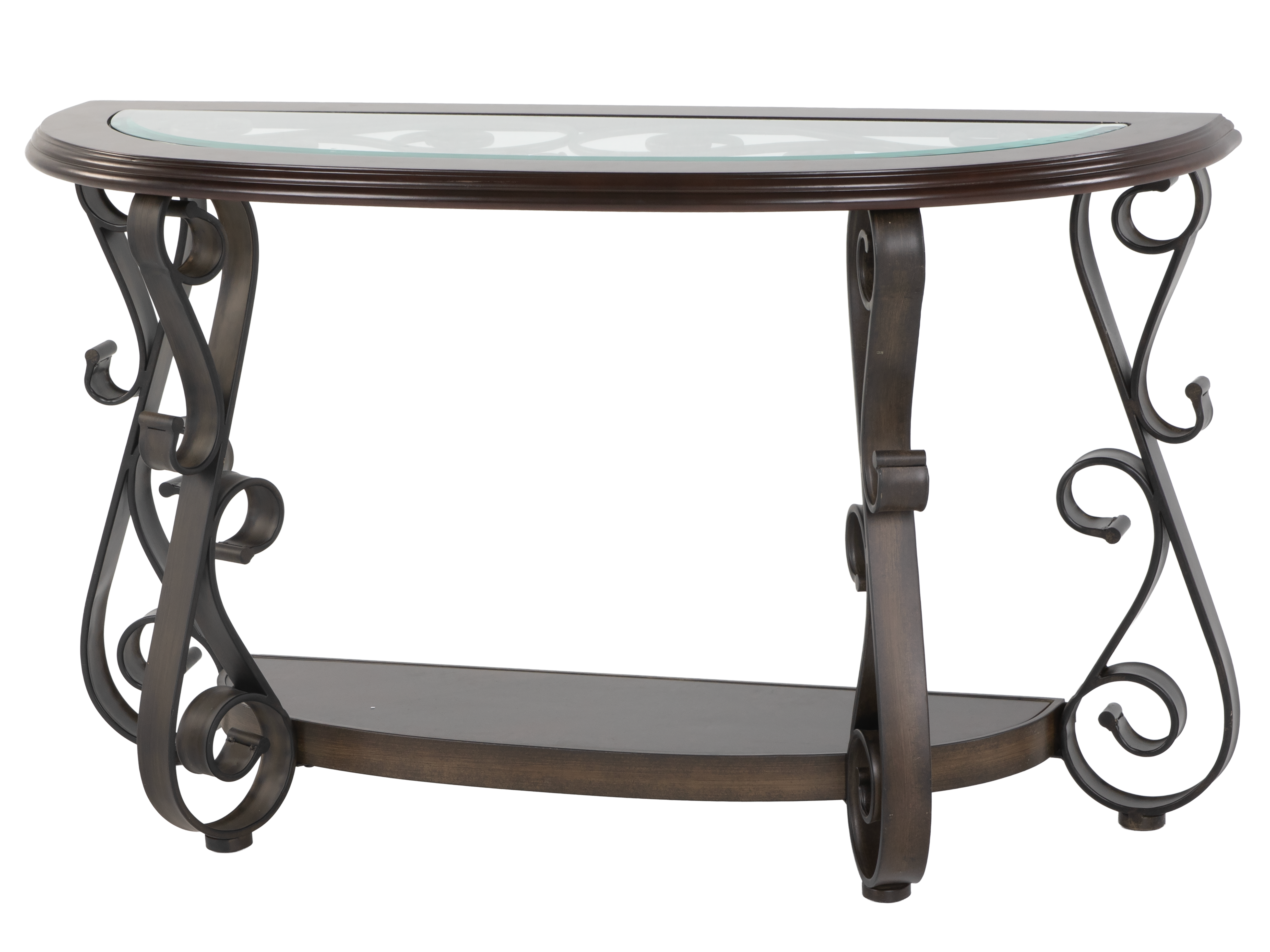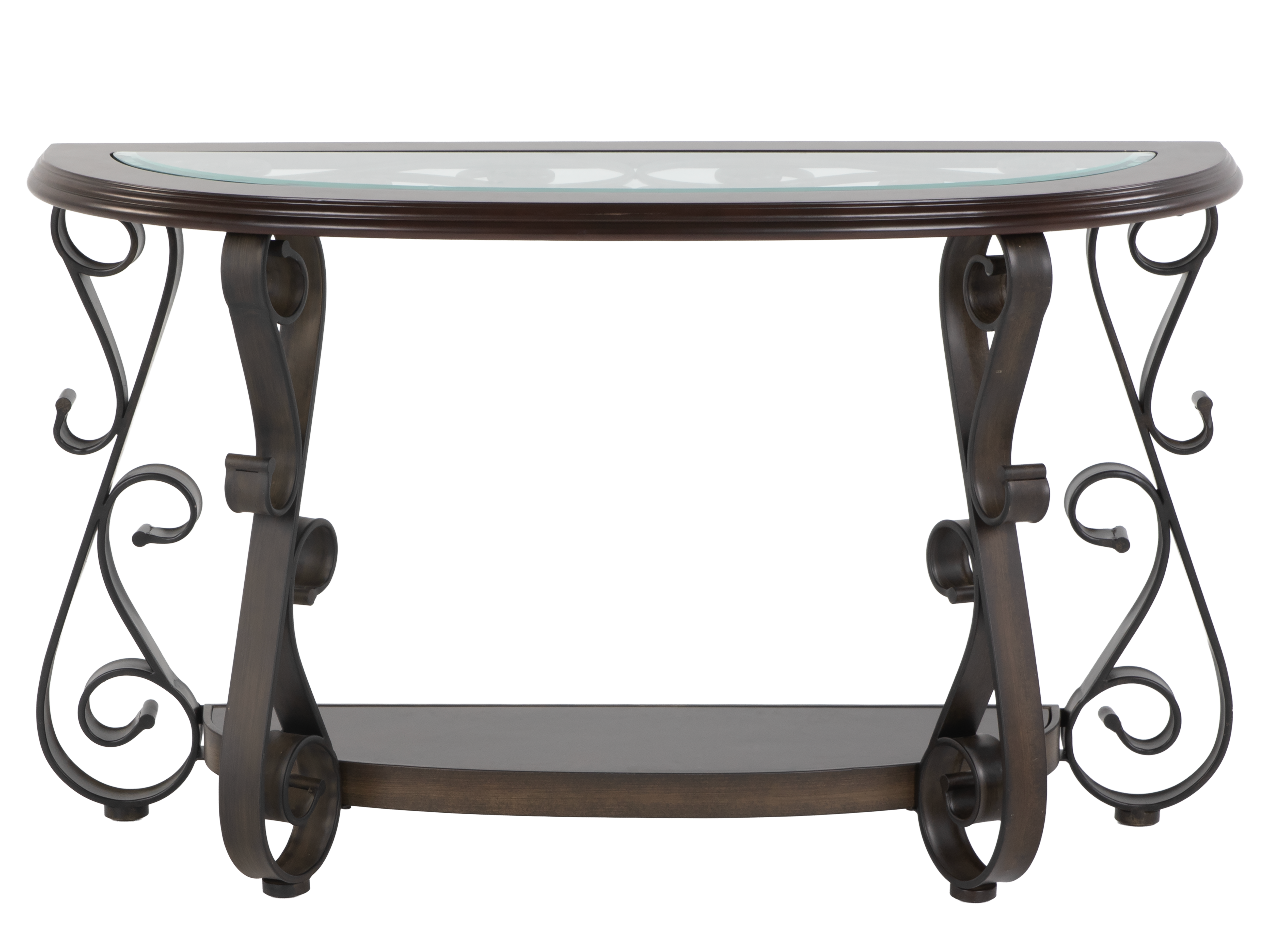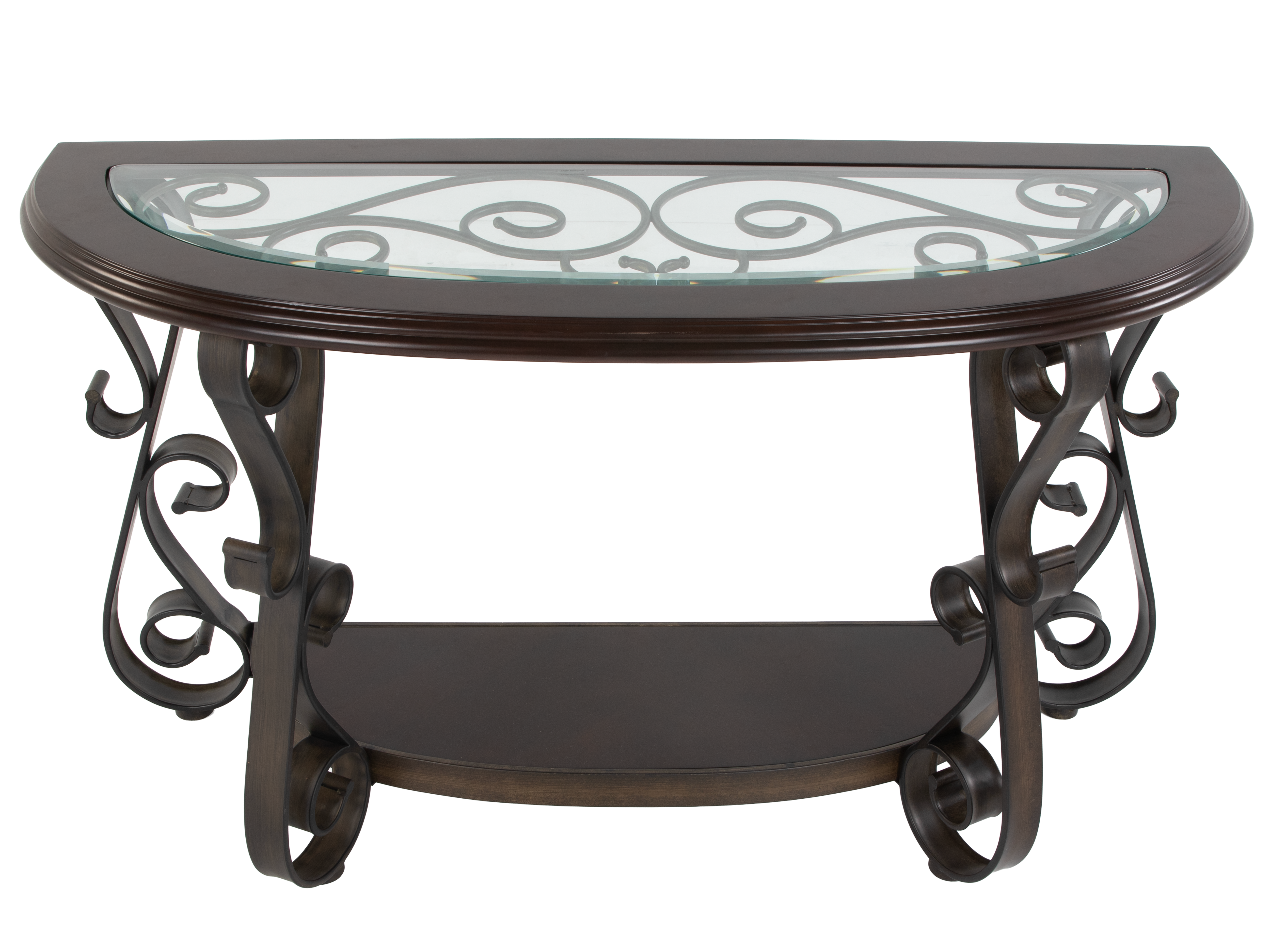 Elevate your entryway or living room with this Elegant Console Sofa Table, crafted with a rich dark wood finish and accented by a stunning glass inlay top. The table features graceful curved metal legs with artistic scrollwork, delivering a sophisticated and timeless look. Its spacious surface is ideal for displaying decorative vases, photo frames, or lamps, while the lower shelf provides additional space for books or accent pieces. This sofa table blends seamlessly with classic, transitional, or contemporary décor styles and makes a statement in any setting.