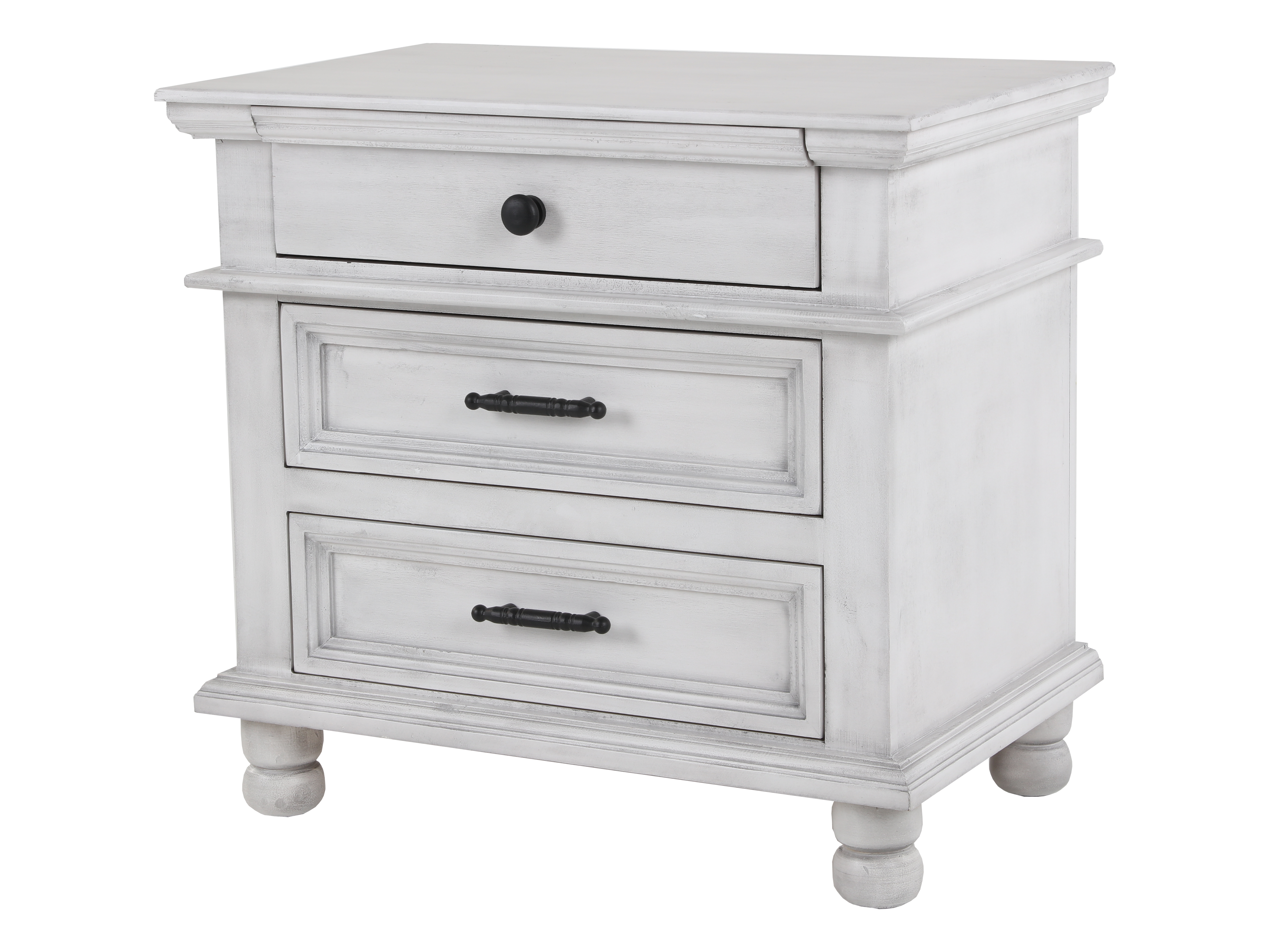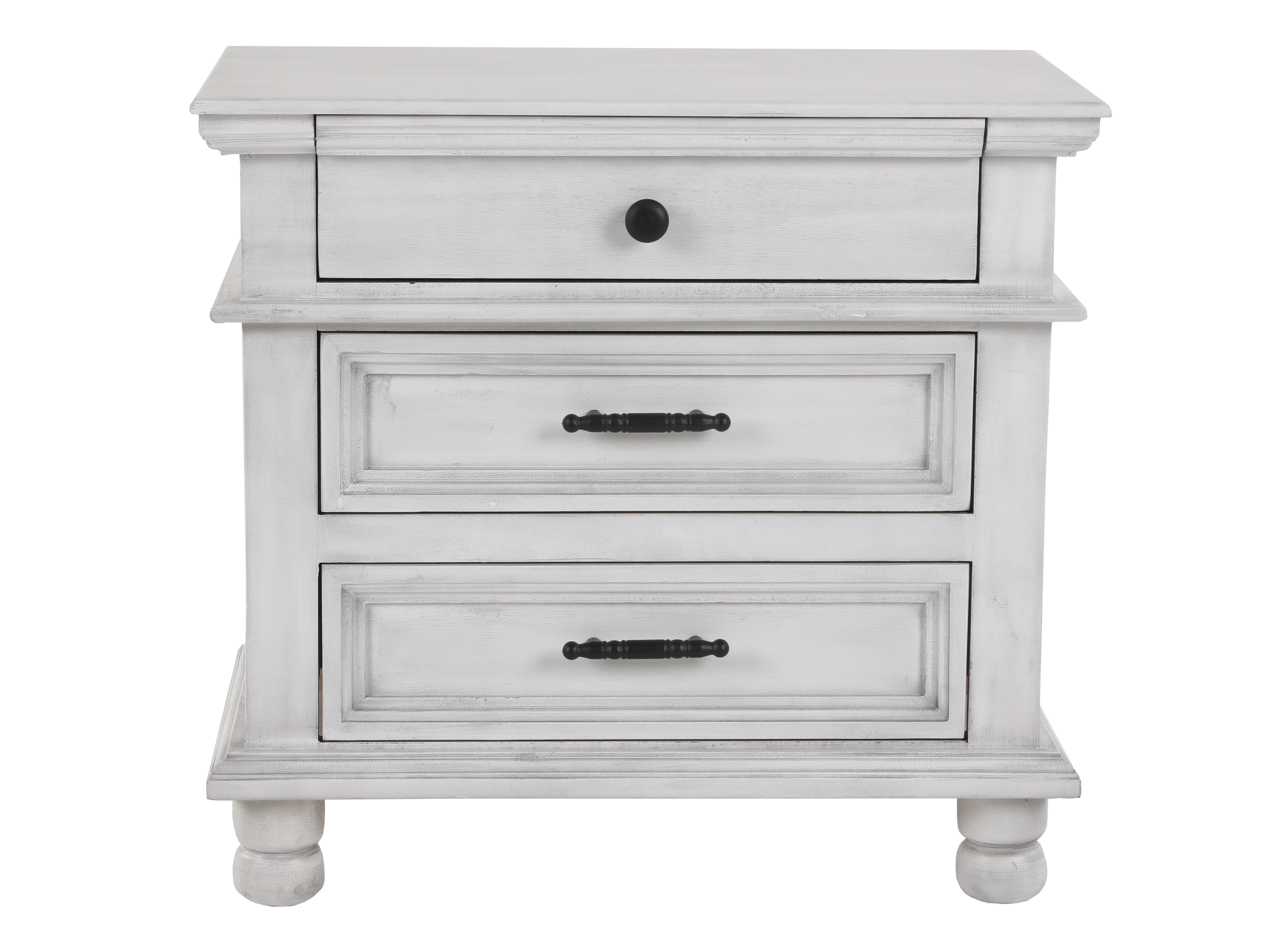 This bedside essential features three roomy drawers to keep everything organized—store chargers and small items up top, and tuck away books, accessories, or extra linens in the larger drawers below. The matte black hardware adds crisp contrast (top drawer knob plus lower bar pulls), while the classic trim and sturdy feet complete the timeless farmhouse silhouette.