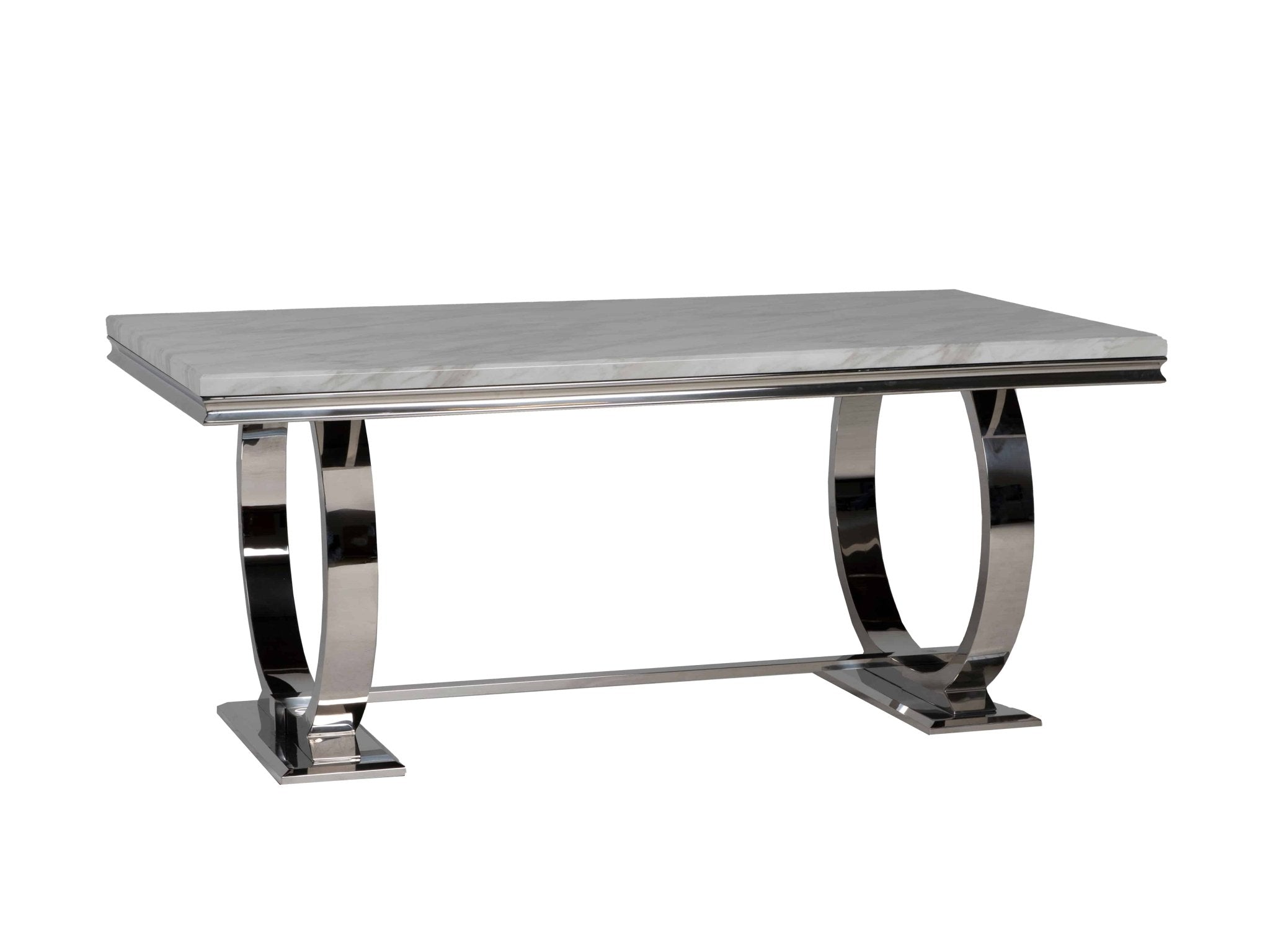 Host a dinner party in style with this modernist dining table. This dining room set features a distinctive and striking silhouette that makes any ordinary dining room appear much more unique. White cultured marble top cleverly incorporates classic elegance into your modern interior. Supporting the tabletop, the shiny stainless steel base designed with interlaced circles achieves a balance between strength and grace. The seats are upholstered in beautiful velvet fabric with beautiful tufted button.