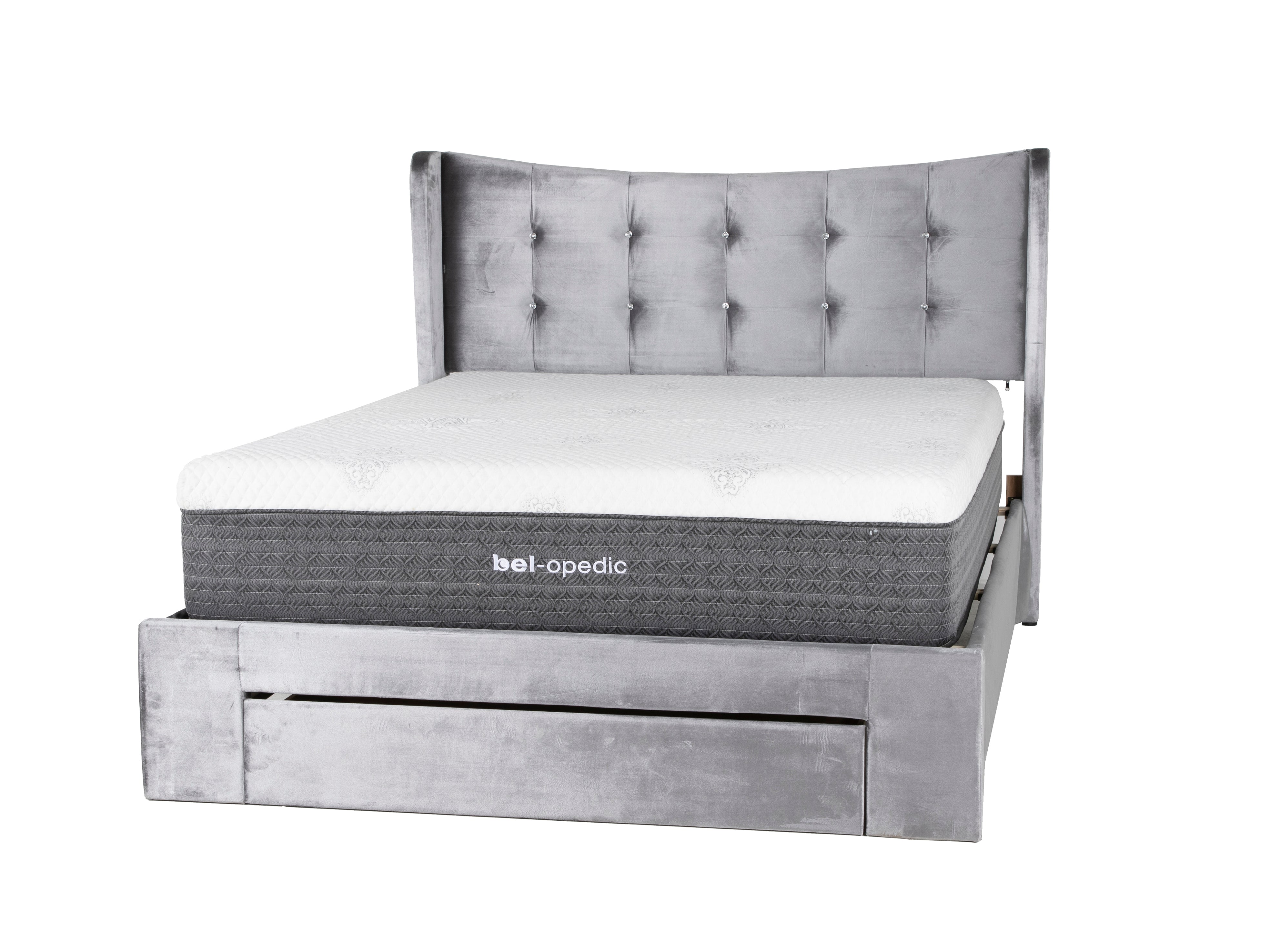 Bring a modern-glam look (and extra storage) to your bedroom with the Queen Bed in a soft gray velvet-look upholstery. The tall wingback headboard features diamond-style tufting with sparkle button accents for an elevated, designer feel. At the foot of the bed, an oversized pull-out drawer gives you a hidden spot to store extra blankets, pillows, or seasonal clothing—perfect for keeping your space clean and uncluttered.