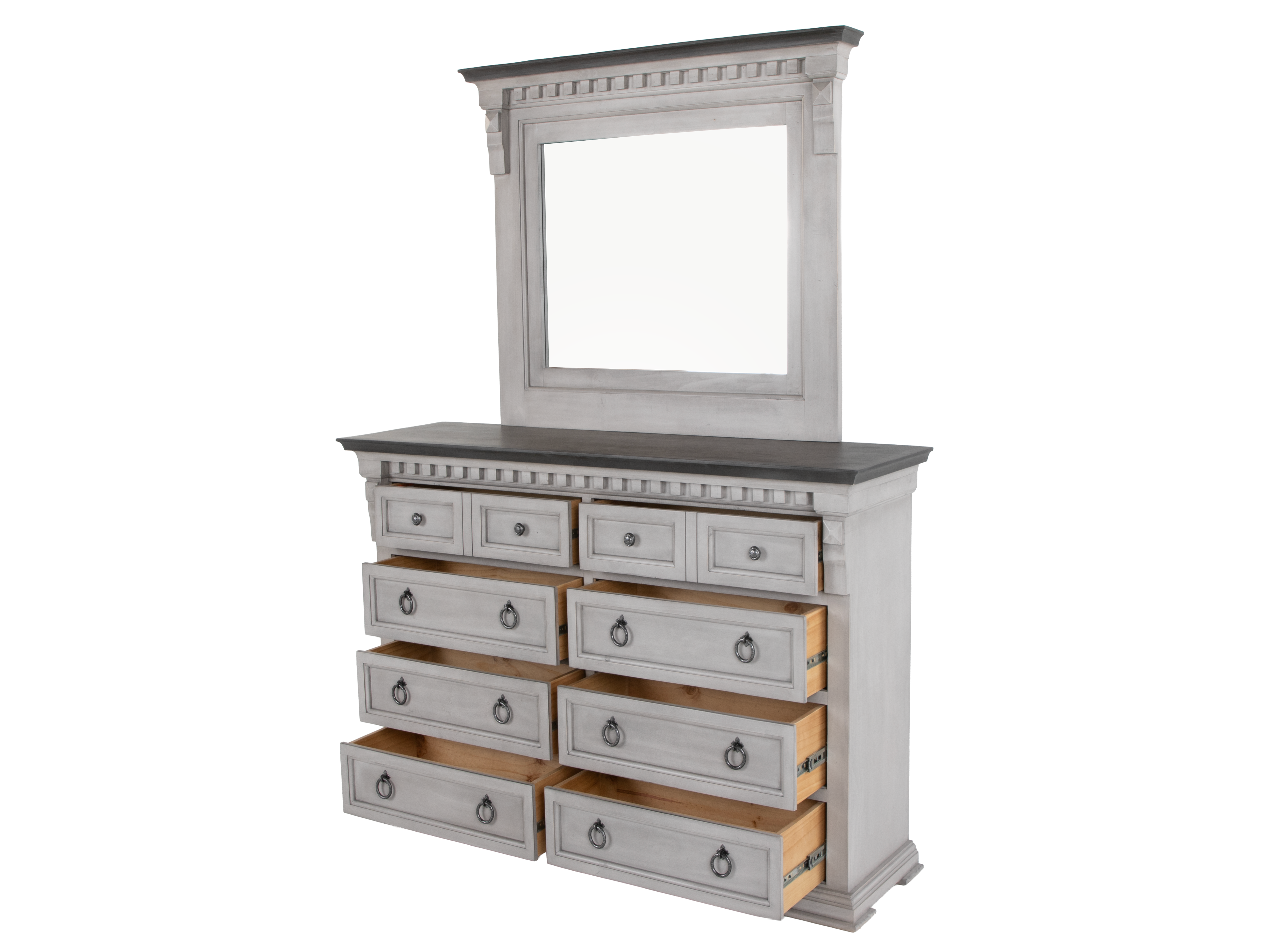 This set includes the matching storage essentials you need: a spacious dresser, coordinating mirror, and a 3-drawer nightstand with ring-pull hardware and framed drawer fronts. Want even more storage? The matching chest is available separately.