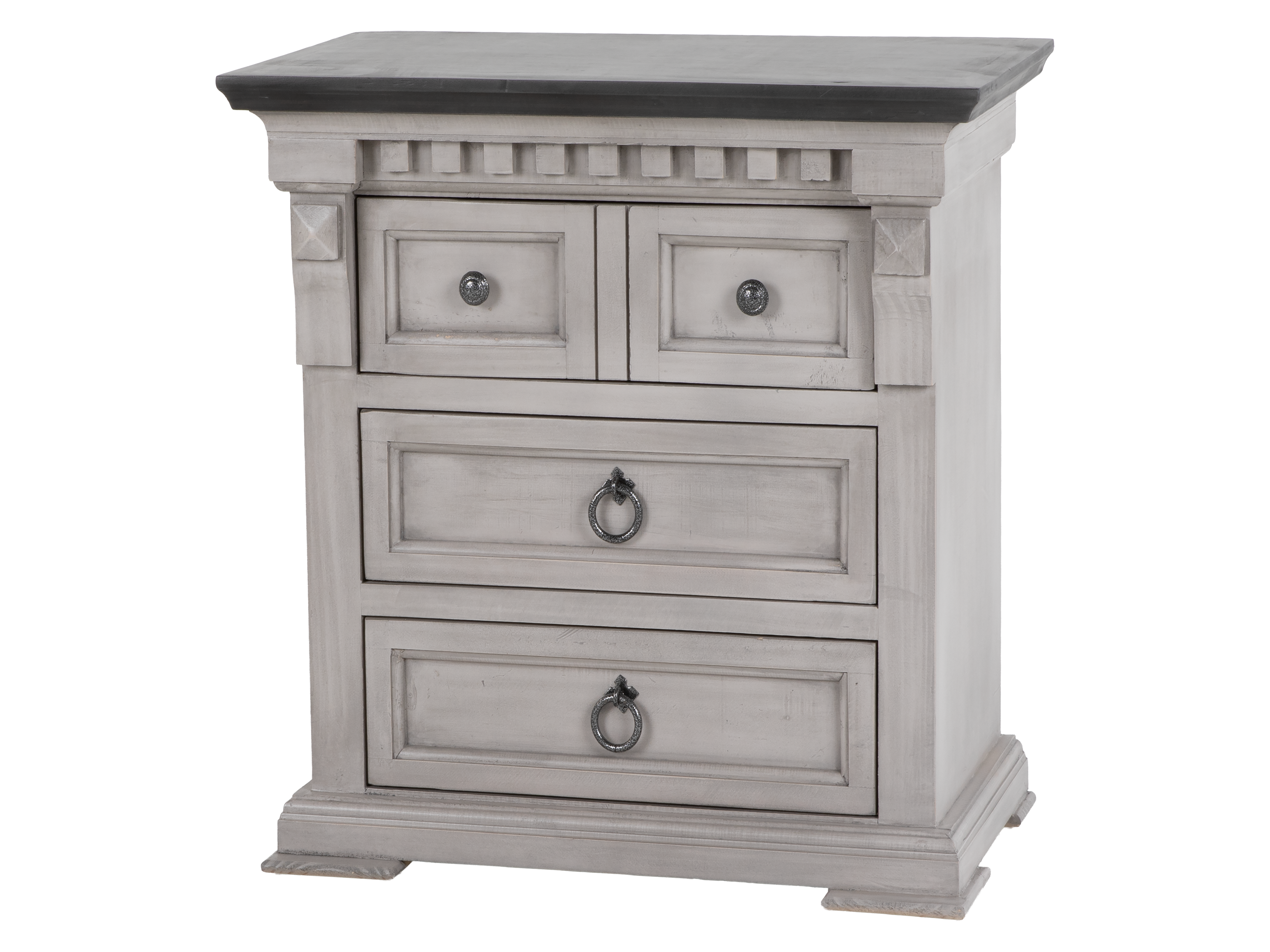 The dresser offers multiple drawers for clothing and linens, and the nightstand includes three drawers for bedside storage. A matching chest is available separately for additional storage.