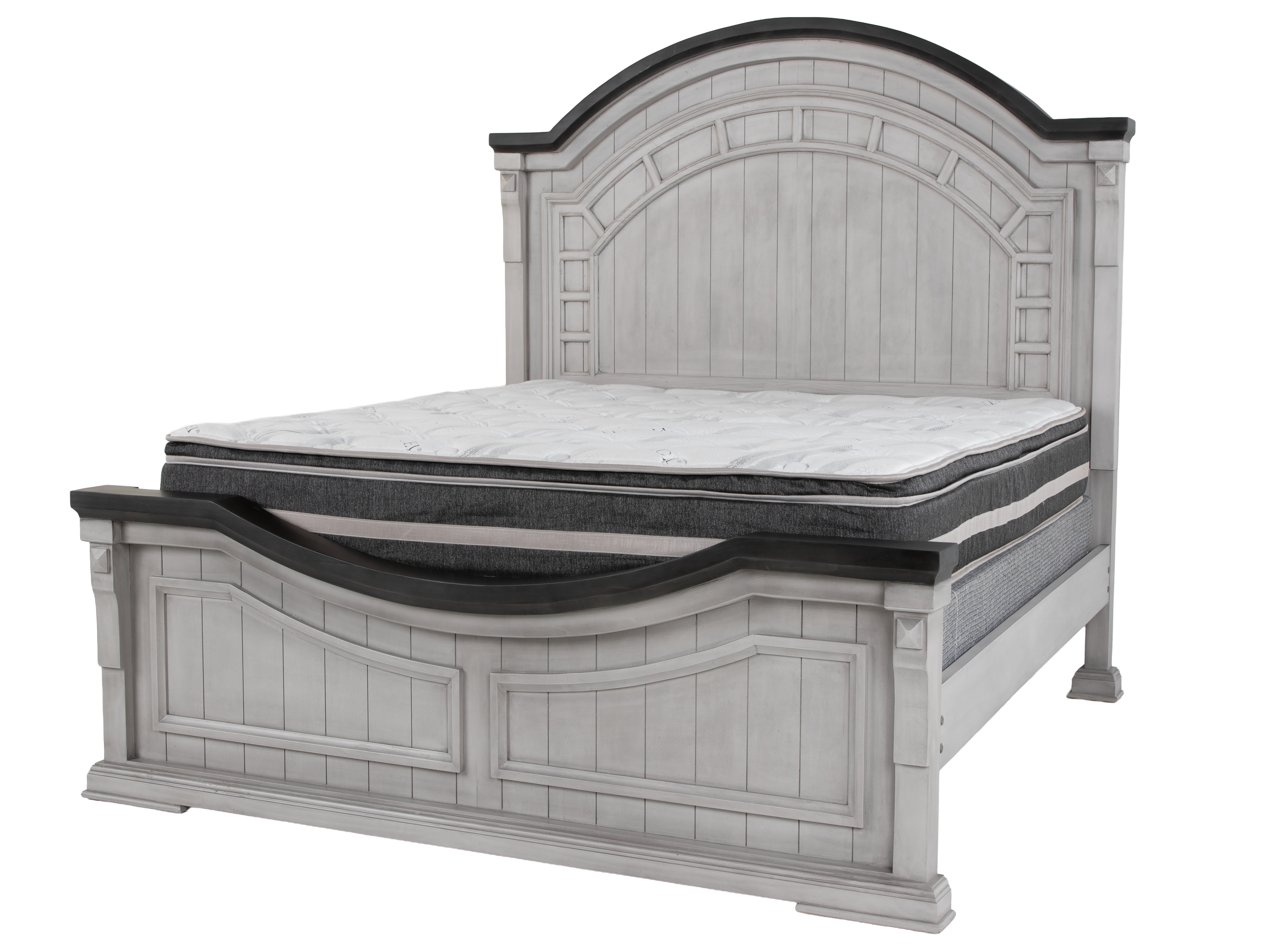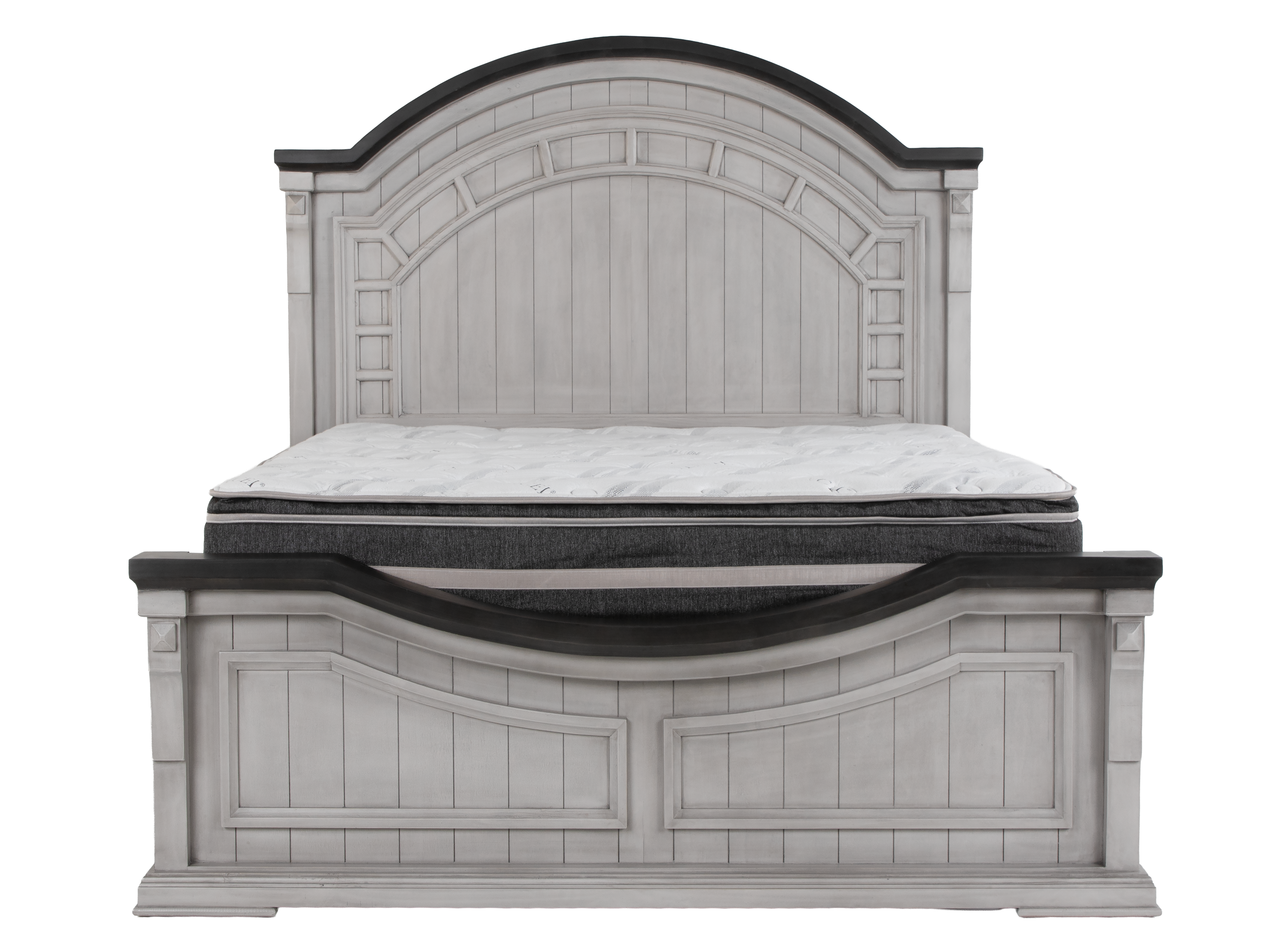 - Bed Design: Arched, framed panel headboard with matching paneled footboard and substantial molding