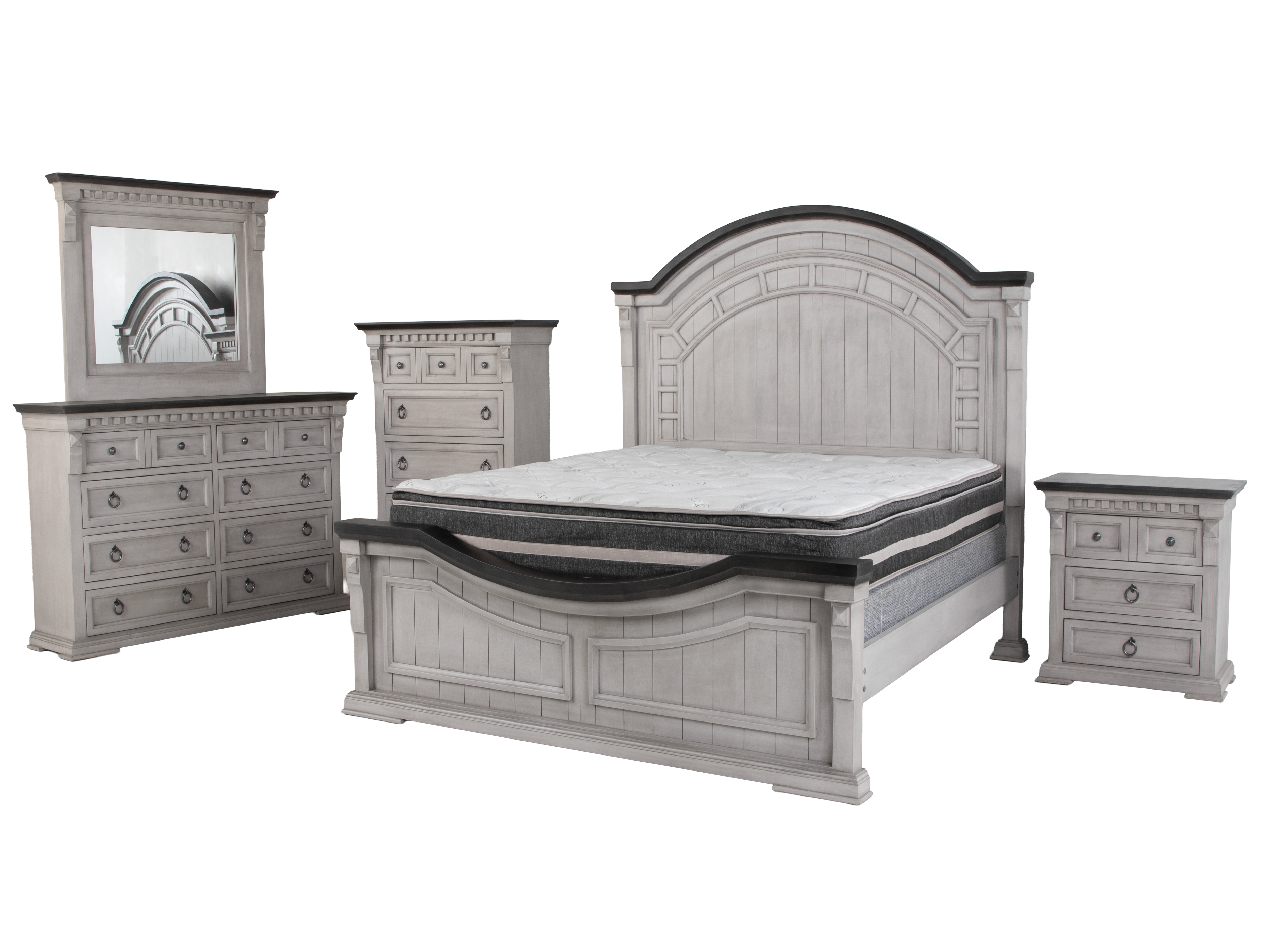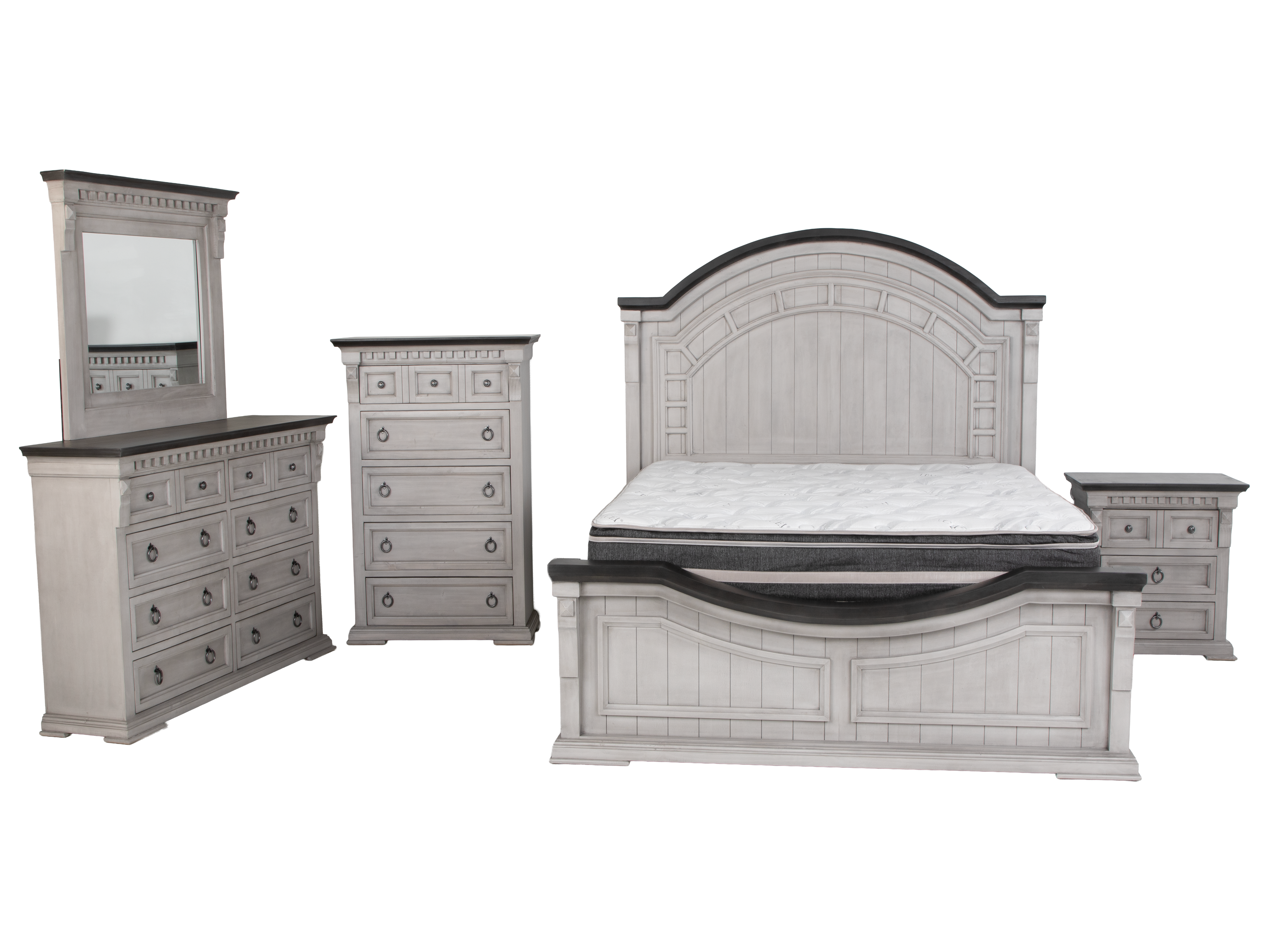 Create a cozy, high-end farmhouse look with the Mission Hills Bedroom Set, featuring a bold two-tone finish and classic architectural details. The bed is the star of the room, designed with an elegant arched panel headboard, framed trim, and a contrasting dark charcoal/espresso top rail that pops against the weathered gray/white body—perfect for rustic farmhouse, transitional, or modern country bedrooms.
