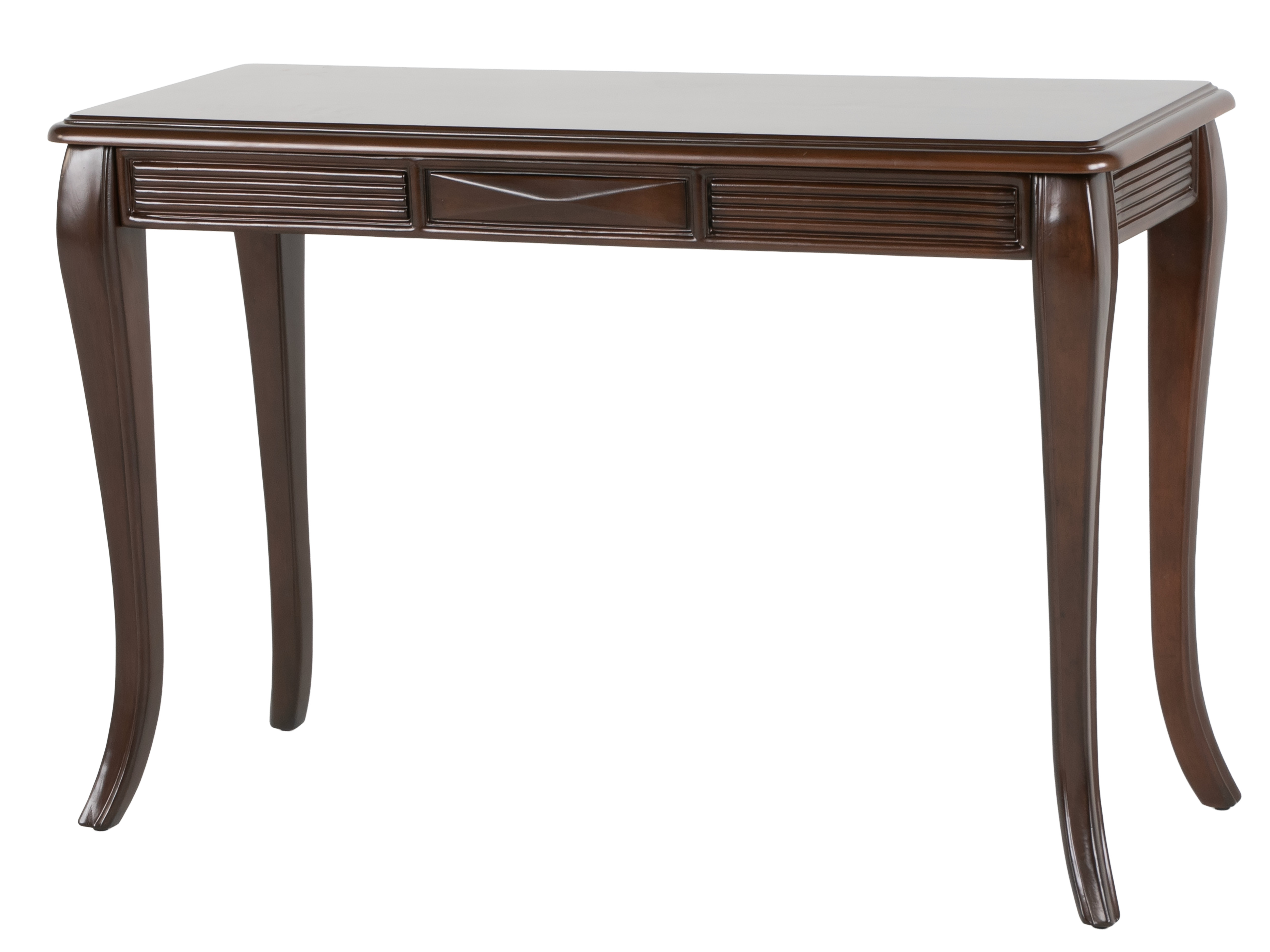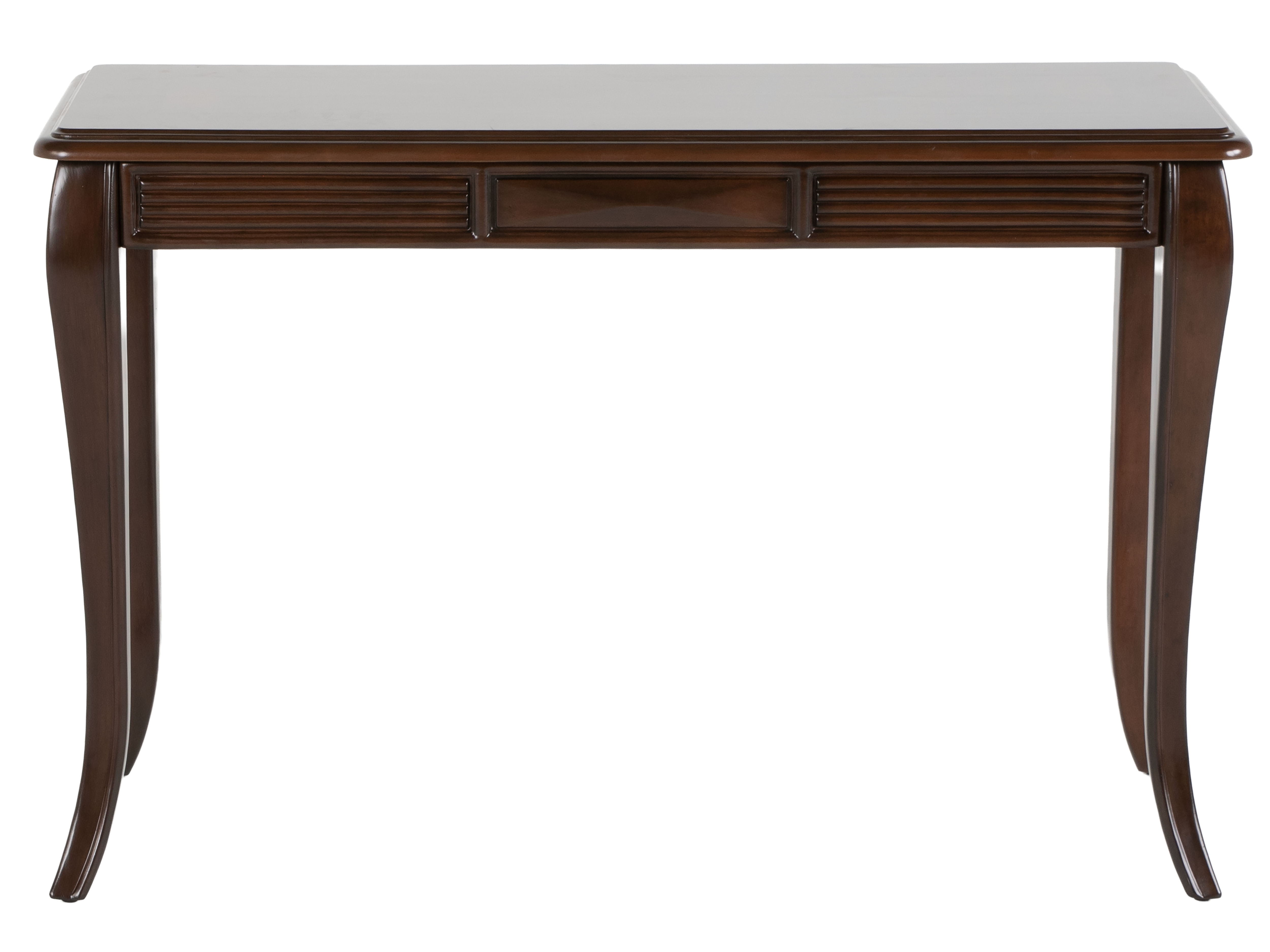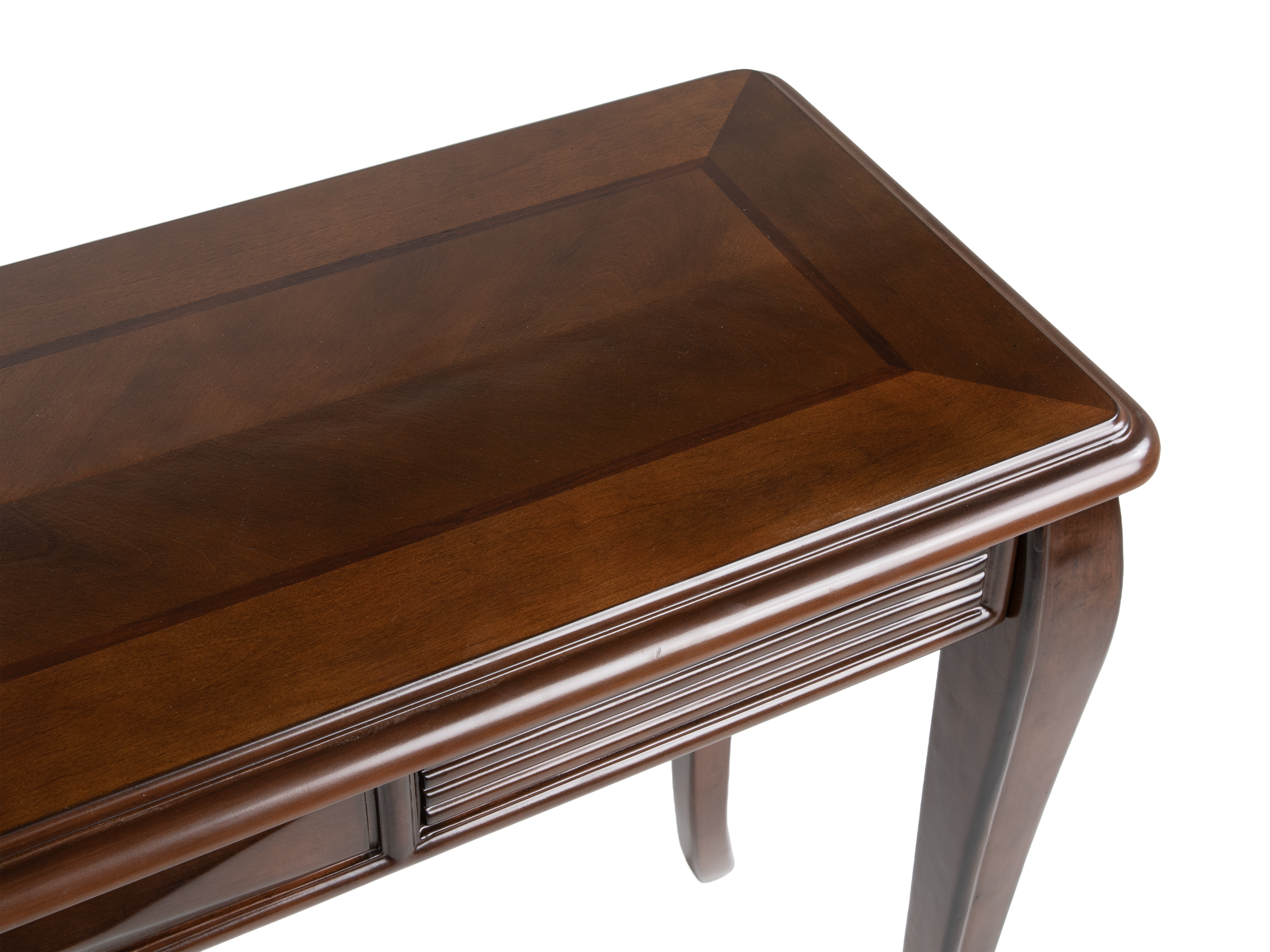 Add a refined finishing touch behind your sofa, in an entryway, or along a hallway with this elegant sofa table. Finished in a rich dark brown, it features a smooth framed, inlay-style tabletop that gives the look of custom craftsmanship. The apron showcases textured fluted detailing with a centered decorative panel, while the gently curved legs create a graceful silhouette that feels classic yet versatile.