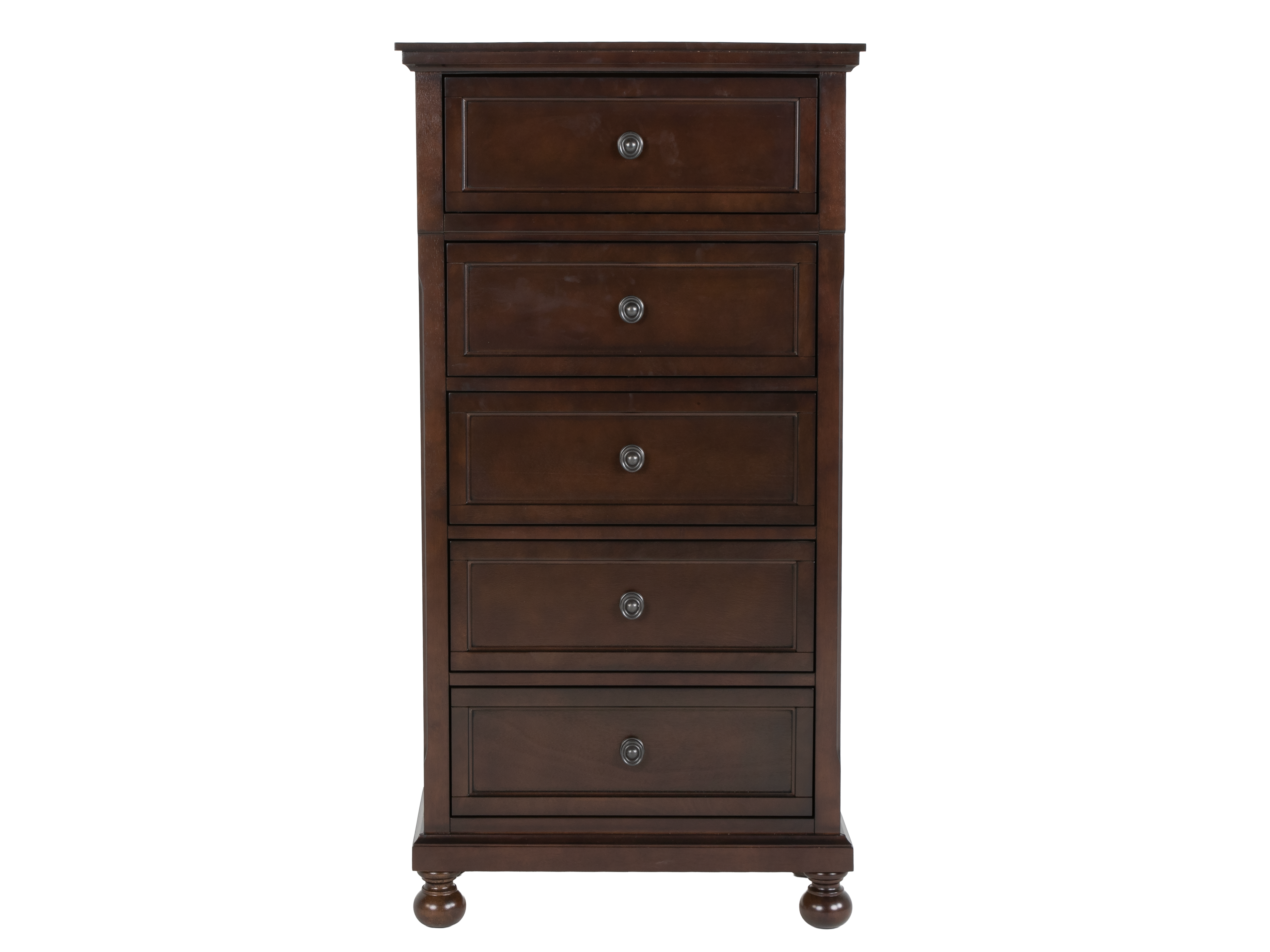This transitional chest features five drawers, providing generous vertical storage for clothing, linens and accessories.