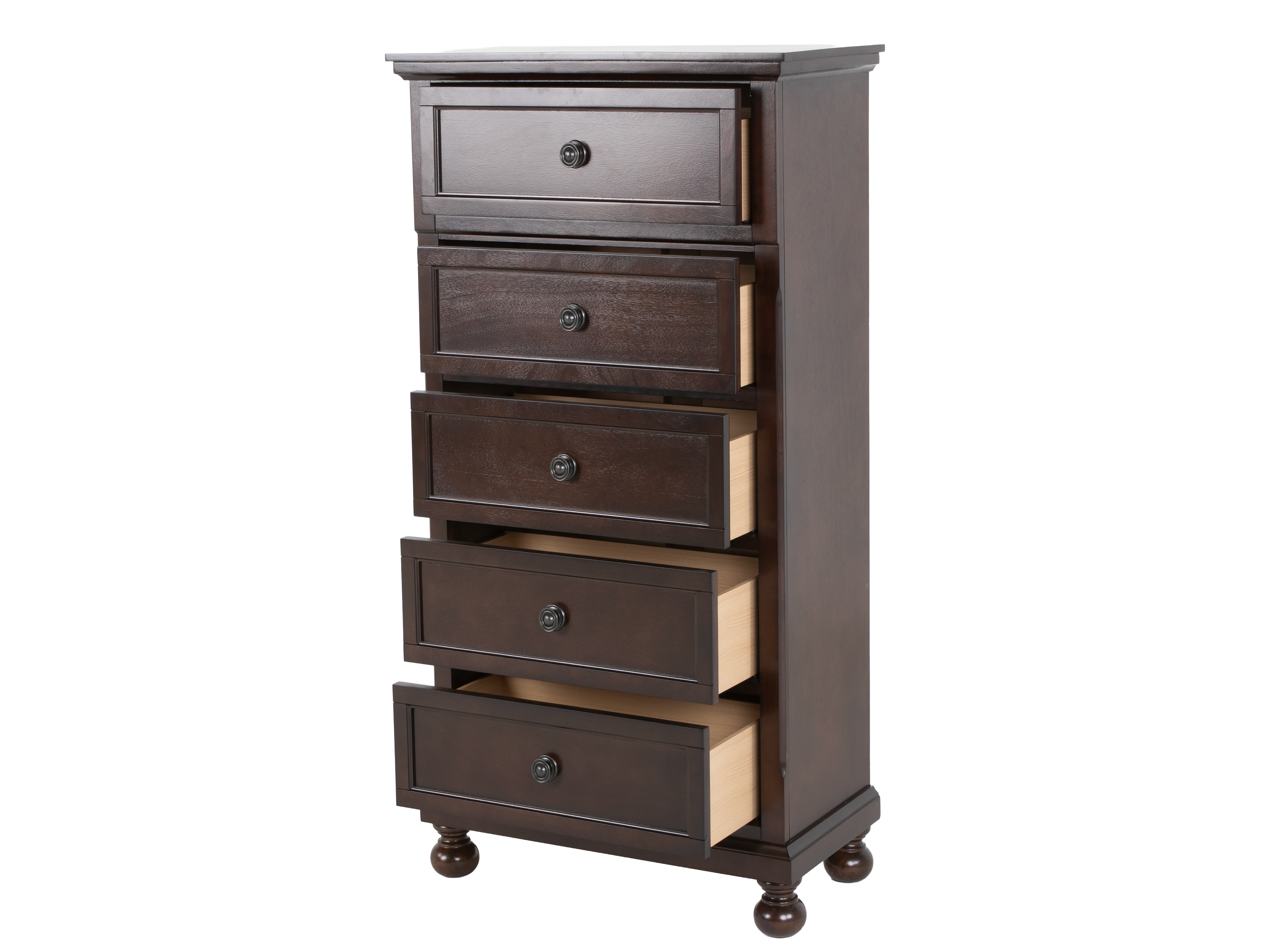 Complete your bedroom with the Transitional espresso 5-Drawer Chest, a tall, space-saving storage piece that matches the rest of the BF2501 bedroom collection. Dark espresso finish, framed drawer fronts, and classic bun feet give this chest a timeless, tailored look that pairs easily with traditional or transitional décor.