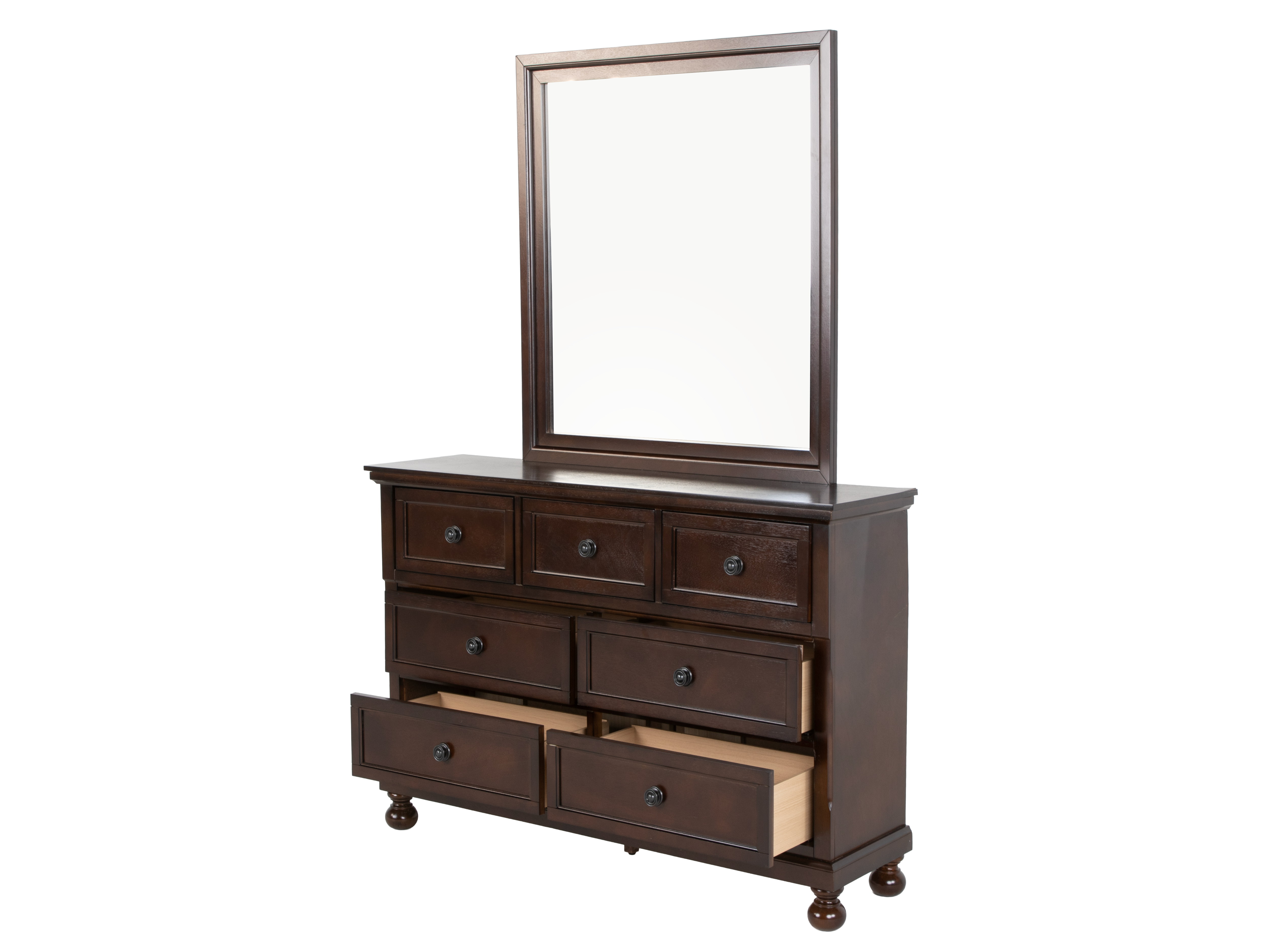 A roomy 7-drawer dresser paired with the matching framed mirror anchors your storage wall. English dovetail drawer boxes and sturdy MDF drawer bases are finished in a light brown interior and glide smoothly, so you can easily organize clothing and accessories. The coordinating nightstand keeps bedside essentials close at hand with two convenient drawers. Round metal knobs in a brushed silver tone complete the tailored, upscale look.