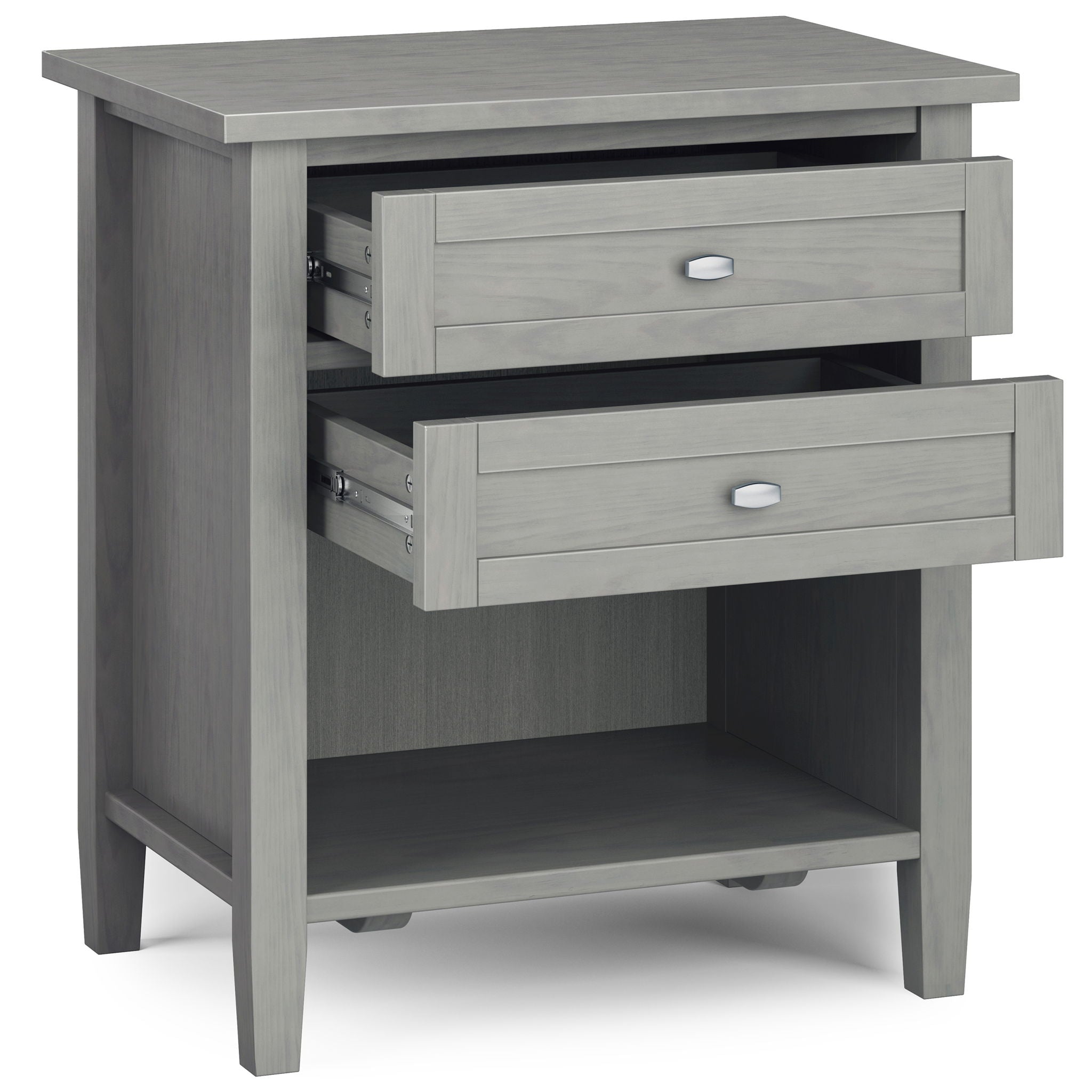 • Features two (2) spacious drawers, open bottom storage area, brushed nickel drawer pulls and metal drawer glides