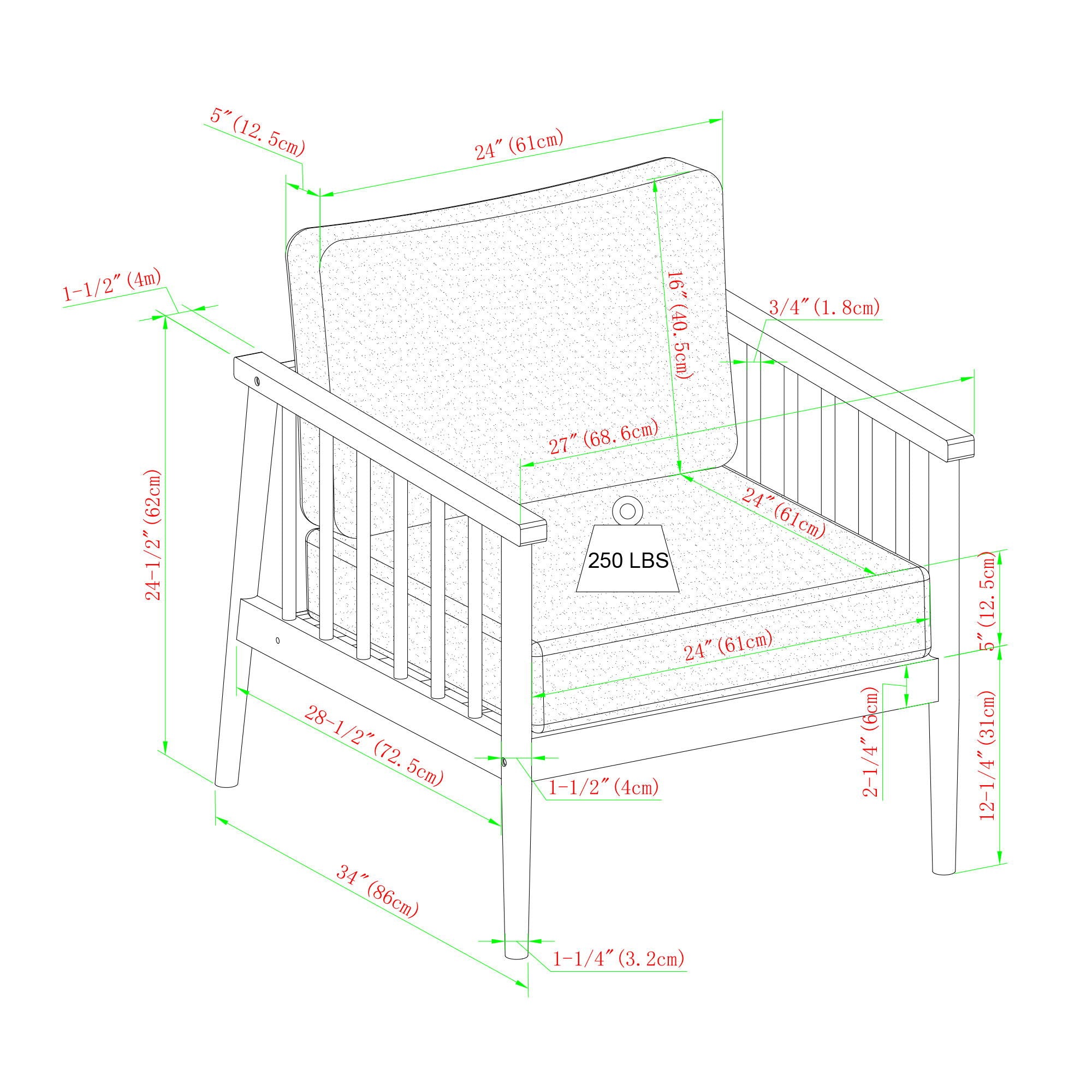 - Chair features upholstered cushions and backrests