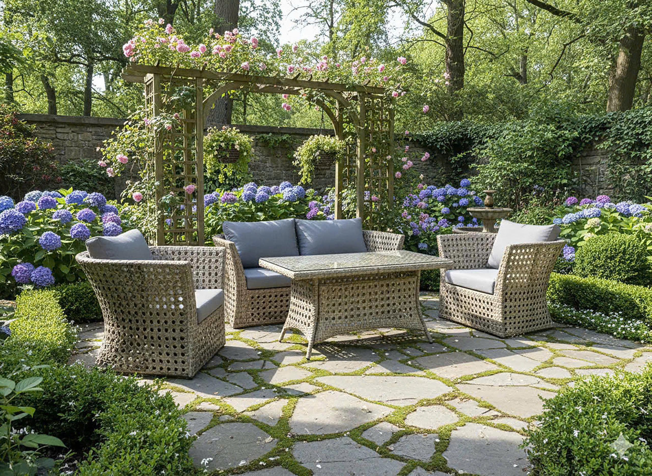 Wipe the woven surfaces with a soft cloth and mild soap as needed. Spot-clean cushions and allow them to dry fully. For best longevity, store cushions dry or use an outdoor cover during heavy weather or long periods of non-use.