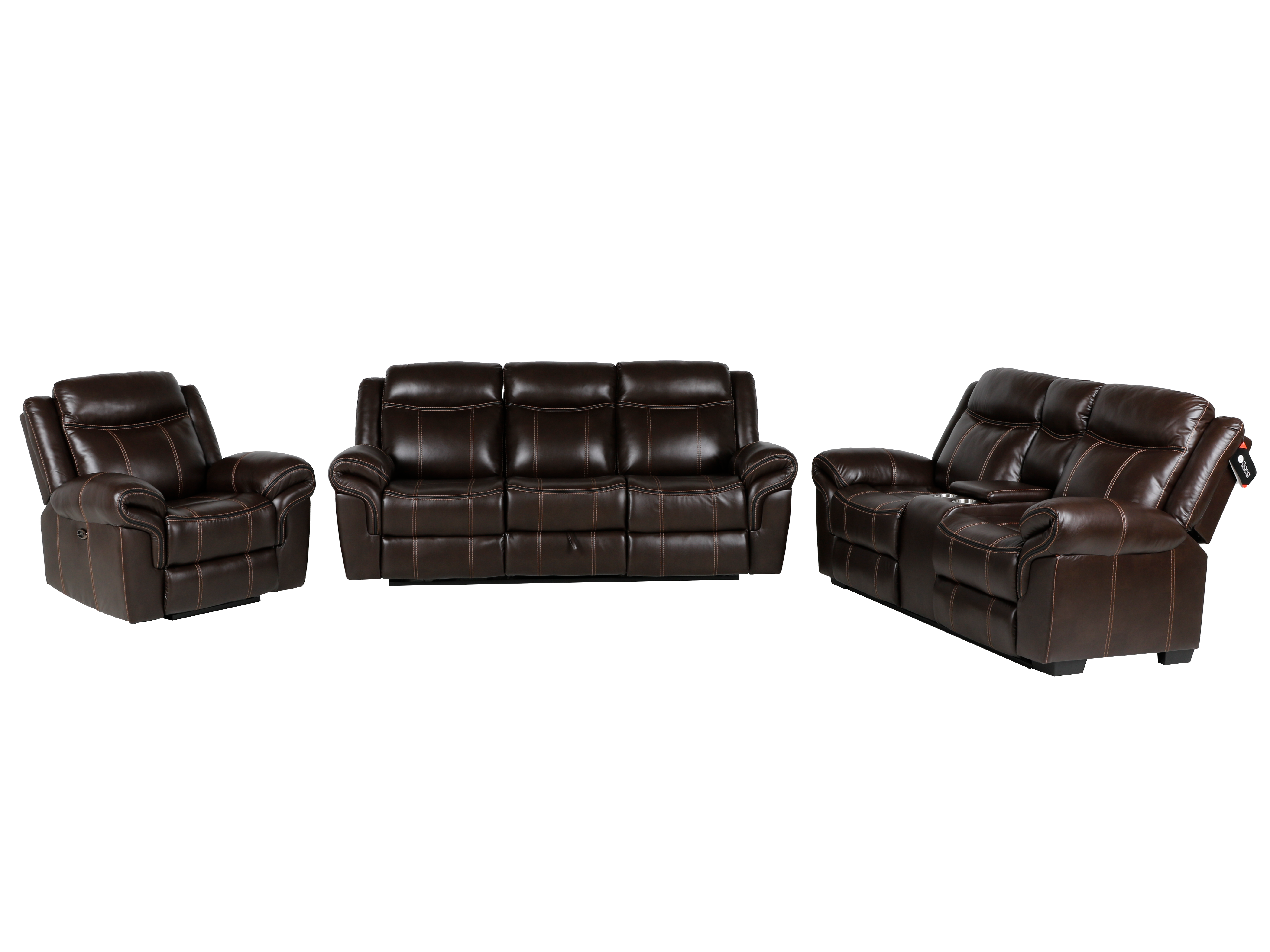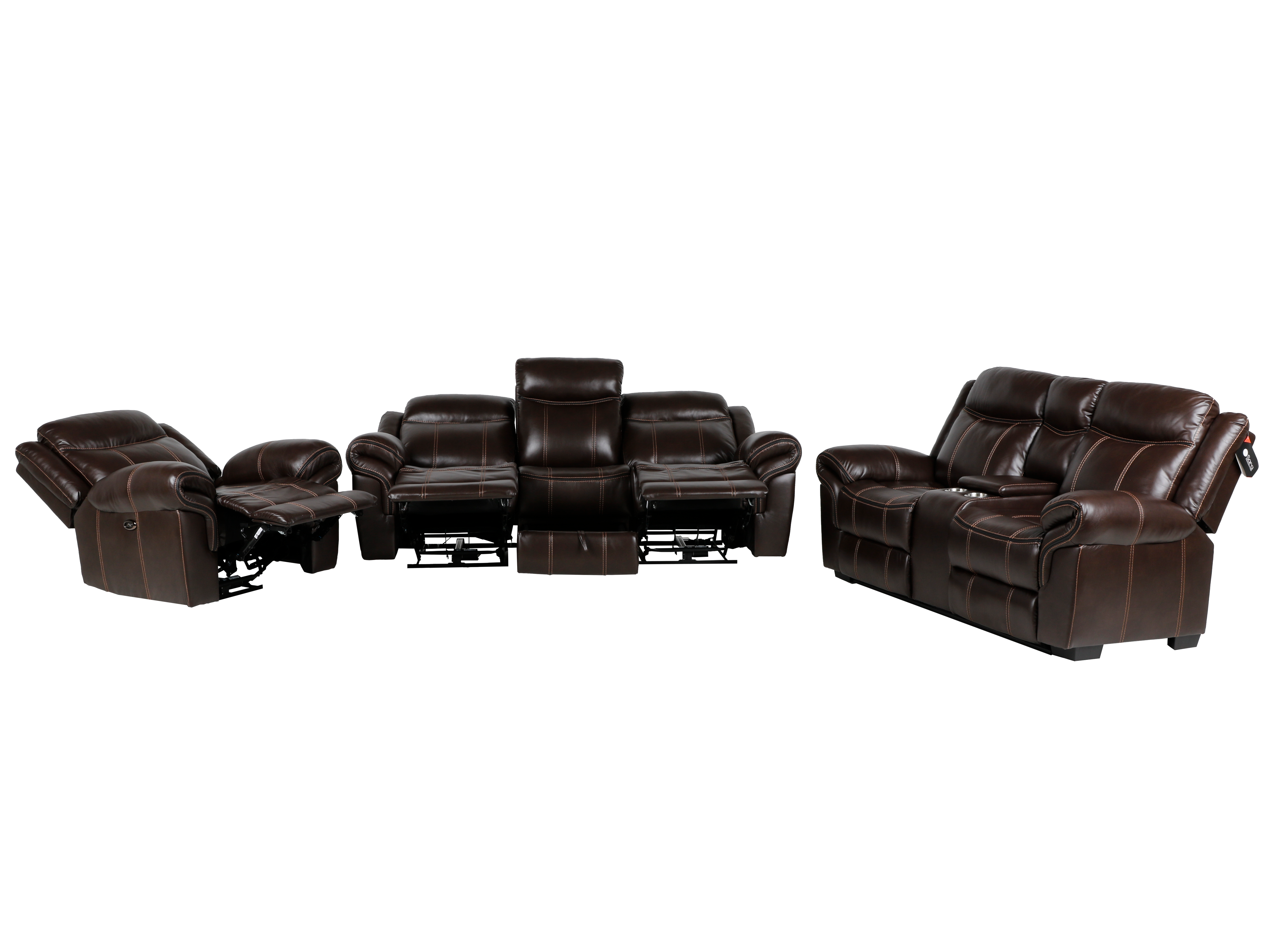 Includes: Power reclining sofa, Power reclining chair, Stationary loveseat.