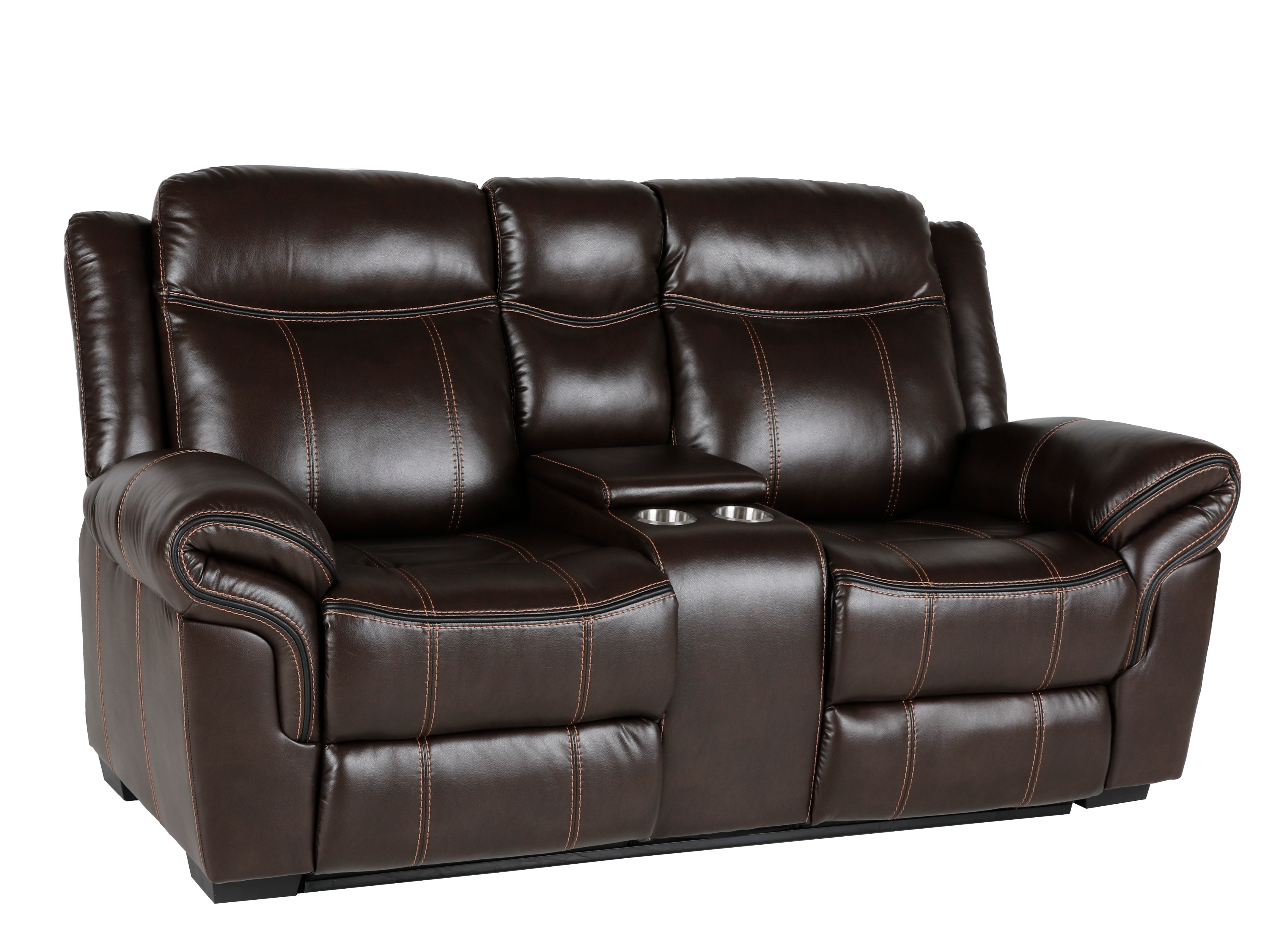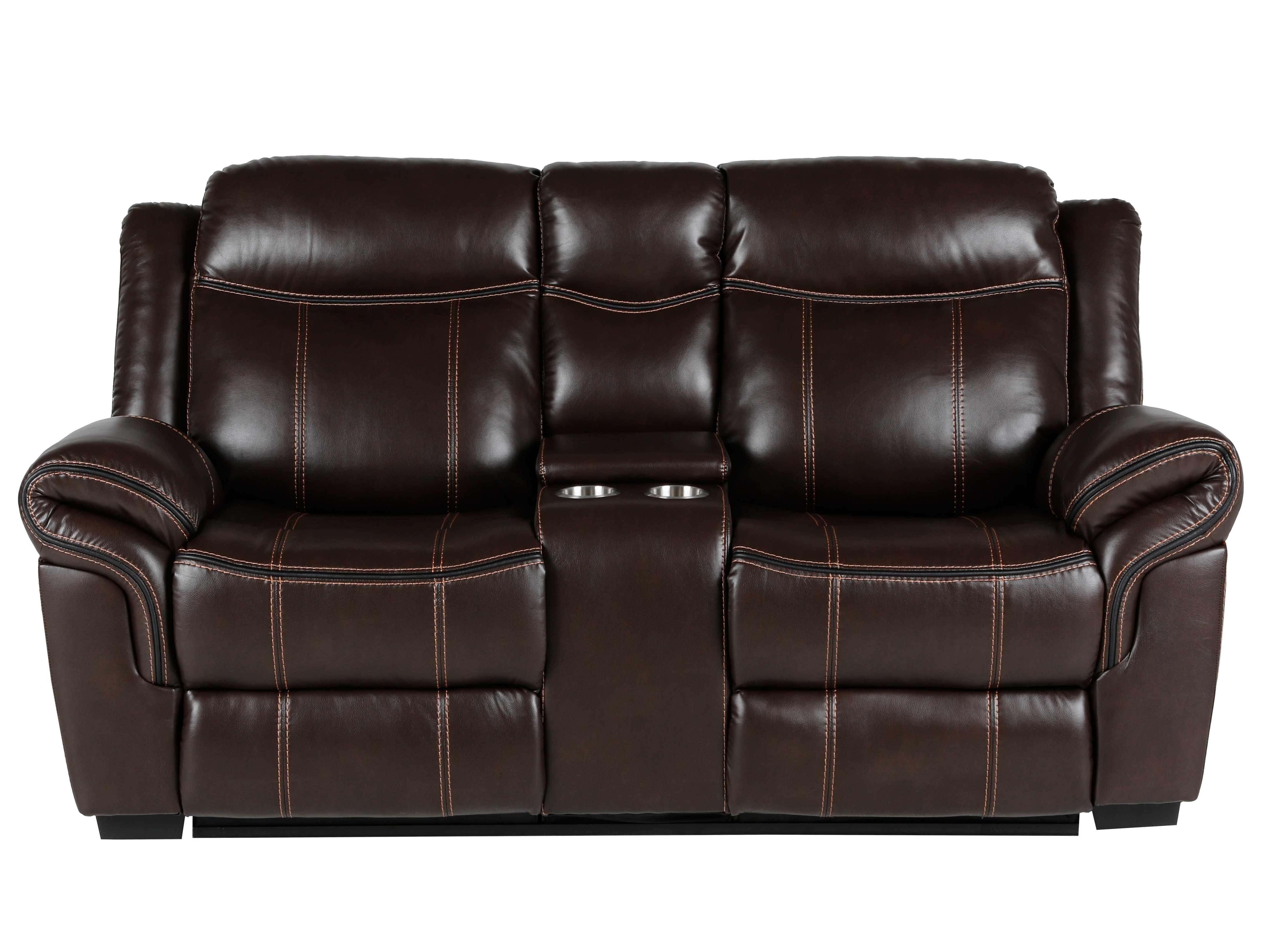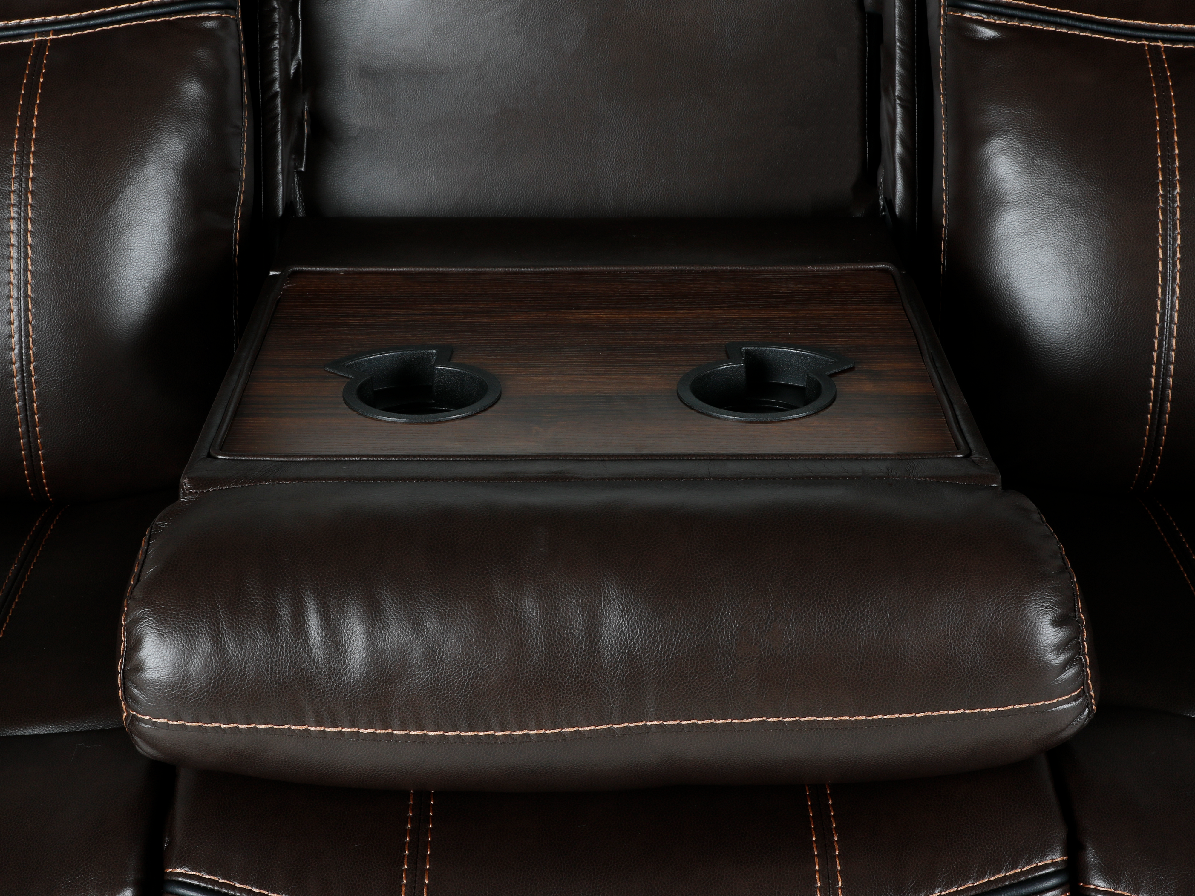 Yes. The loveseat features a center storage console with dual cup holders for remotes, snacks, and chargers.