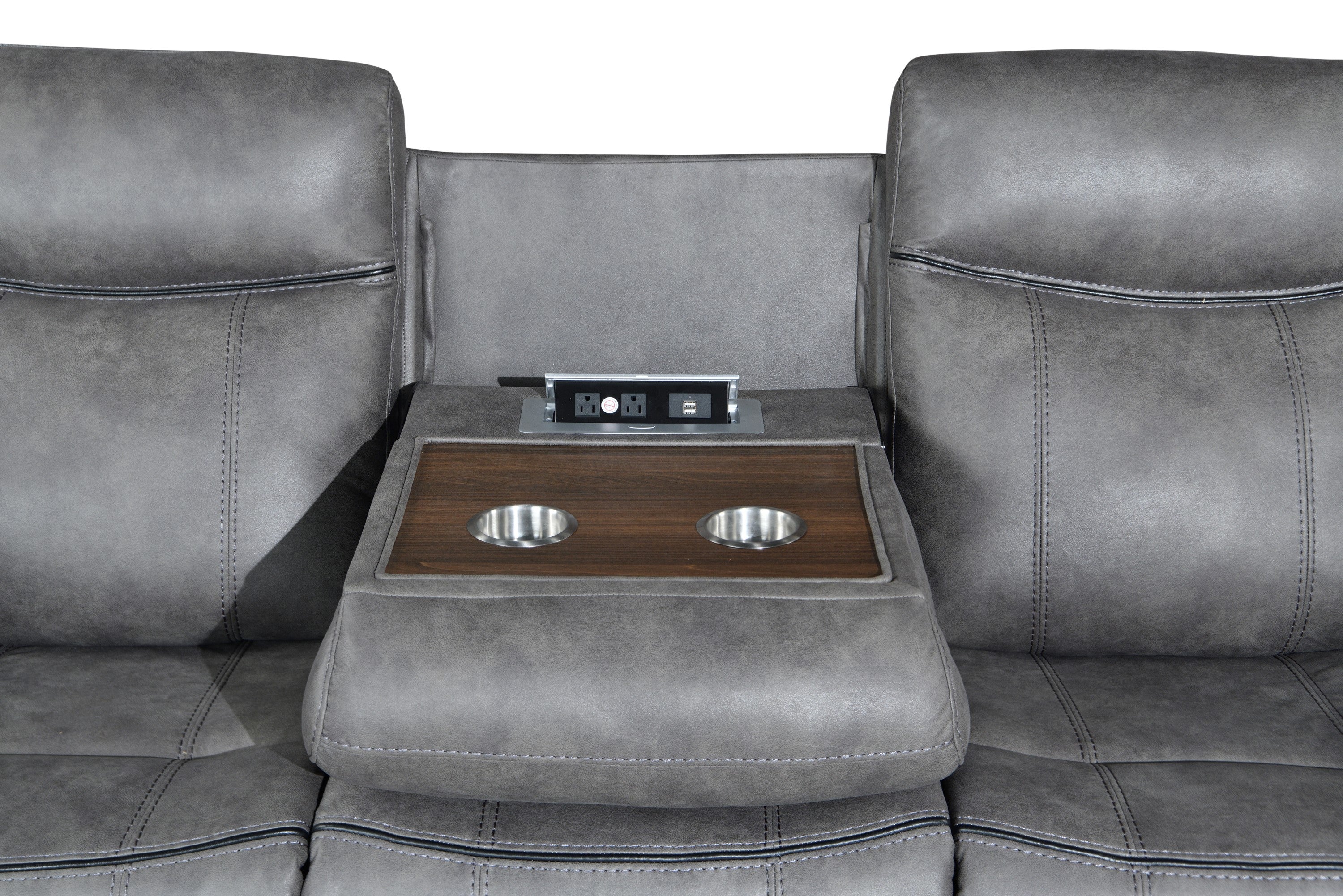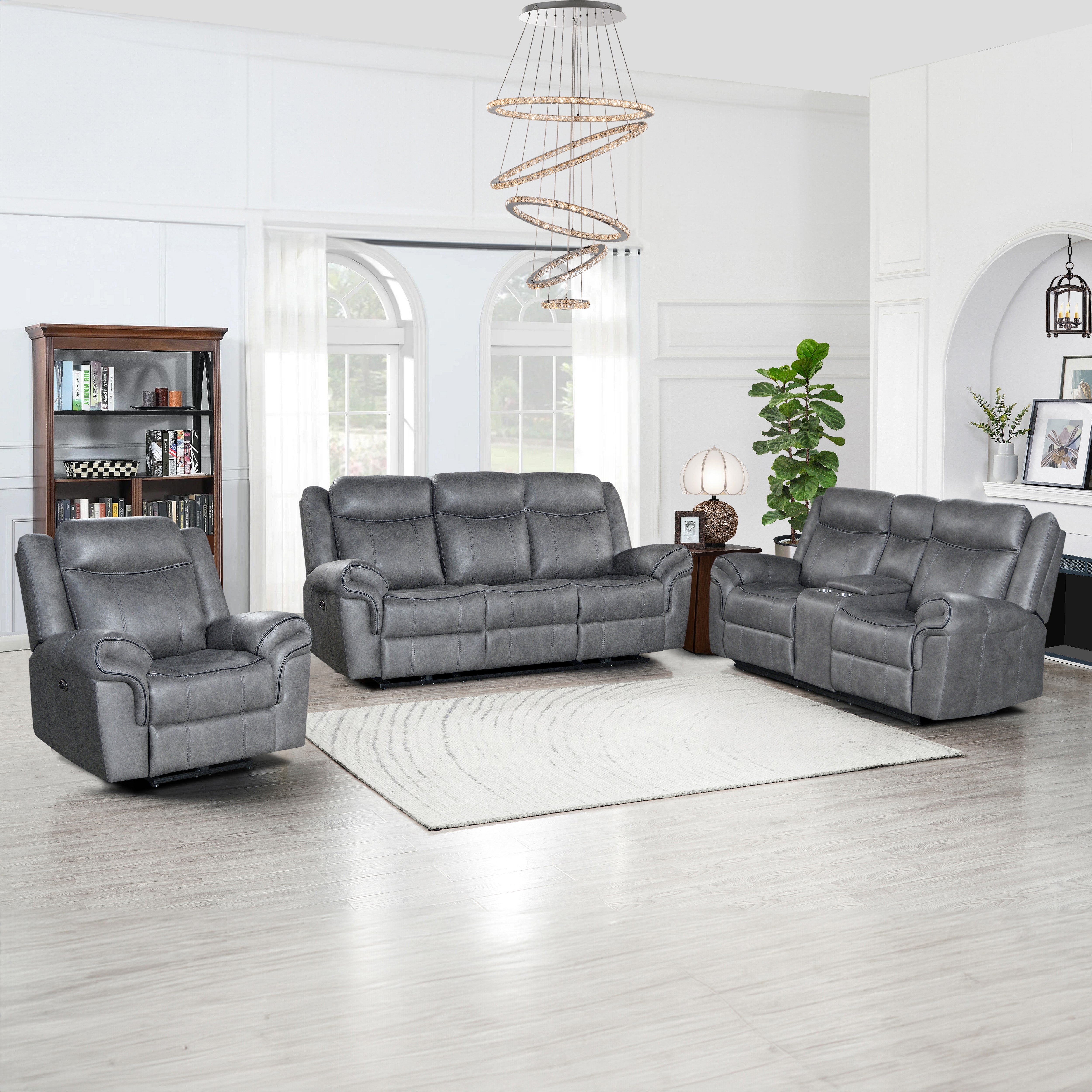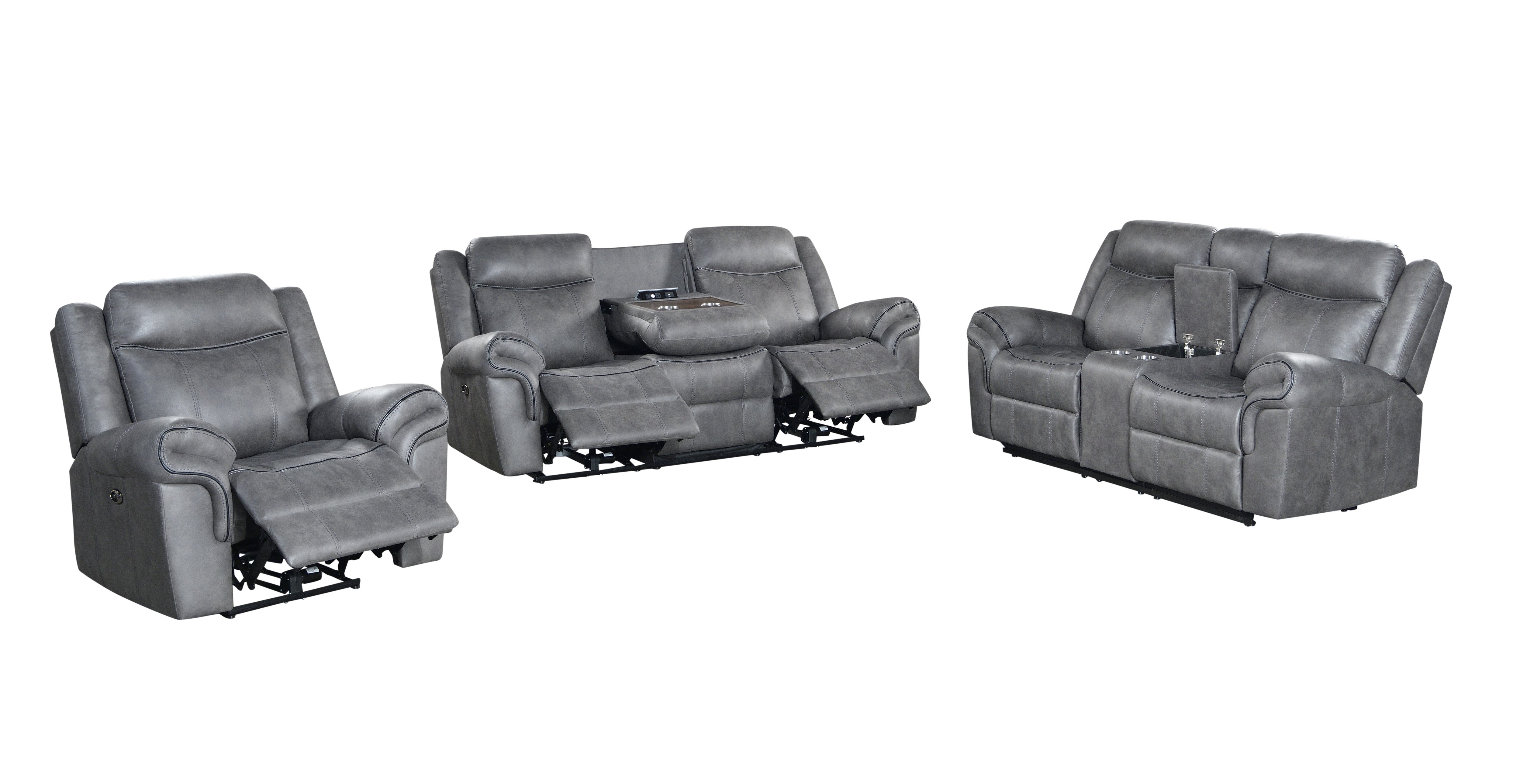 Upgrade your living room with our 3 Piece Power Reclining Living Room Set. Experience ultimate comfort with the power reclining sofa and chair, made with faux leather in a sleek Grey color. The thick foam design on the arms and tufted back cushions ensure maximum relaxation. Plus, the sofa's center drop down table with 2 cup holders, 2 USB ports, and a power outlet make it convenient to charge your devices. The loveseat does not have reclining function, but it offers storage and cup holders for added functionality. Elevate your lounging experience with this luxurious set.