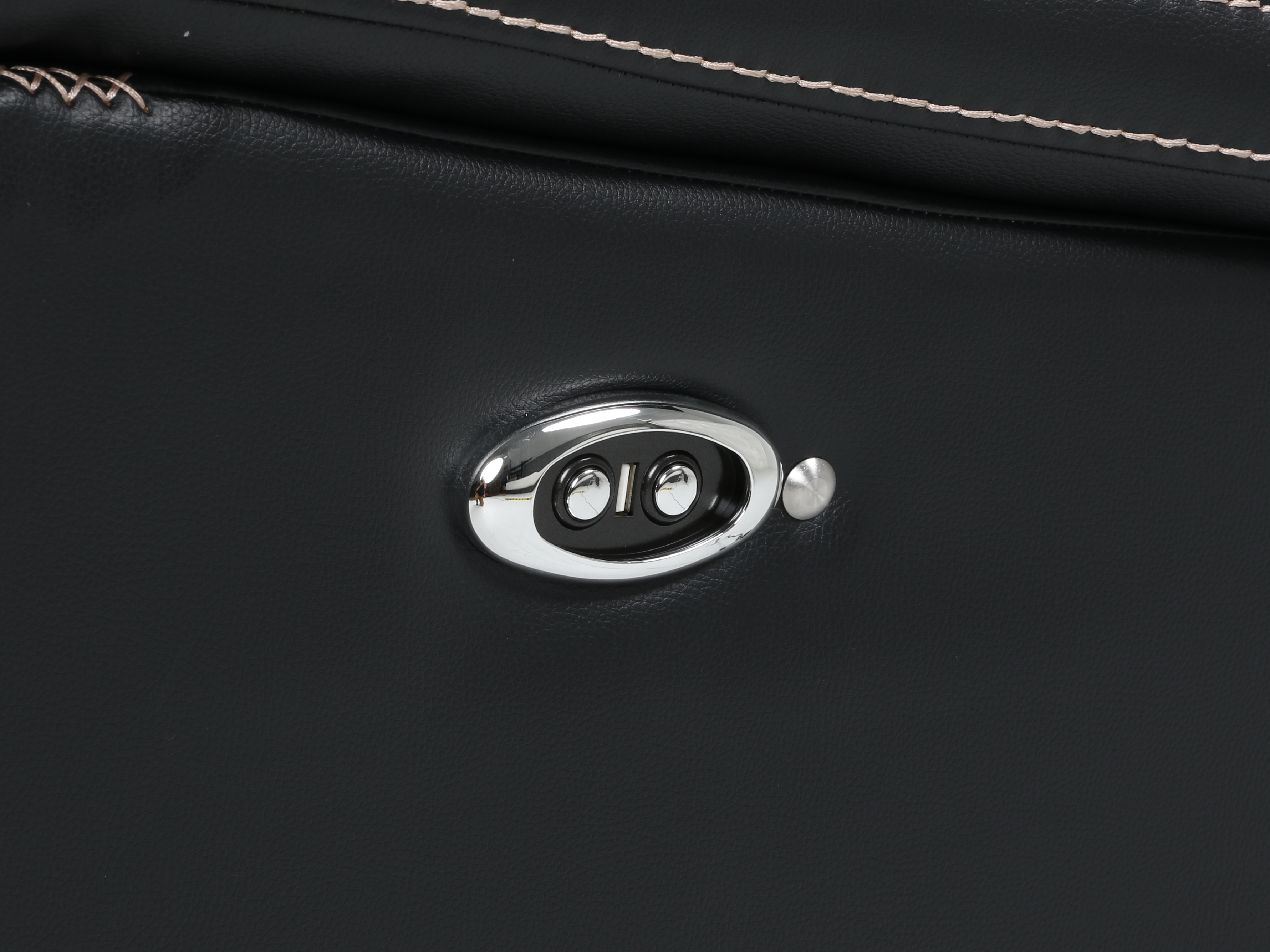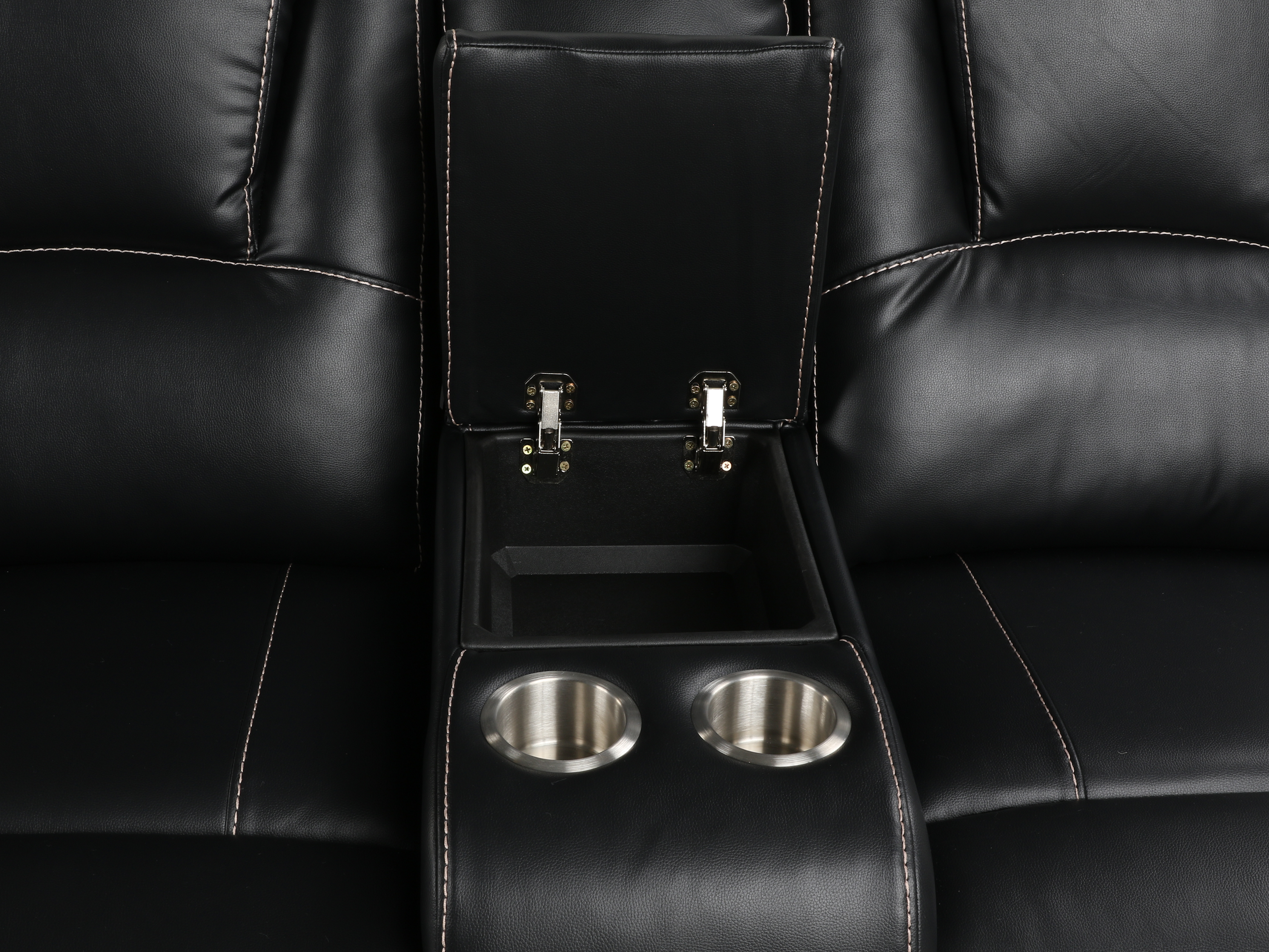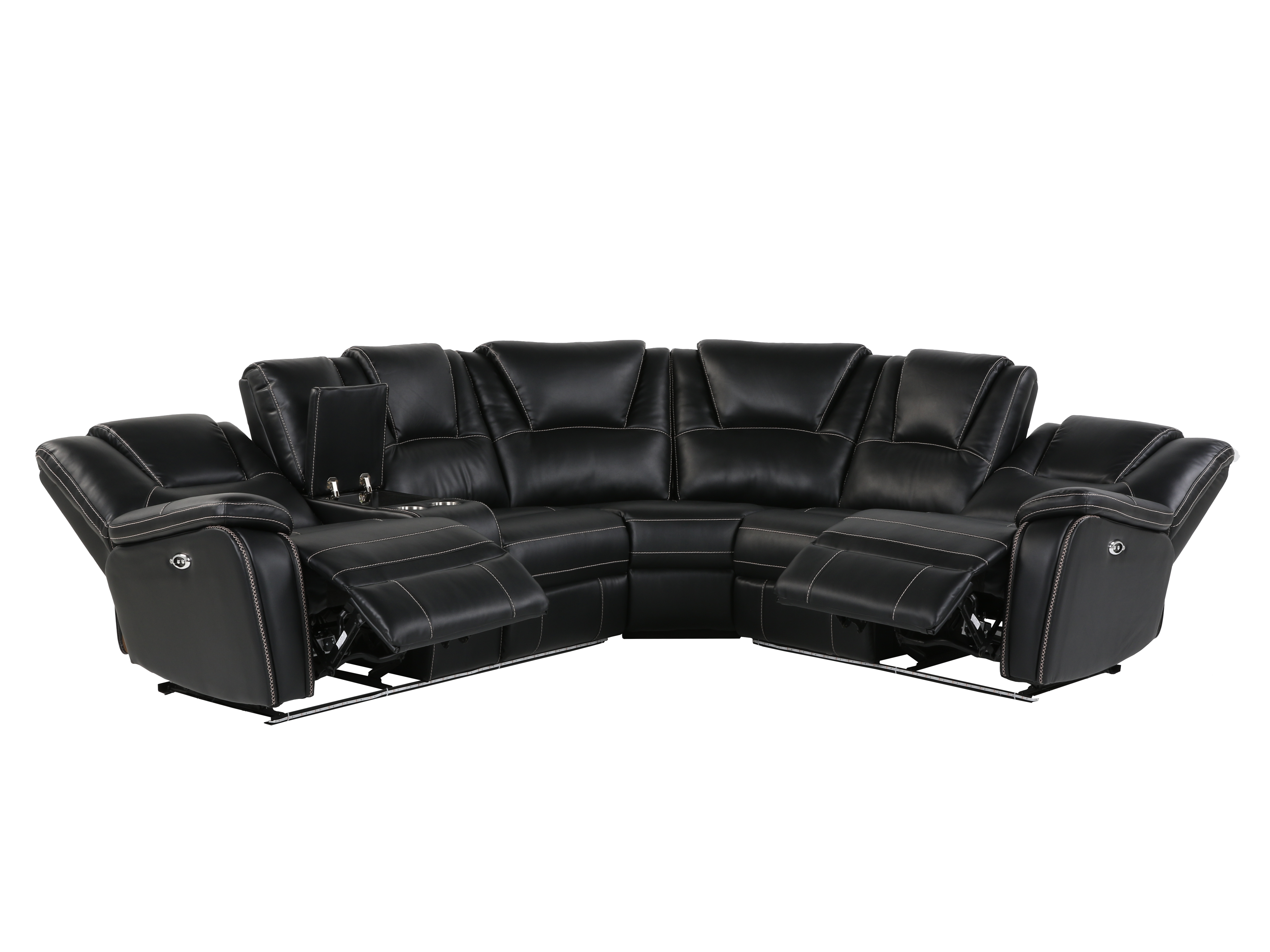 Complete your living room with our Power Reclining Sectional. This set includes a Power Recliner Loveseat with a left-arm-facing console and LED lights, a Power Recliner Loveseat with a right-arm-facing console and LED lights, and a wedge. The black faux leather fabric adds a sleek and stylish touch to your home. Relax in comfort and style with this power reclining sectional.
