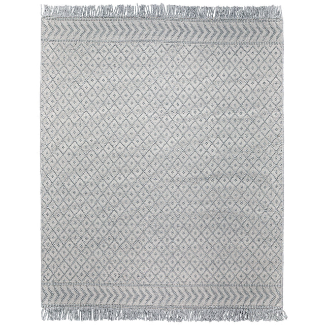 • Detailed with a geometric pattern in silver grey featuring a hand-knotted fringe