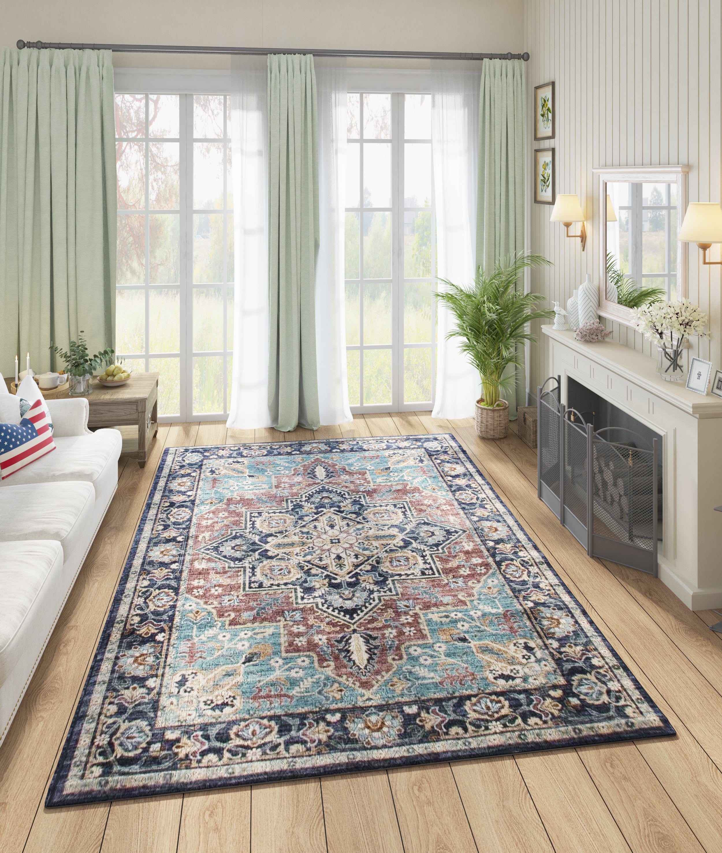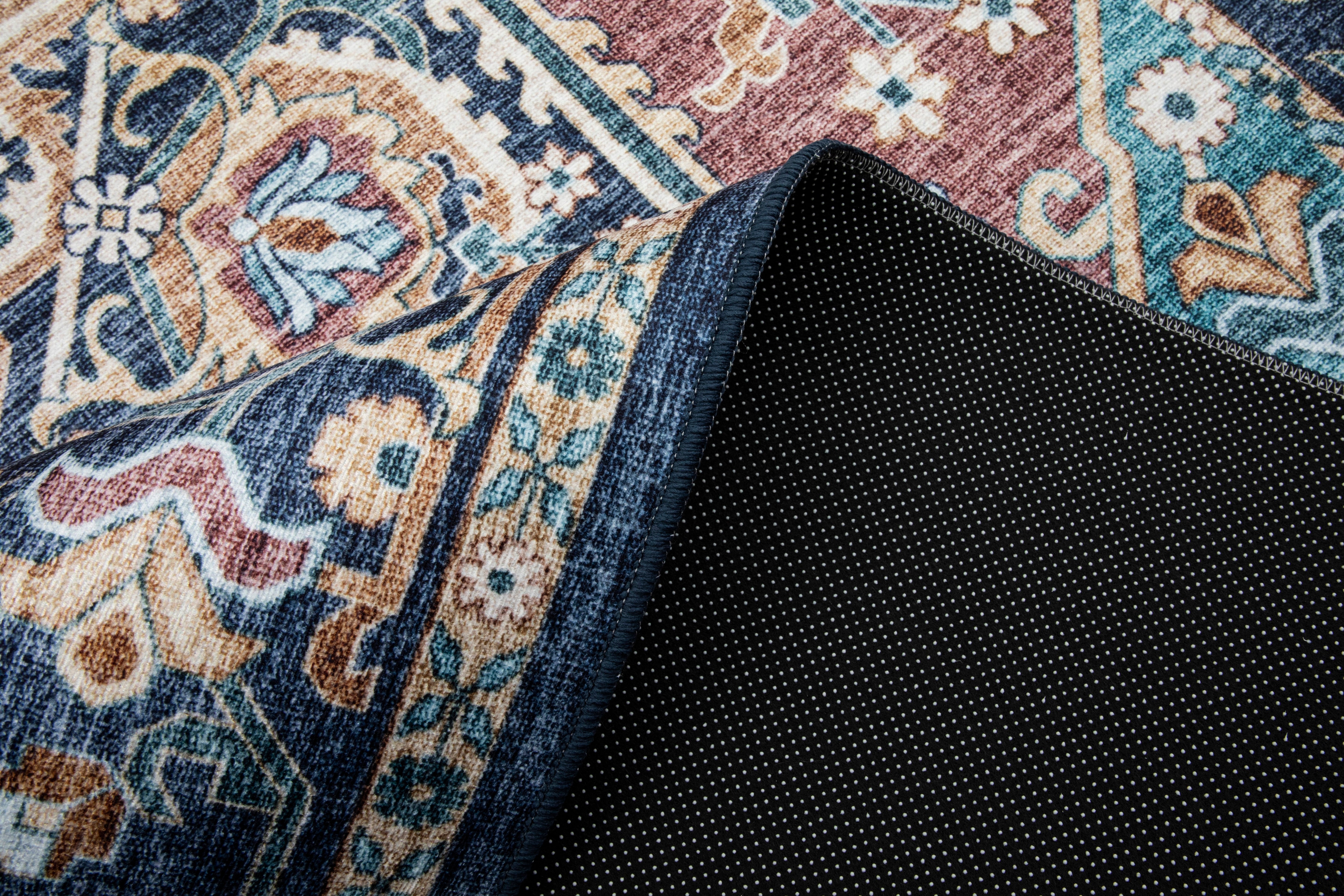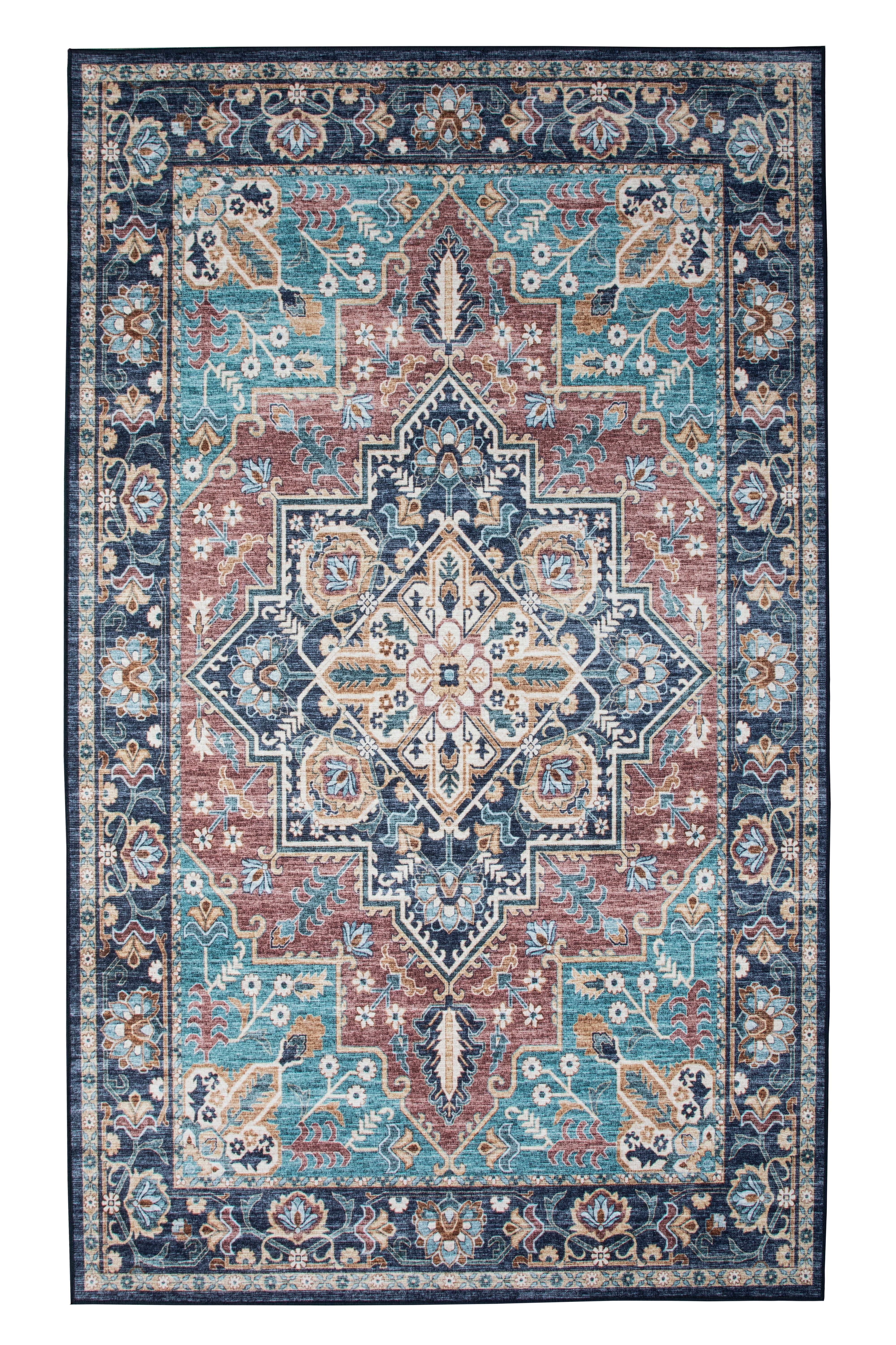 Enhance your home décor with this stunning traditional-inspired area rug, featuring an intricate medallion design in rich hues of blue, burgundy, and gold. Crafted with precision using power-loomed construction, this rug offers both beauty and durability. Its plush yet low-pile surface provides comfort underfoot, while the non-slip backing ensures safety by keeping it securely in place. Designed with families in mind, this rug is pet-friendly, kid-friendly, and washable for easy maintenance—making it a perfect addition to any living space, dining room, or bedroom.