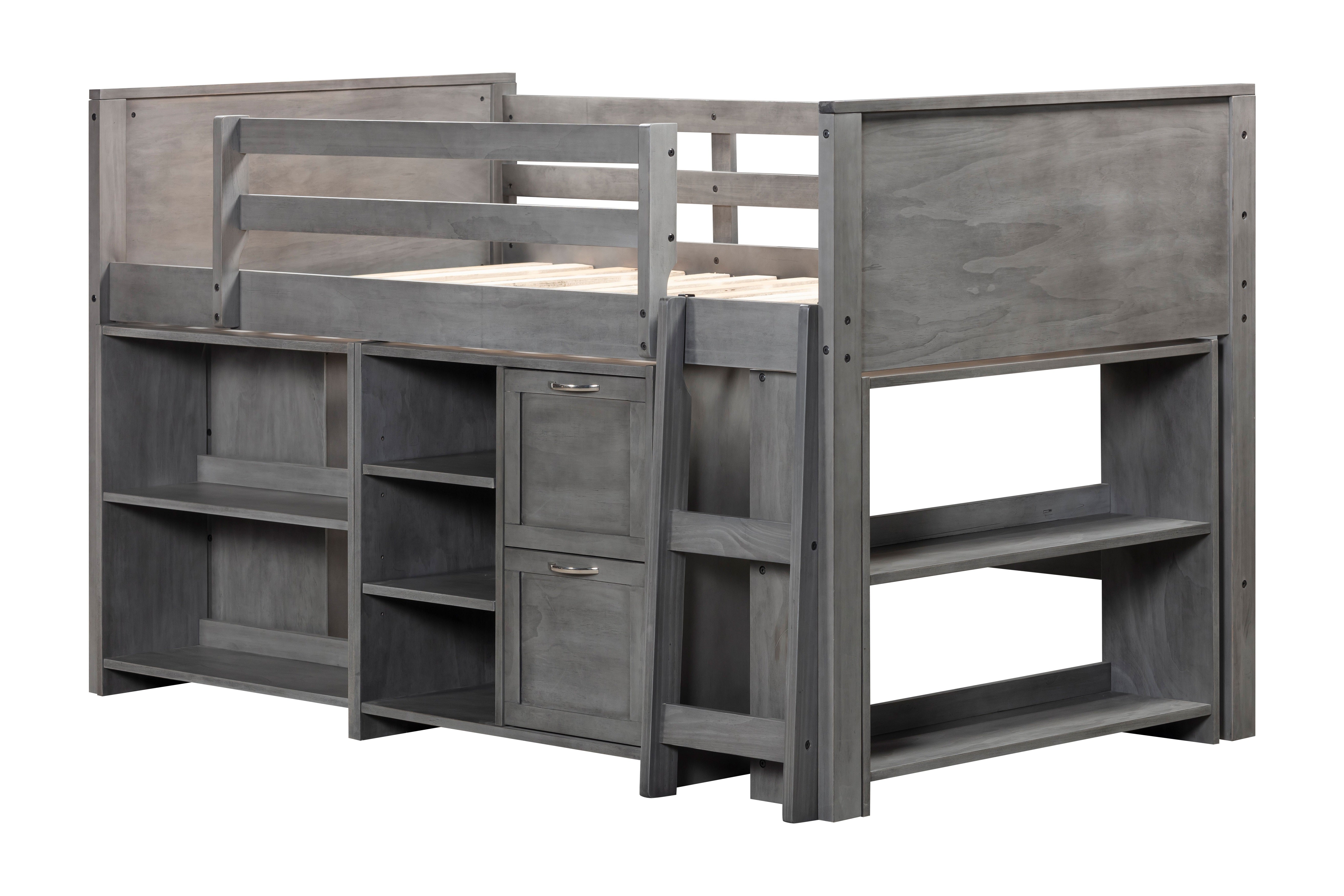 Maximize space and organization in your child's room with our 5-piece Twin Low Loft Storage Bed. This solid pine wood bed includes a twin-size bed on top and 3 large storage compartments underneath, perfect for blankets, clothes, and more. The timeless antique gray finish and included ladder make it functional and stylish. It meets ASTM standards and fits any standard twin mattress. Hardware and tools are included for easy assembly.