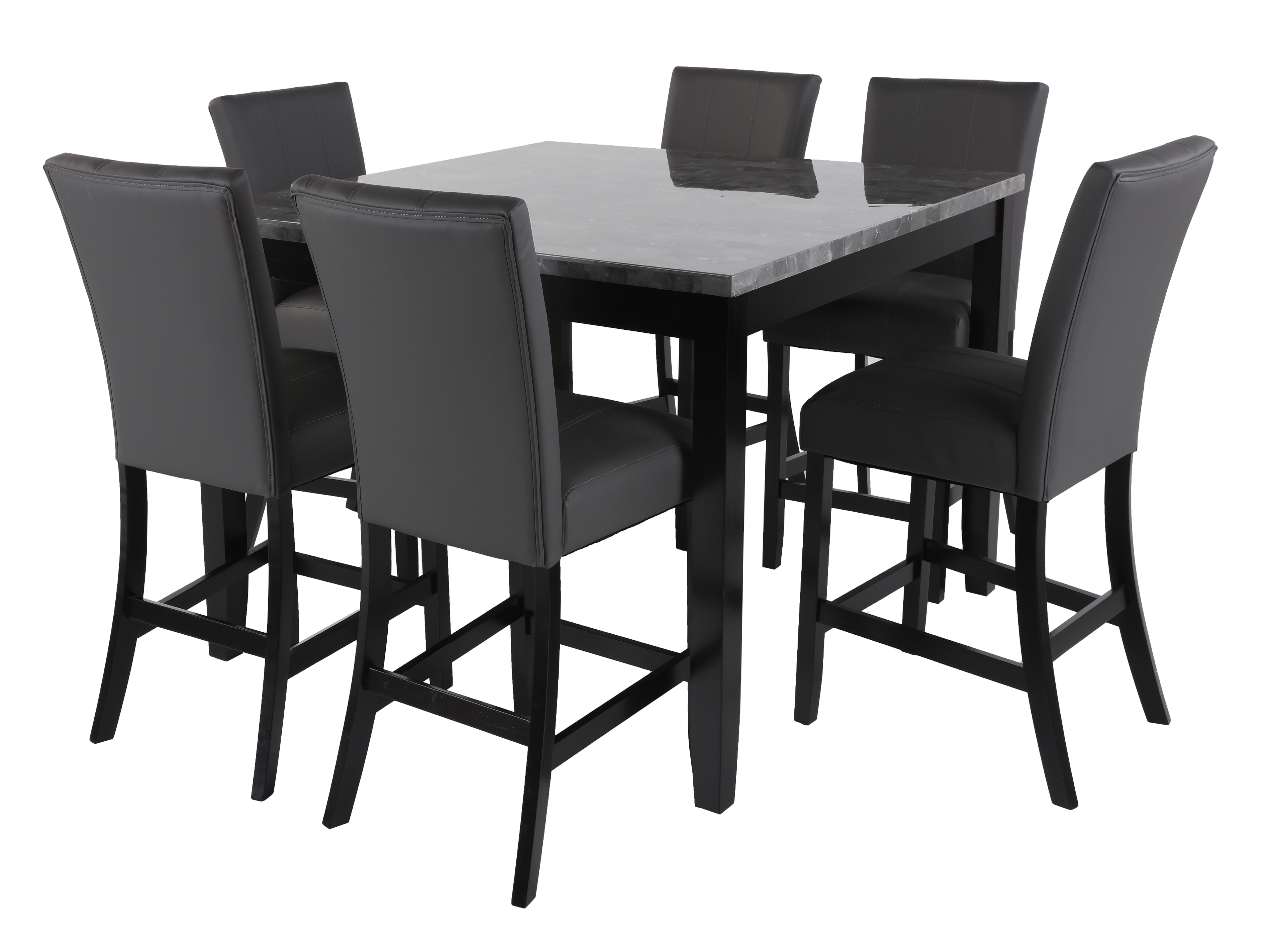 Gray Faux-Marble 7-Piece Counter-Height Dining Set – Black Base & Gray PU Chairs (54” Square)