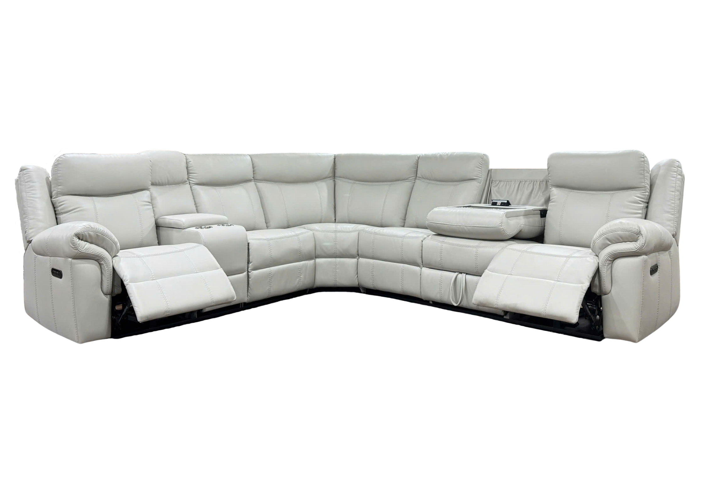 Movie nights, game days, and lazy Sunday naps — this 3-piece power reclining sectional handles all of them. Upholstered in bone-colored air leather with tonal contrast stitching, it seats up to six people across an L-shaped footprint that tucks neatly into a corner without swallowing the room. Both end seats recline at the touch of a button with independently adjustable power headrests, so everyone finds their perfect angle without negotiating.