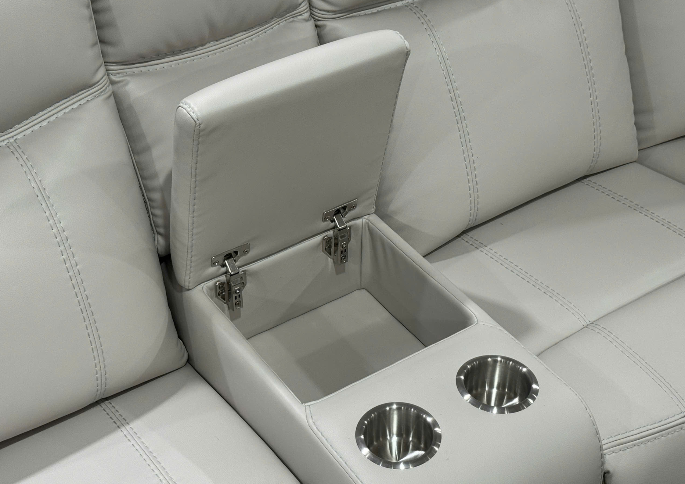 The LAF loveseat includes a lift-top storage console with two stainless steel cup holders — ideal for remotes, coasters, and drinks during movie night. The RAF sofa's drop-down table doubles as a second console with its own pair of cup holders when folded down, or sits flush with the backrest when you need the full seating surface.