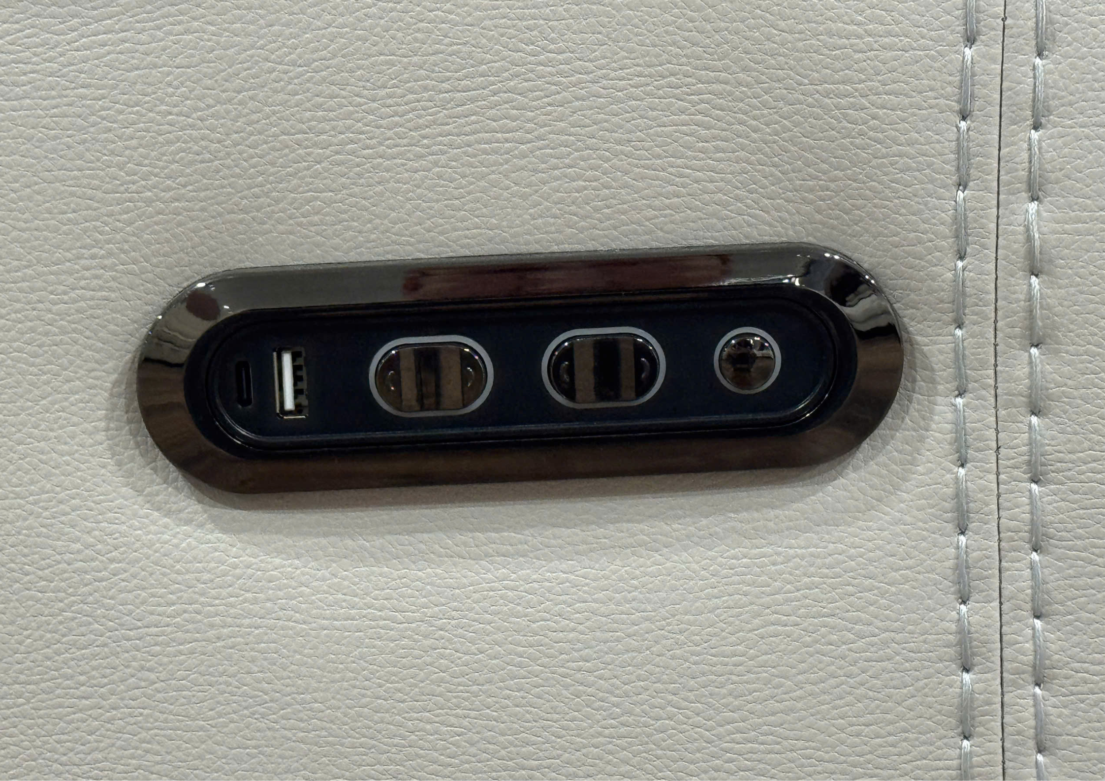The RAF sofa's drop-down table includes a wireless charging pad, two AC power outlets, and USB ports. The arms also feature integrated USB and charging ports. You can charge phones, tablets, and laptops without any extension cords.