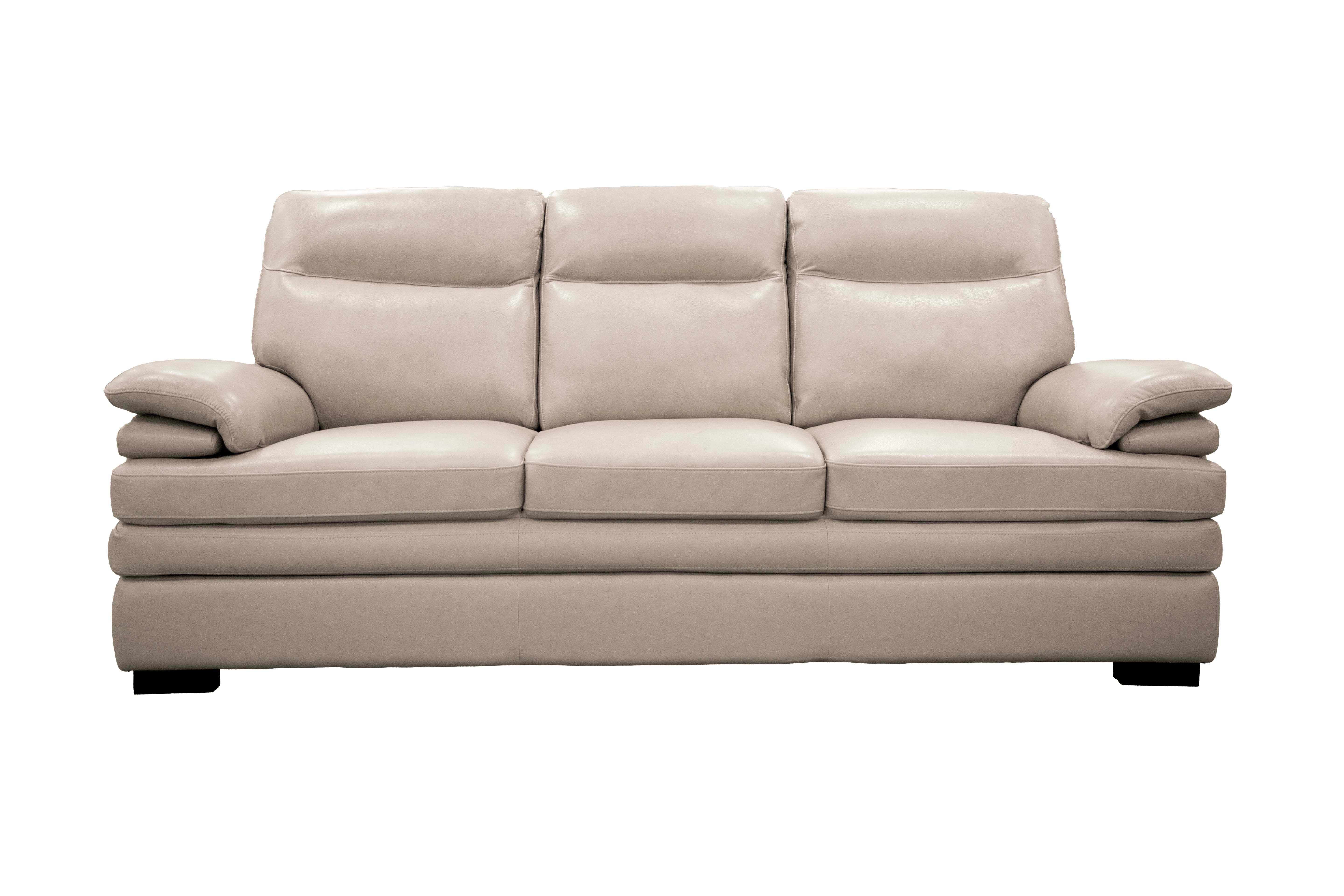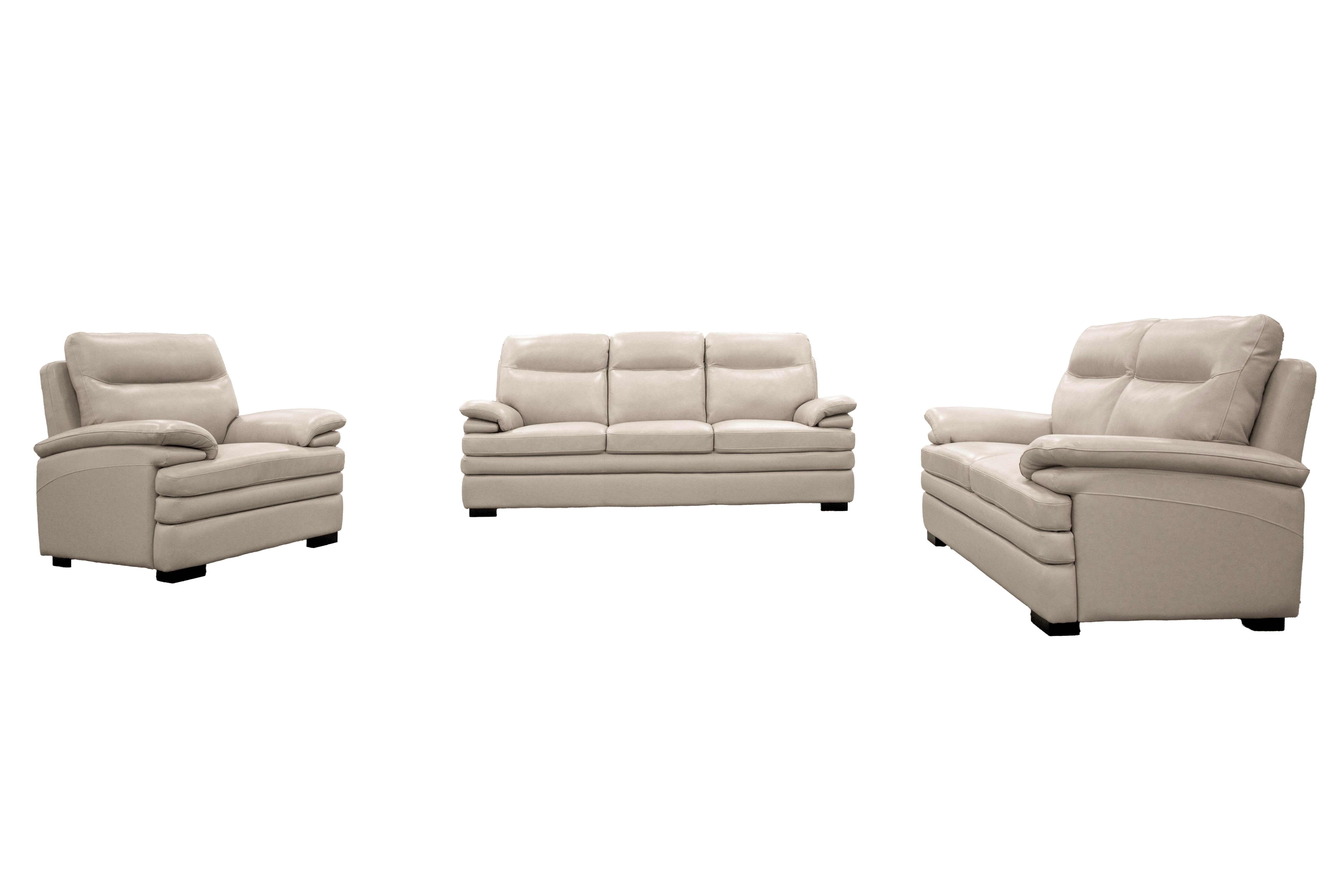 Create a calm, inviting living room with this elegant 3-piece living room set in a soft light beige color. Including a sofa, loveseat, and chair, this set brings together modern comfort and timeless style for everyday living. The smooth leather upholstery, plush cushions, and generously padded arms offer a cozy place to relax while giving your space a clean and refined look.