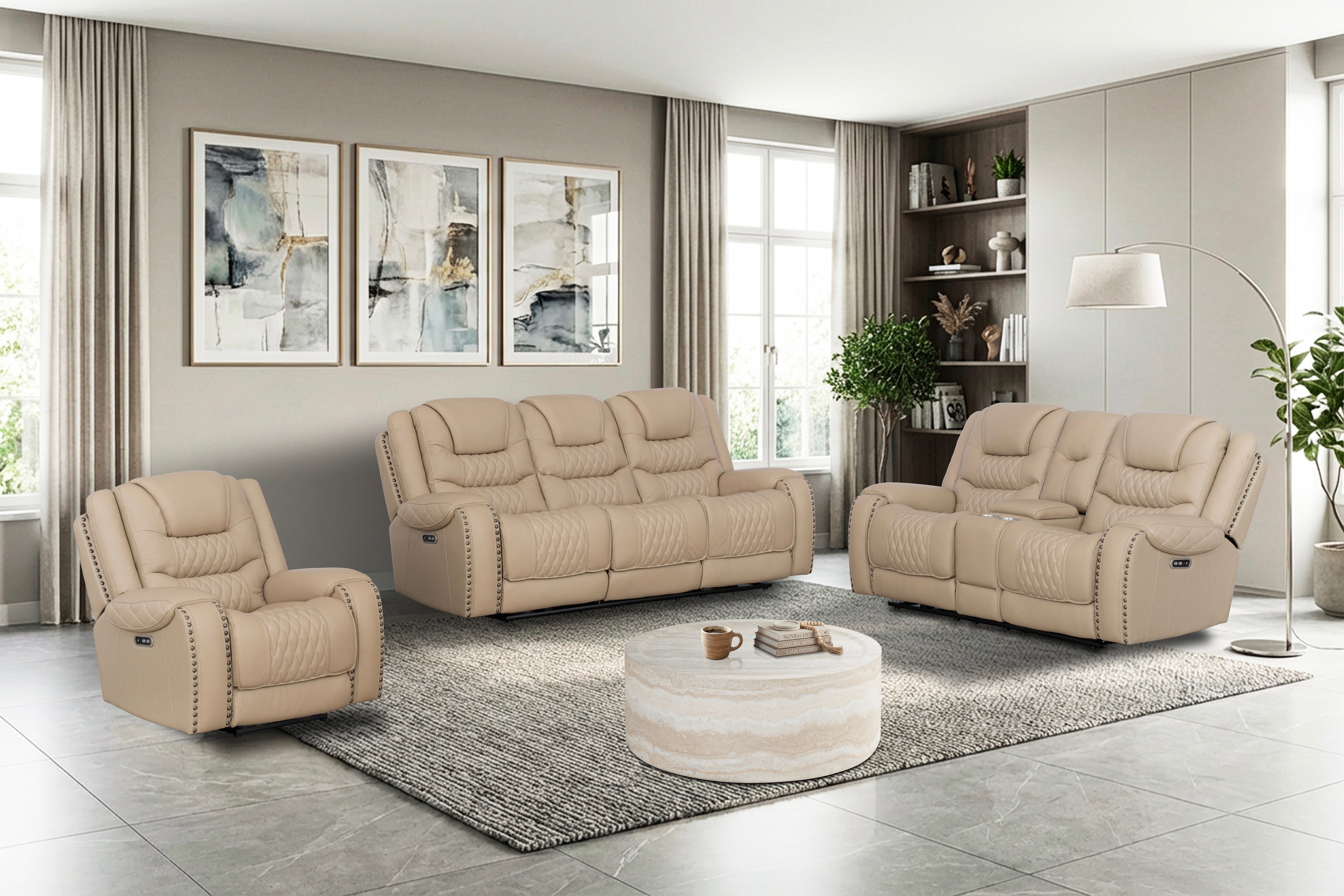This 3-piece set includes a dual power reclining sofa, a dual power reclining loveseat with console, and a dual power reclining chair.