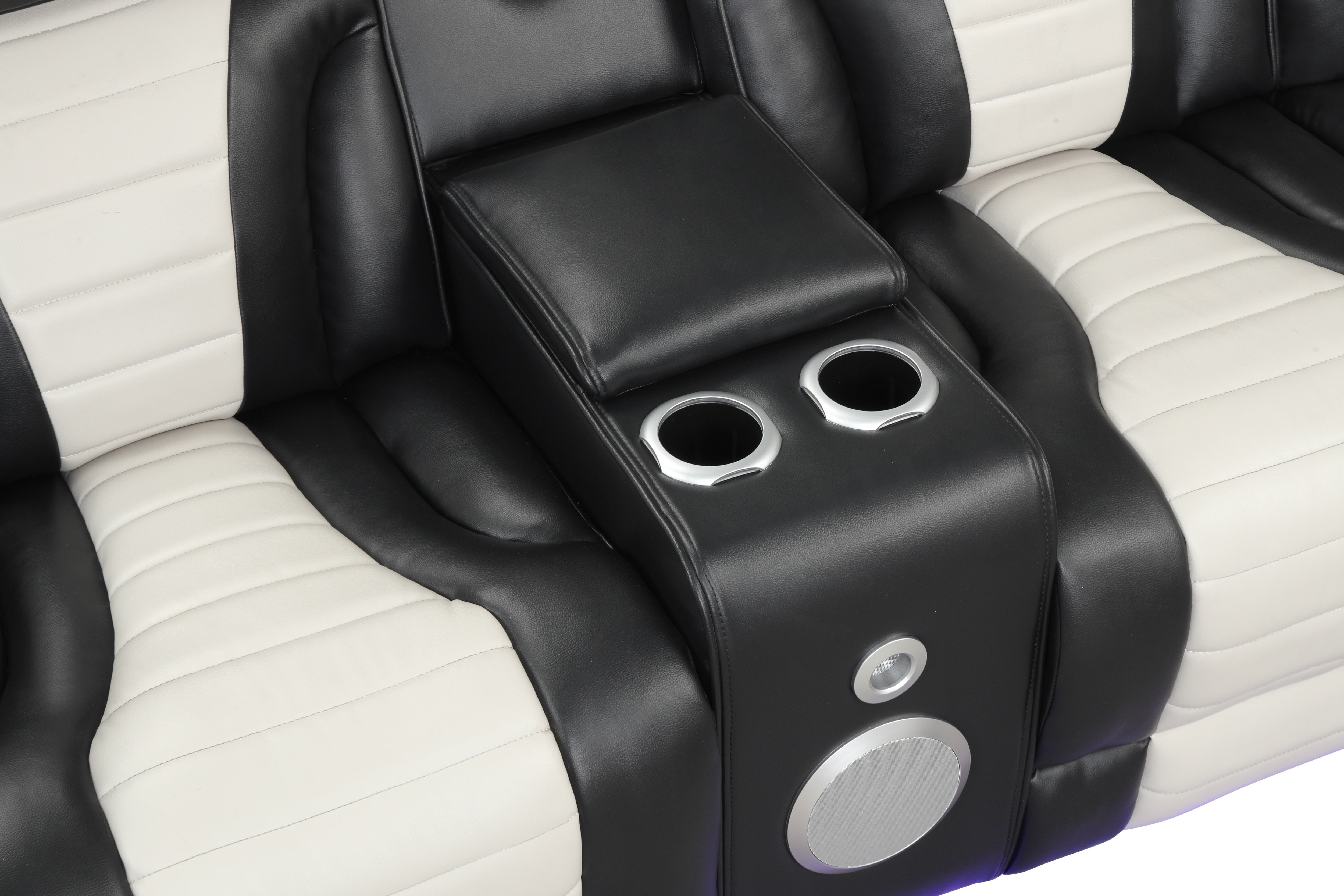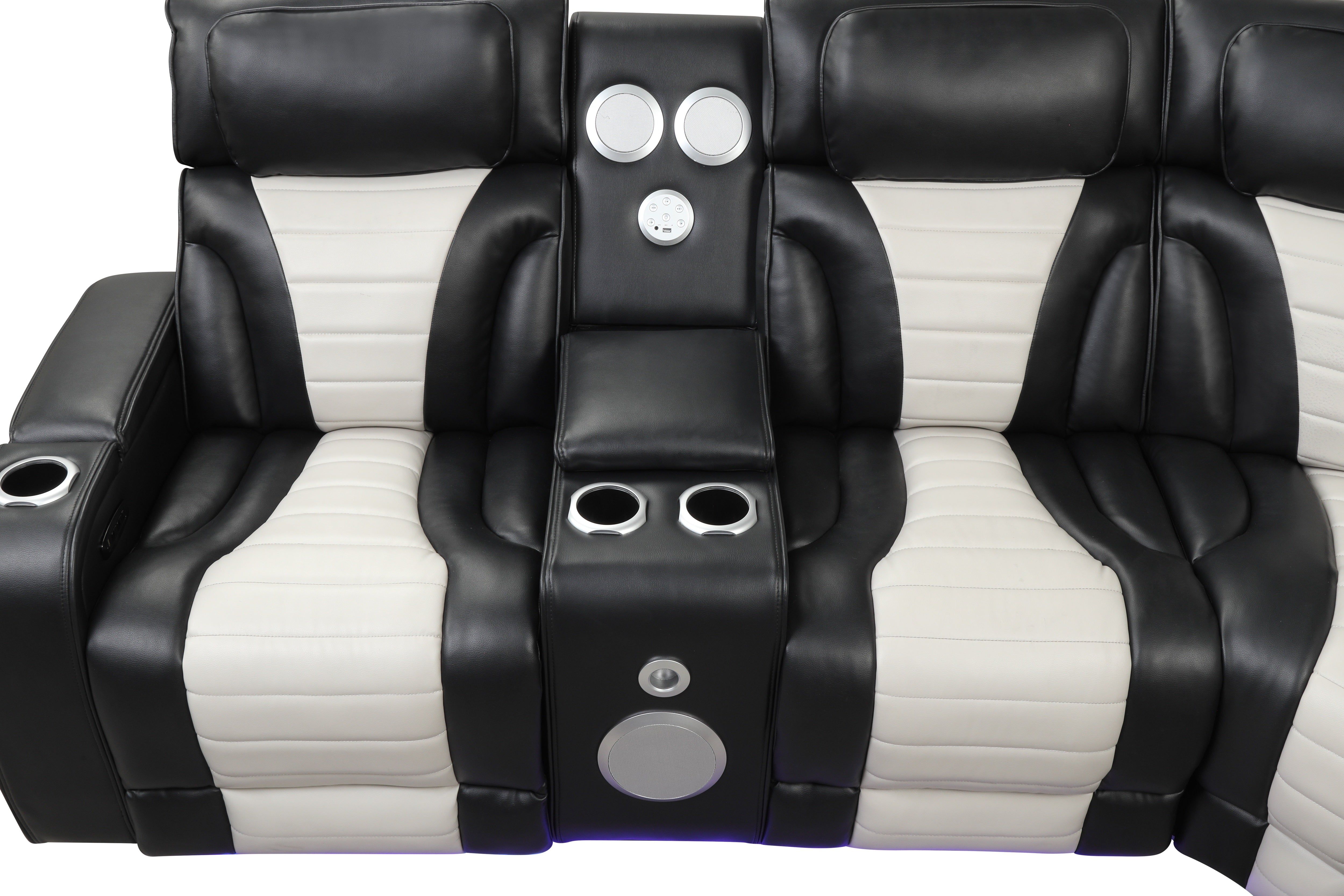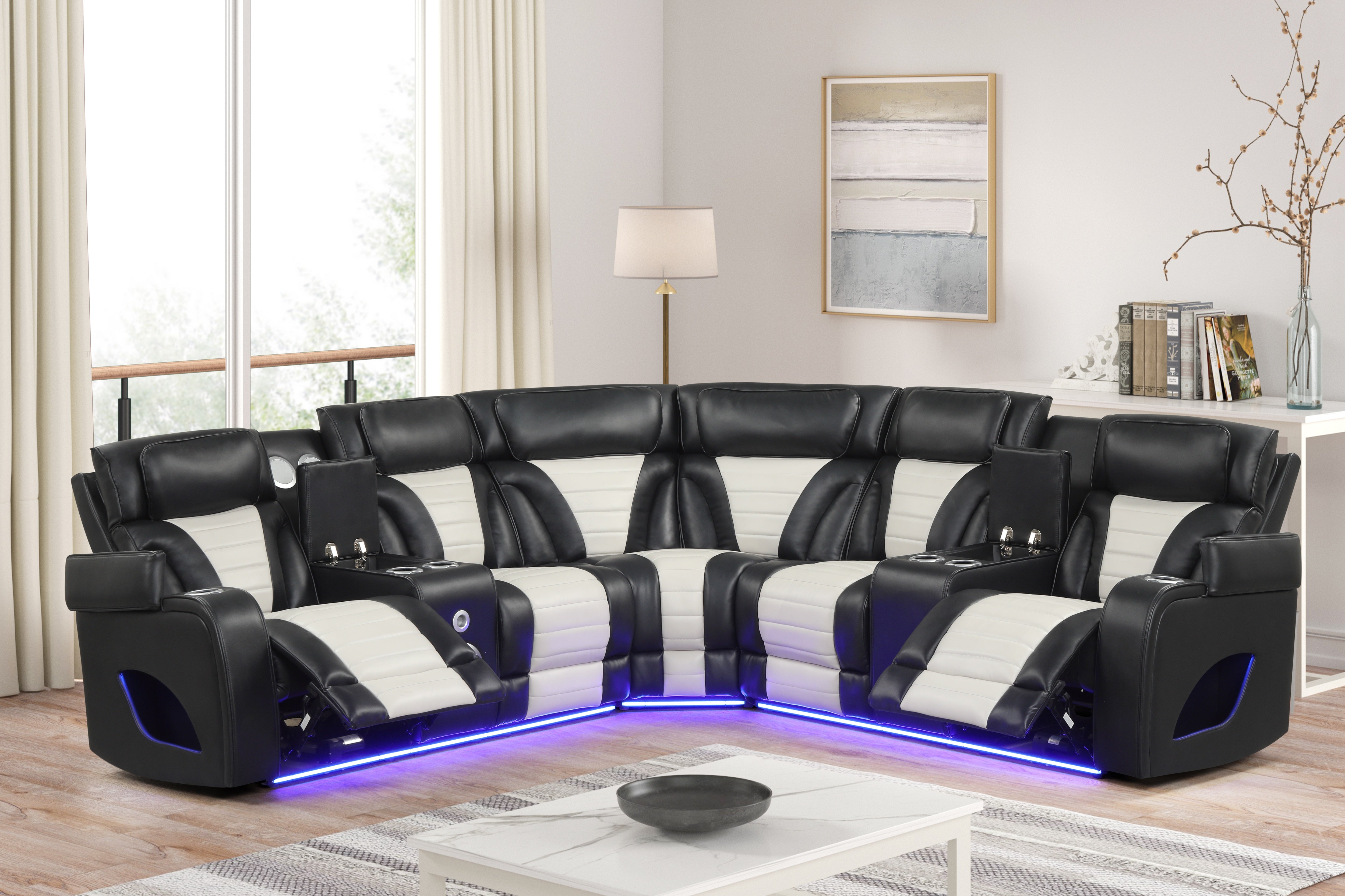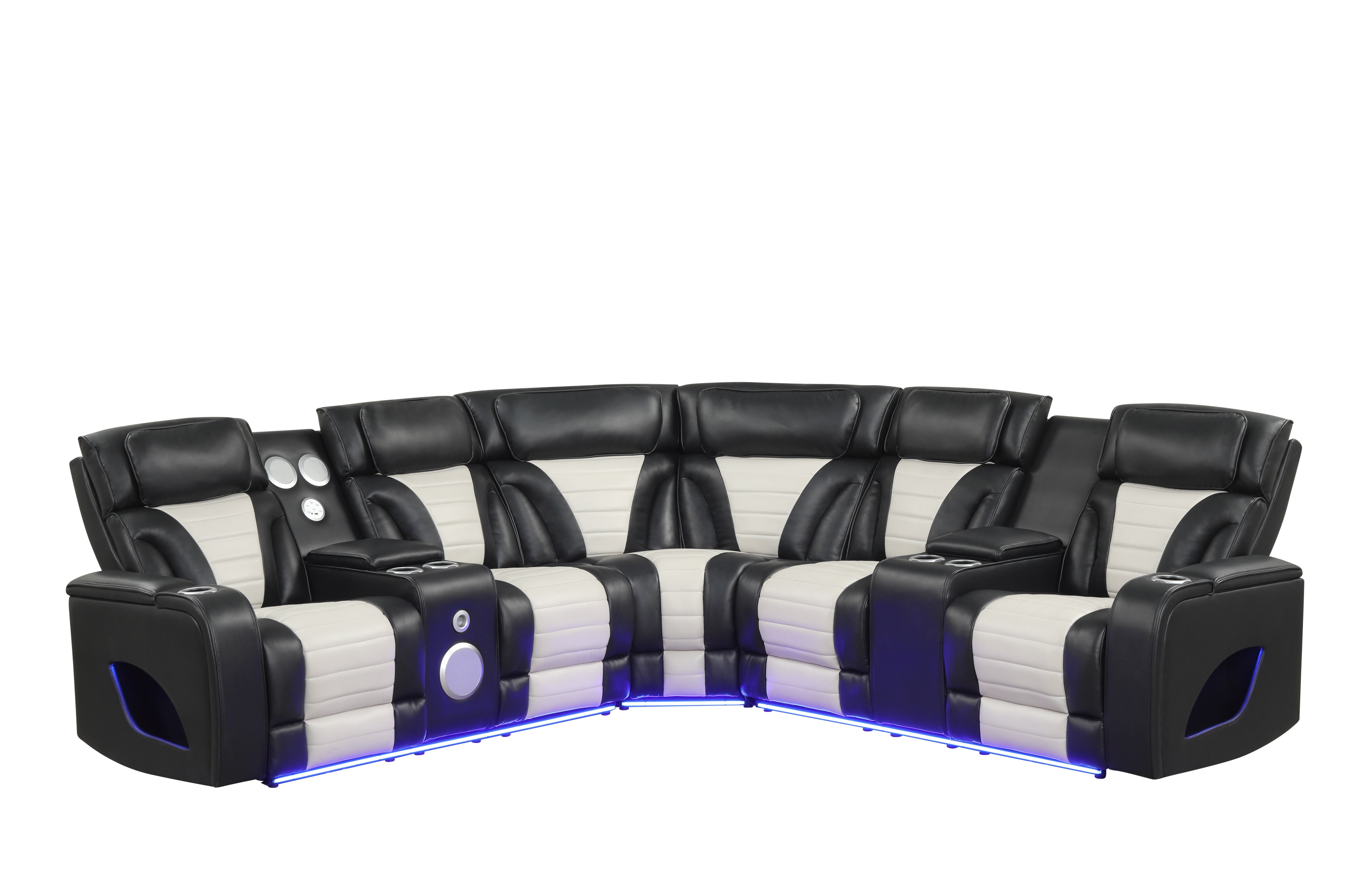 Built for hosting, it includes multiple cup holders, USB charging, and a center speaker console with integrated sound controls—so snacks, drinks, and devices stay within easy reach. The LED base lighting adds a cool, cinematic glow that instantly upgrades your living room vibe.