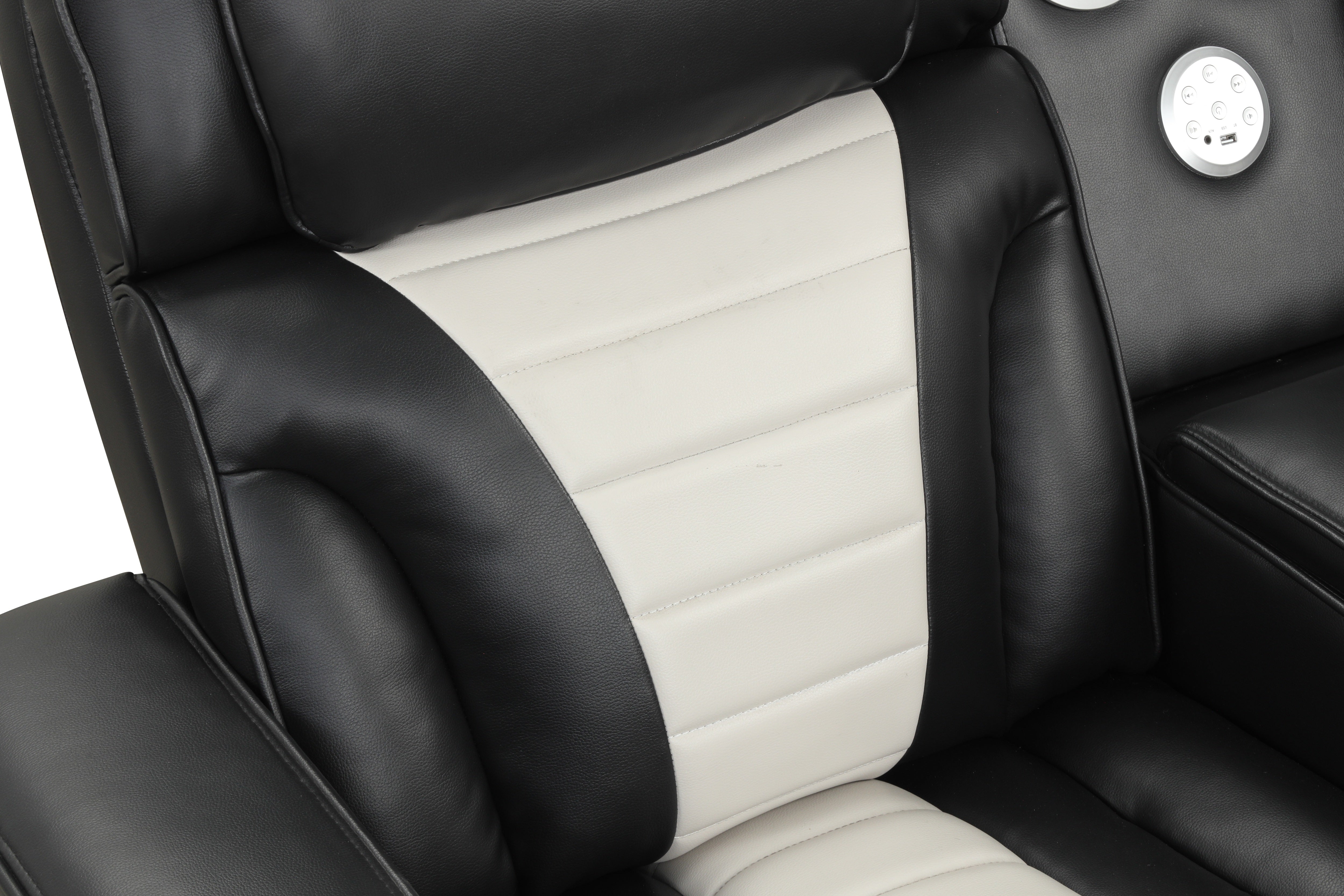 Bring the full theater experience home with the curved home theater sectional, designed for next-level comfort and entertainment. Upholstered in a bold black-and-white two-tone finish, this statement piece features plush, race-inspired channeling and supportive, high-back seating that keeps everyone comfortable through movie marathons, game days, and late-night streaming.