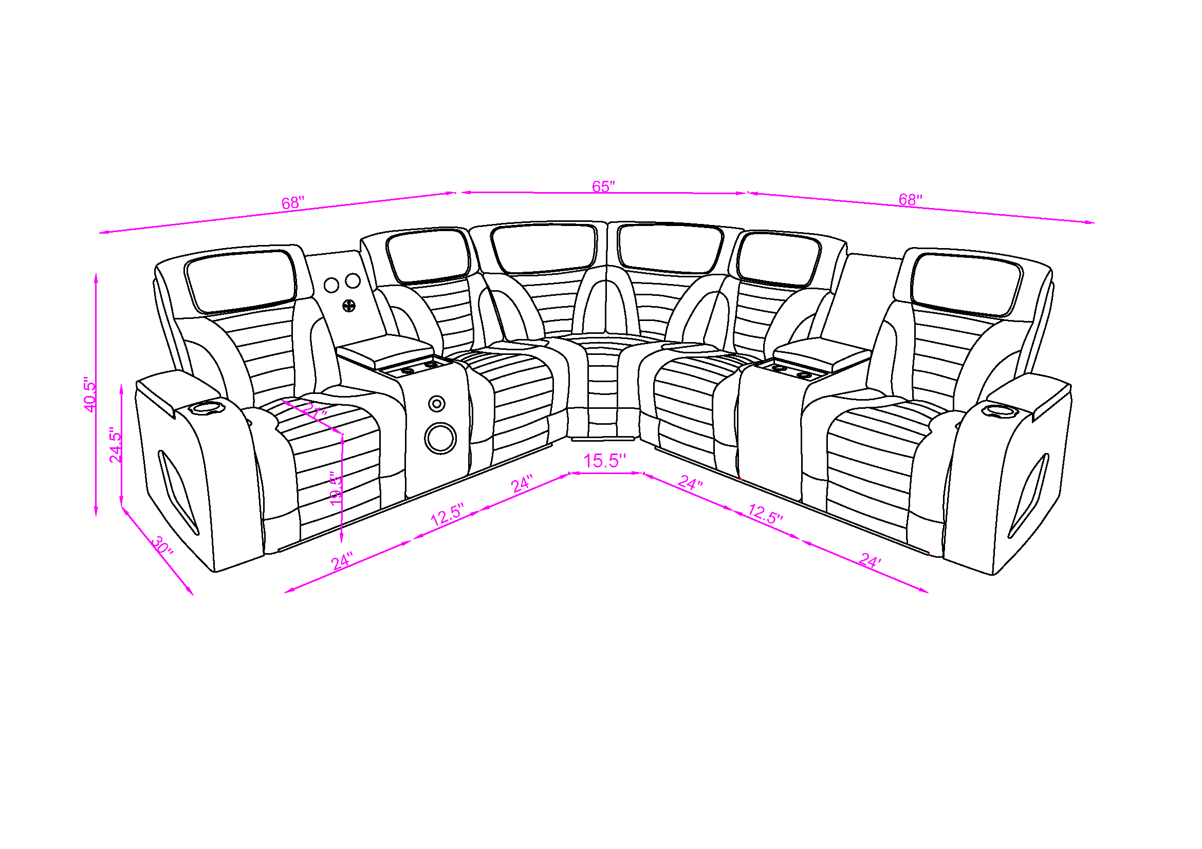 Overall back height is 40.5 inches, depth is 30 inches, seat height is 19.5 inches, seat depth is 21 inches, and arm height is 24.5 inches. The overall curved span is 68 inches (left) + 65 inches (center) + 68 inches (right).