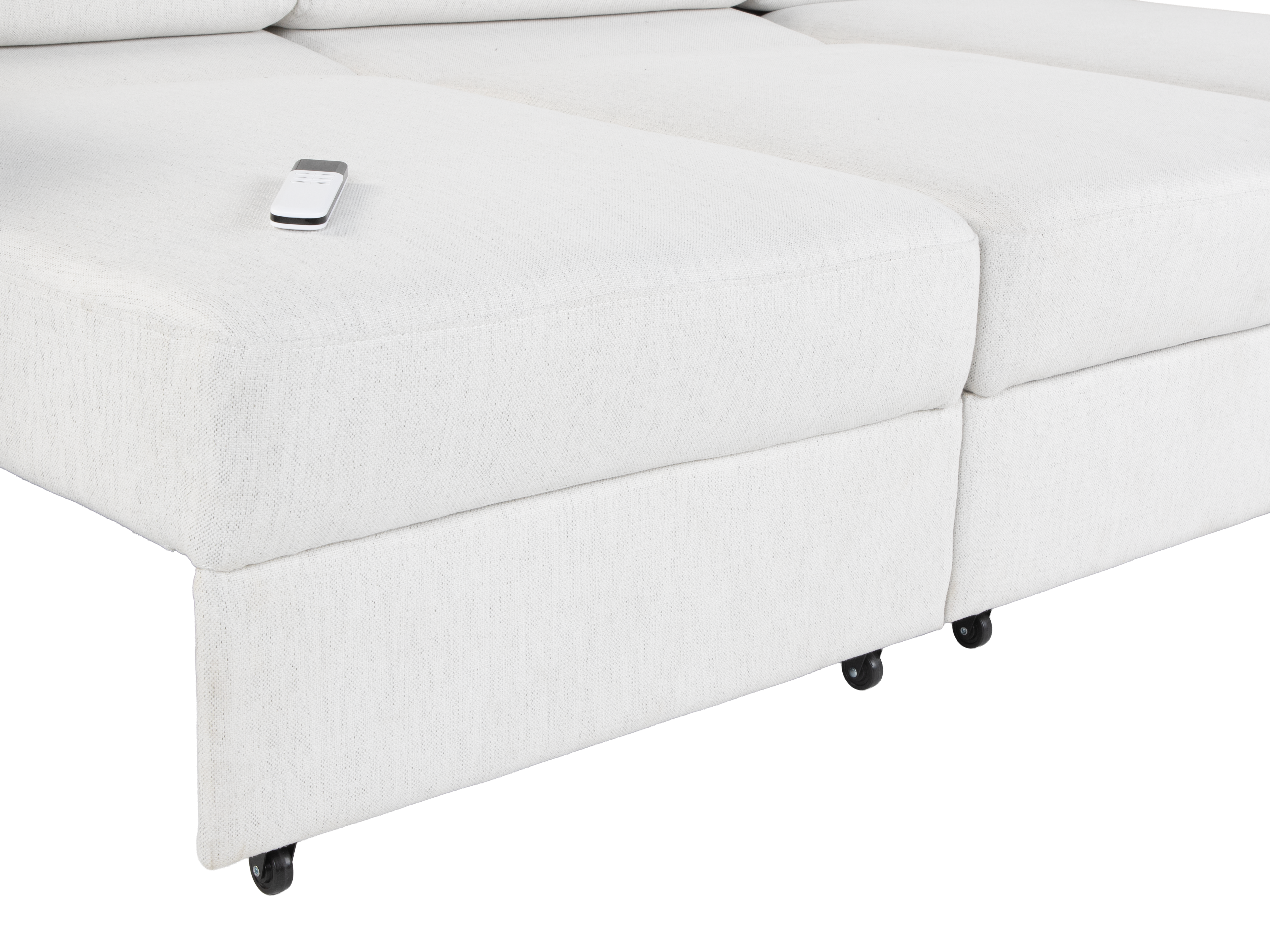 Turn your living room into a lounge-by-day, guest-ready retreat by night. This modern 2-piece sectional pairs deep, supportive seats with a smooth electric sleeper mechanism so the entire seating surface converts to a bed at the touch of a button (handheld remote included). A reversible chaise lets you set it up left or right to fit your space, and the chaise seat lifts to reveal generous hidden storage for blankets and pillows. Adjustable 3-position headrests dial in perfect viewing or napping angles, while dual USB-A/USB-C ports on the outside of each arm keep devices charged without leaving the sofa. Built on a plywood/MDF frame with spring support and pocketed-coil + foam cushions, it’s upholstered in durable, easy-to-style white 100% polyester.