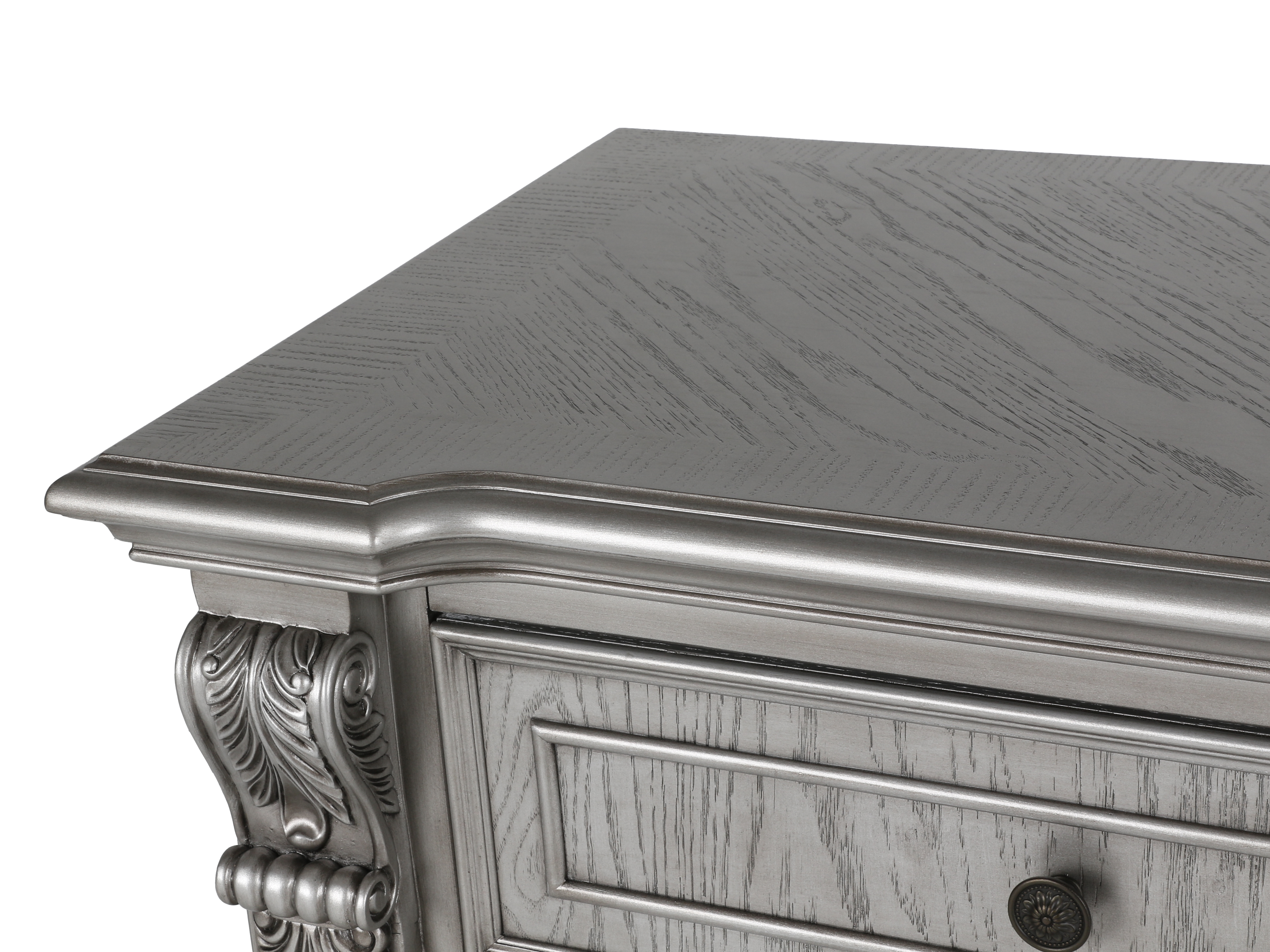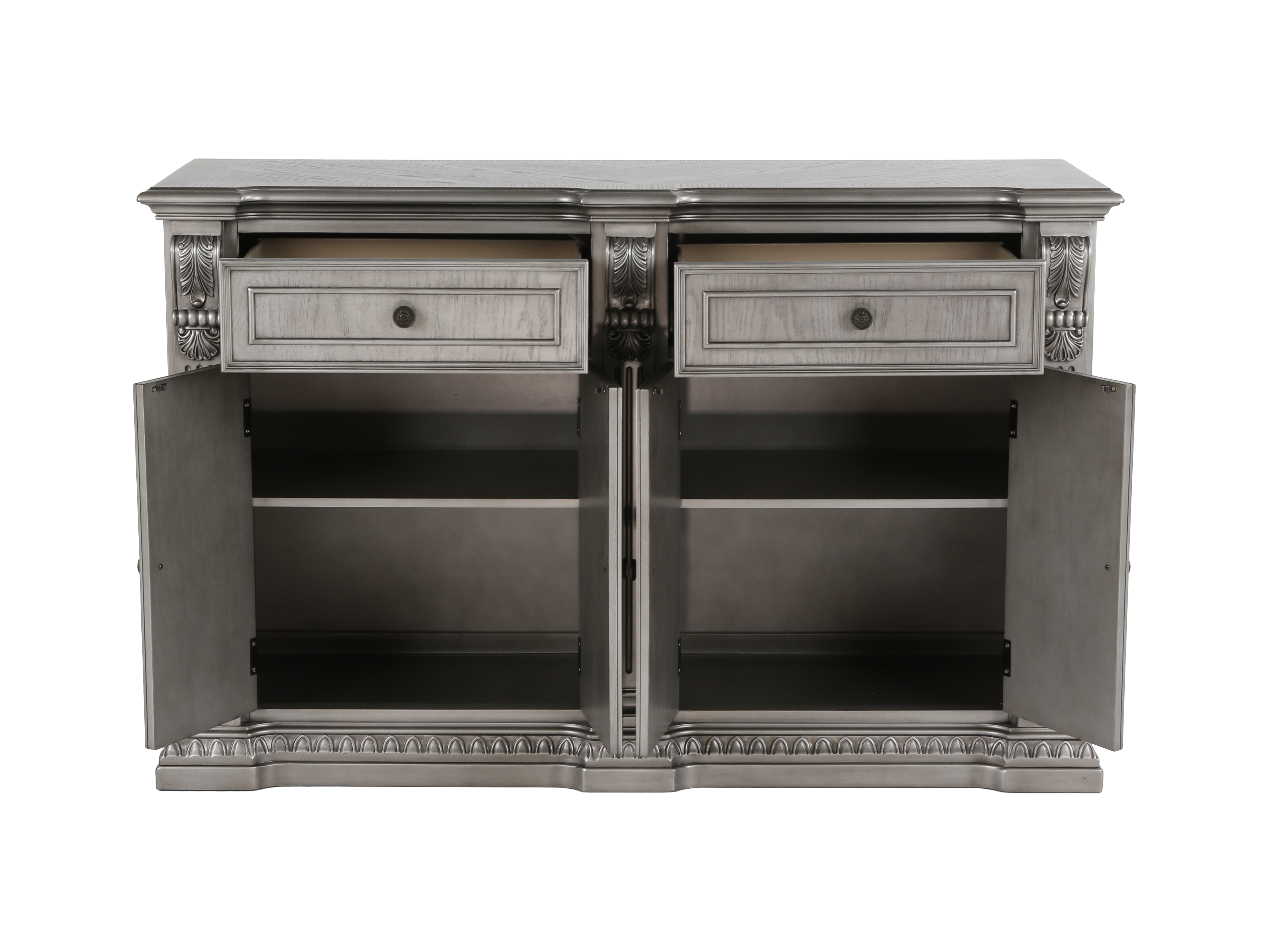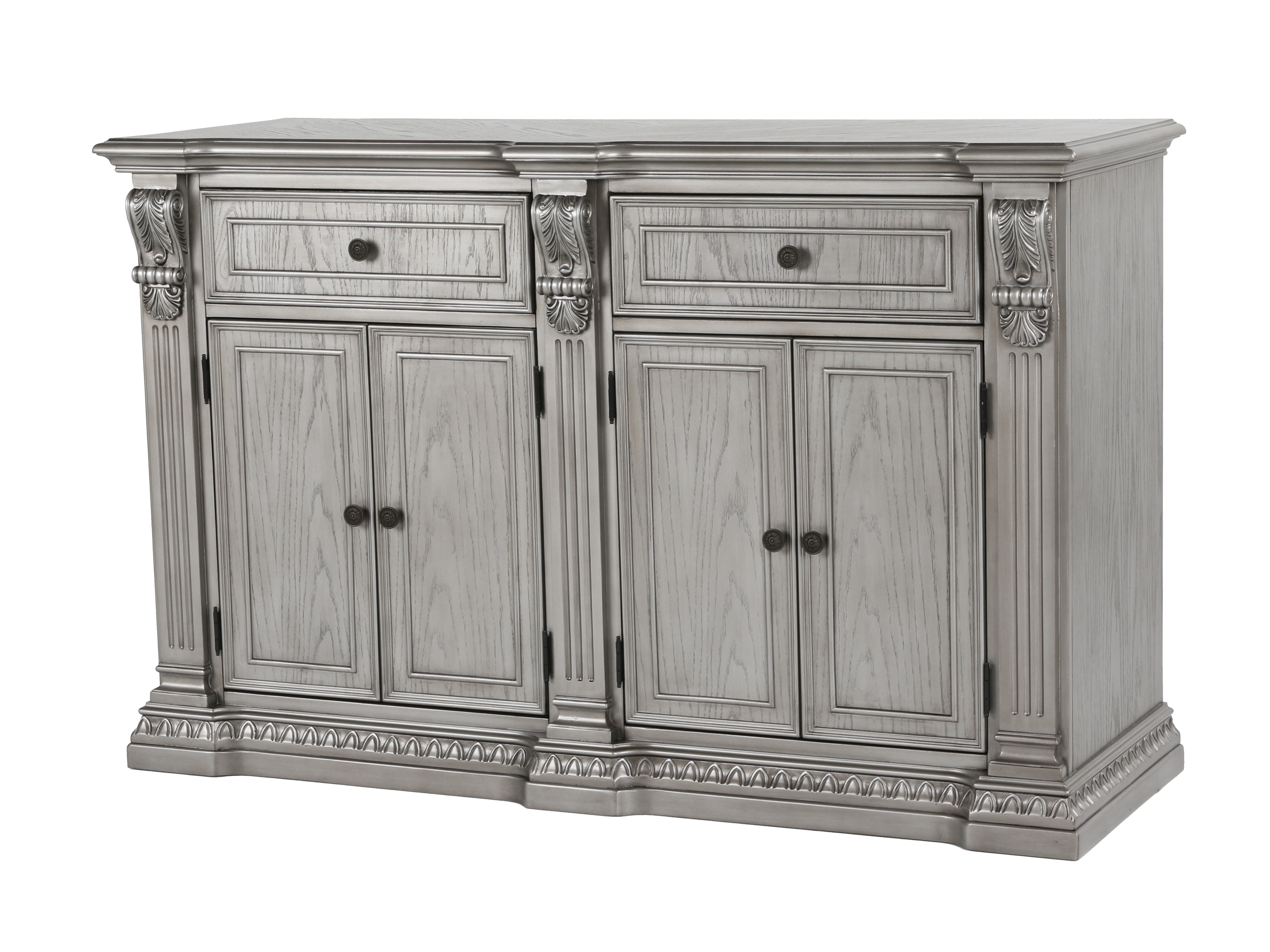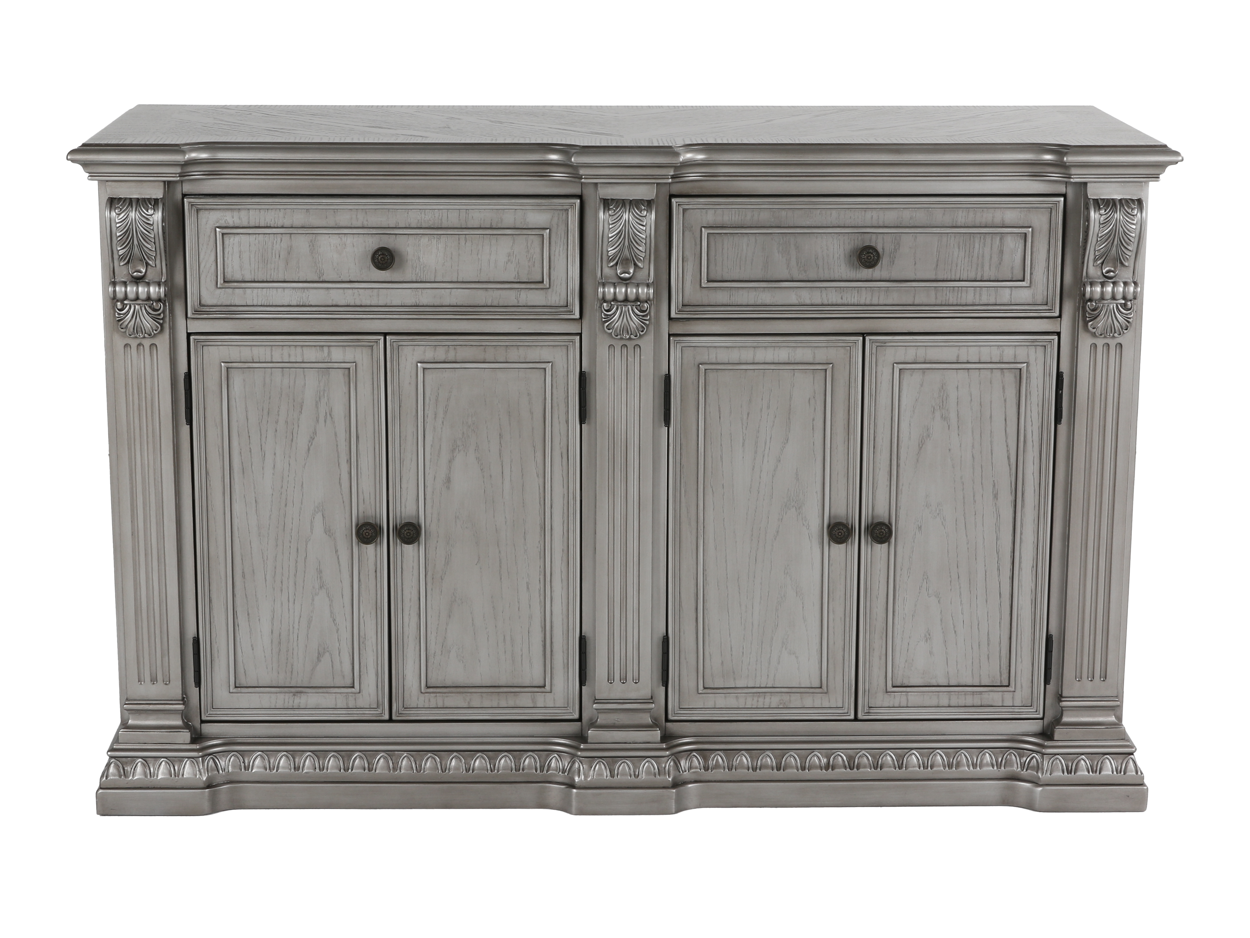 Carved acanthus corbels, fluted pilasters, and a sculpted base rail with decorative trim give this buffet a high-end, furniture-maker feel. Pair it with the matching silver dining table and chairs for a coordinated, designer dining room.
