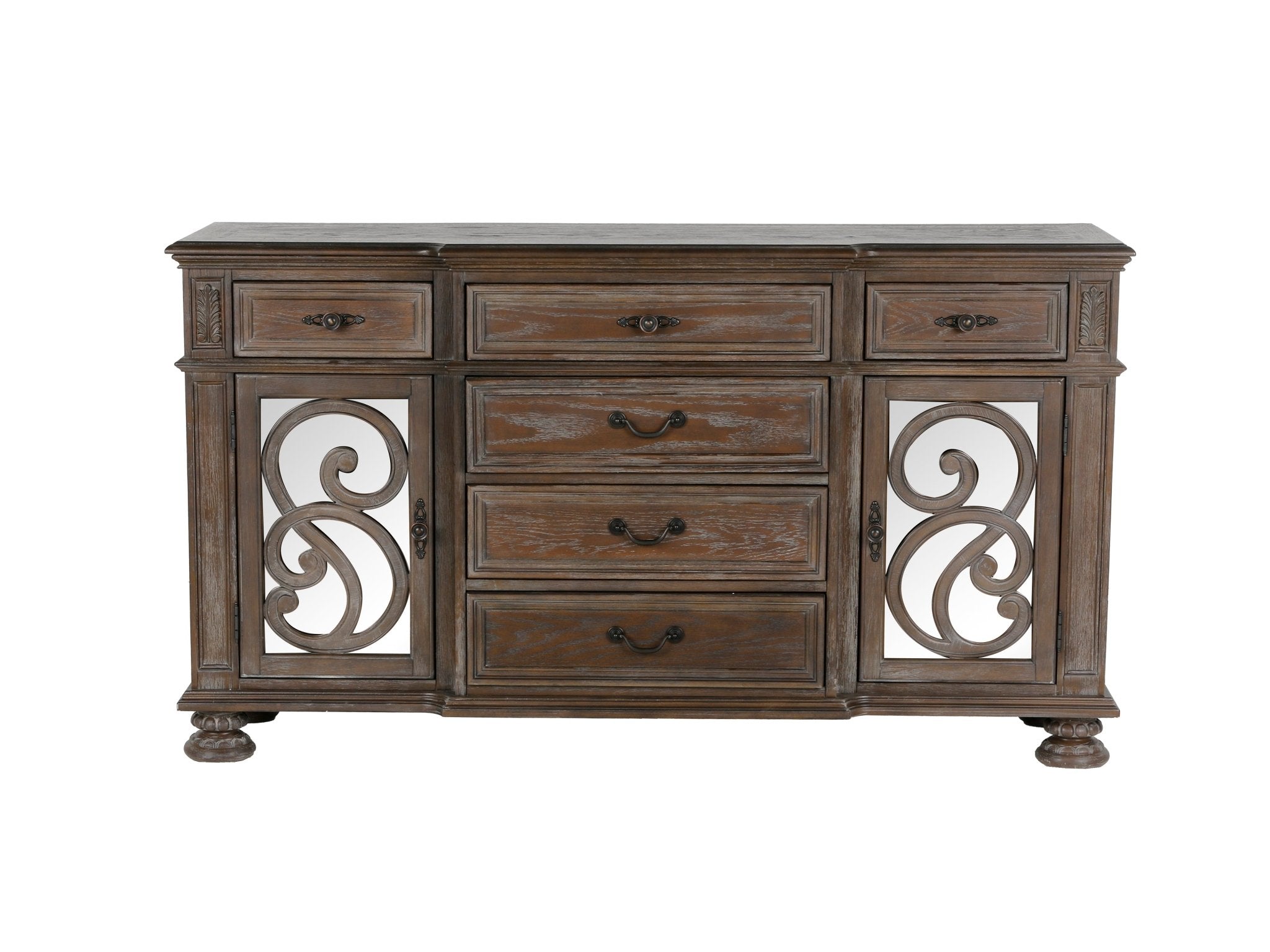 This buffet server gives you plenty of room to store your flatware. With mirror accents on the doors, this wooden buffet server brings more depth and dimension to your space while offering a convenient surface to arrange decorative items. Graceful details like the floral carved accents and scrolled door inserts lend softness to the design, while the brown finish and mirror accents make for a striking focal point. It features three top drawers and three center drawers, plus a pair of side cabinets with decorative doors sporting scrolled inserts and mirrored backdrops.