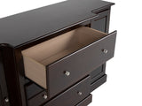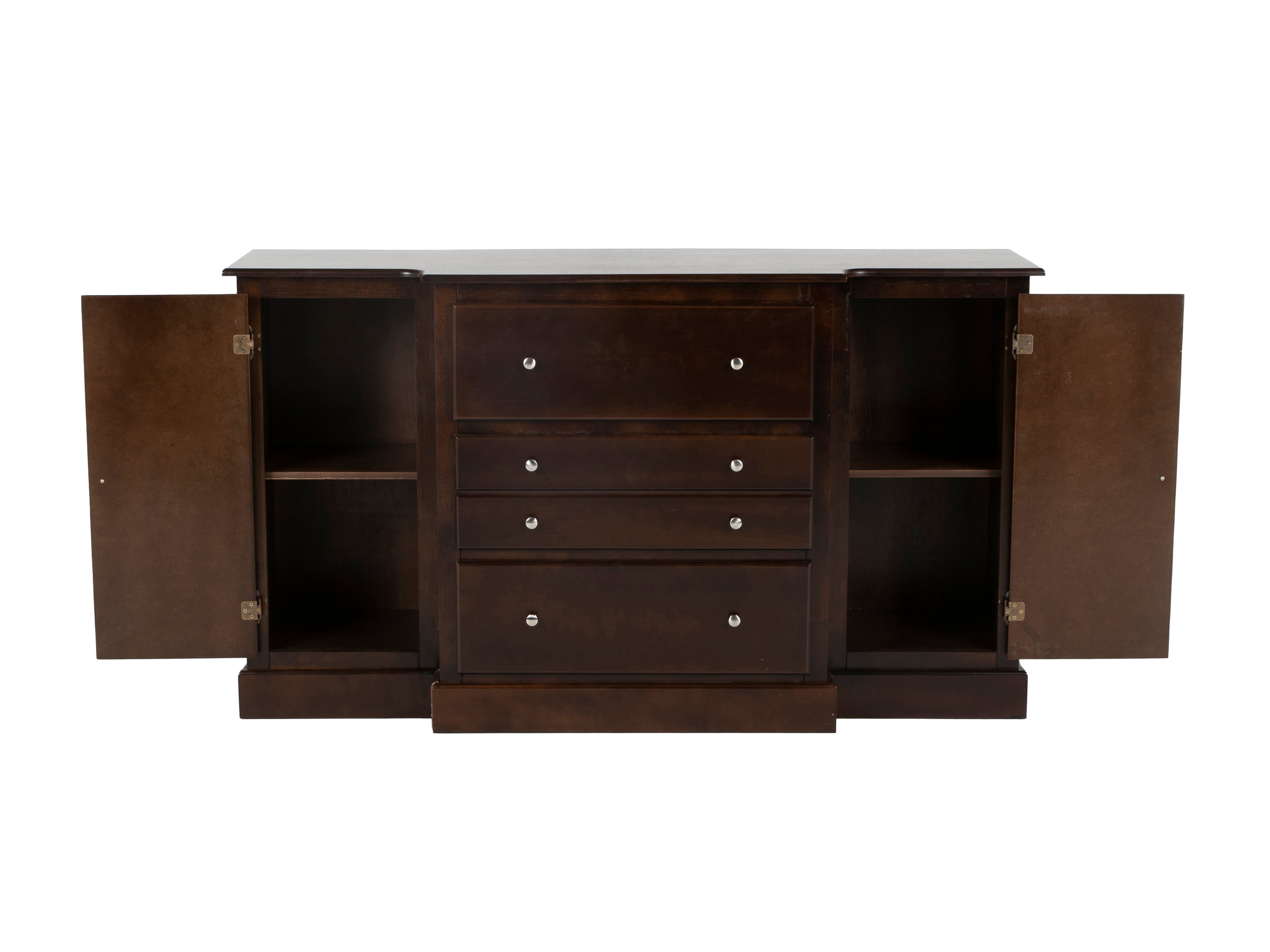 Clean and simple lines make this contemporary furnishing a stand out in any home. This buffet is finished in rich walnut and features multiple cabinets and drawers, providing plenty of storage space. This piece can be used in a dining room as a buffet or a living room as an entertainment center.