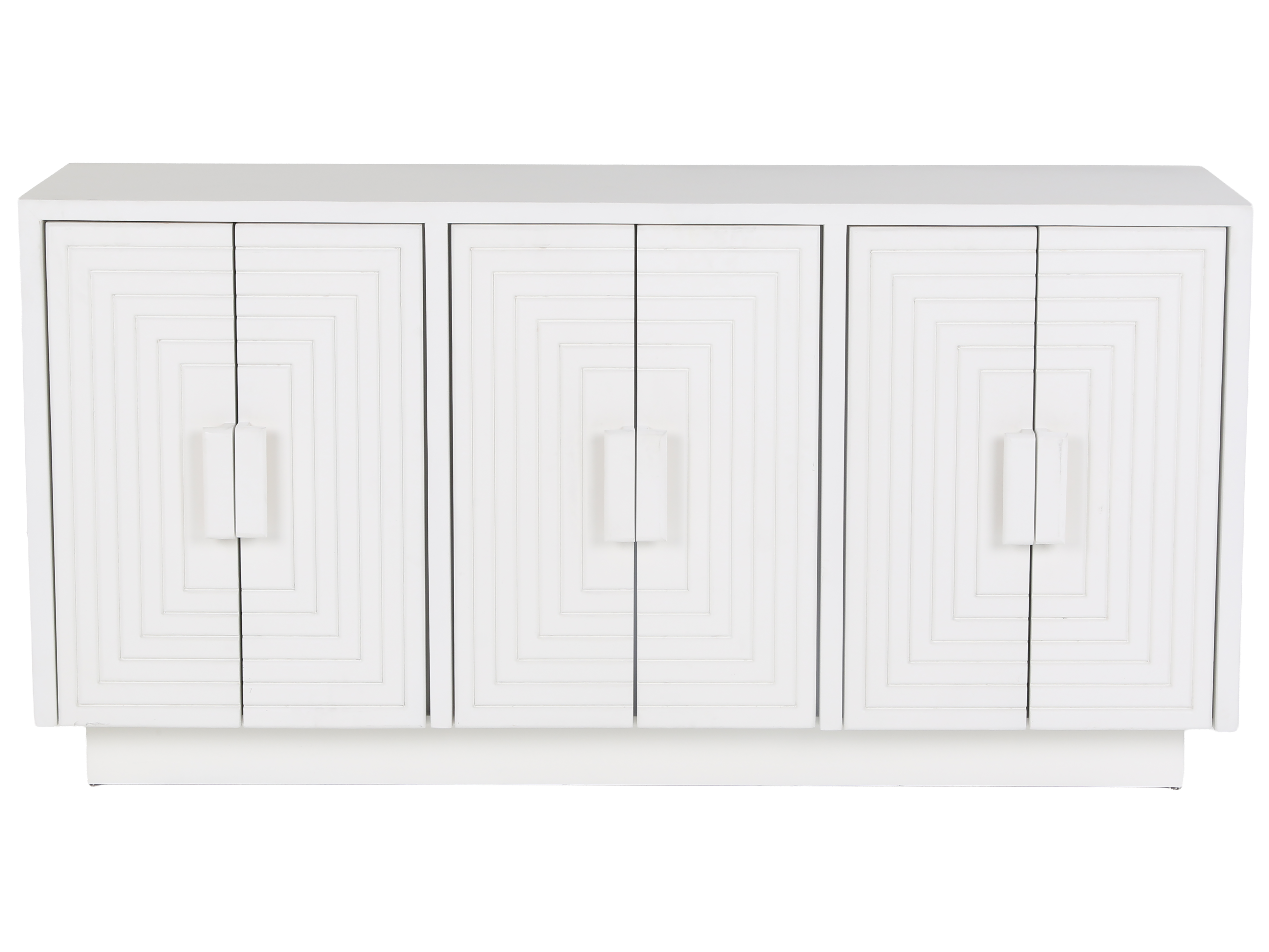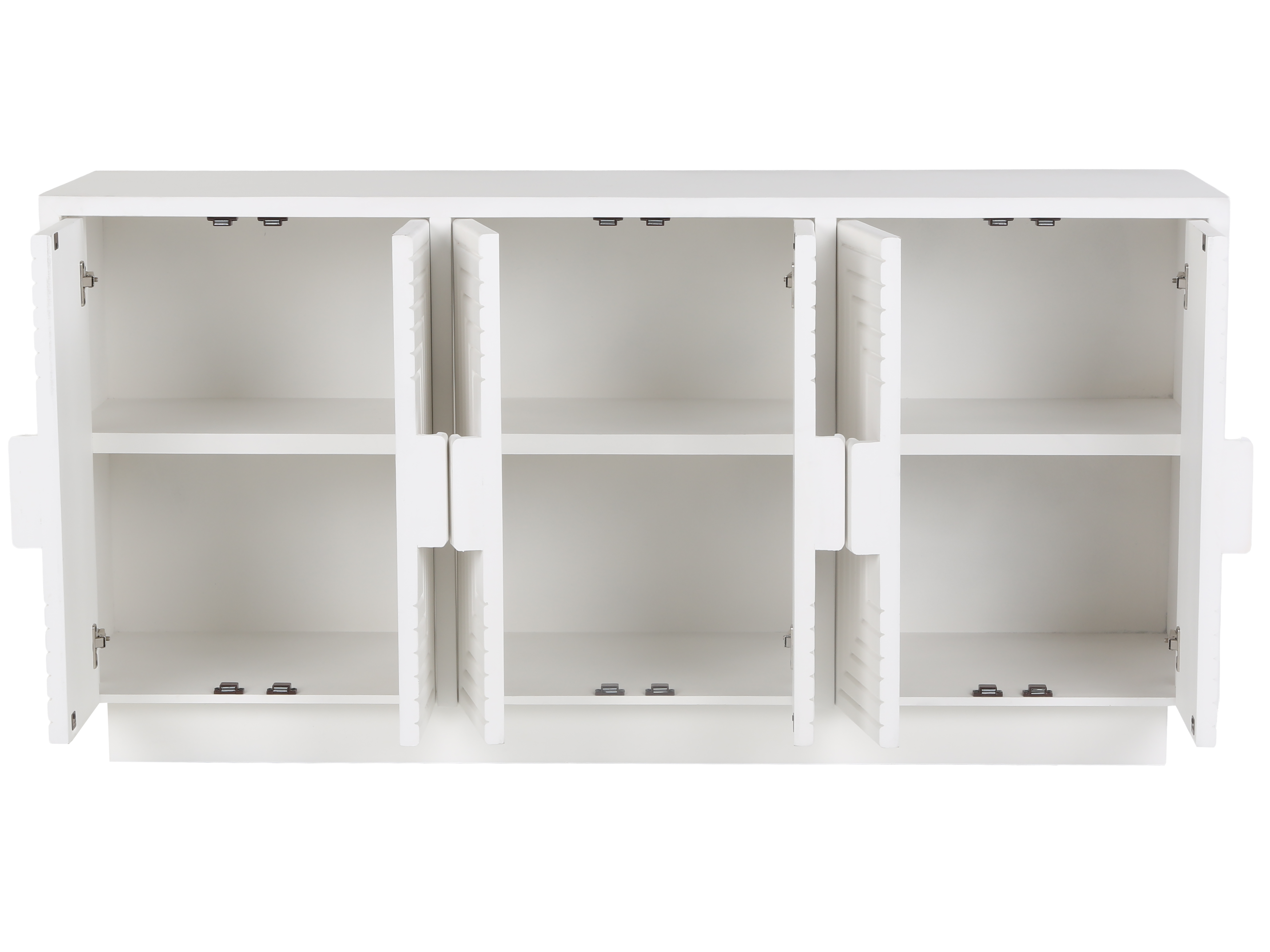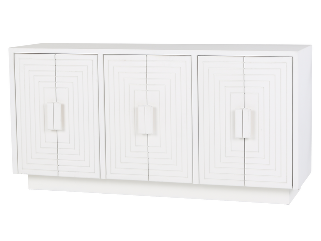 This modern white 6-door sideboard combines clean lines with a bold geometric panel design for a statement look. The seamless integrated handles add a minimalist touch, while the spacious interior with adjustable shelves provides versatile storage for dining essentials, décor, or media items. Its bright white finish enhances any contemporary living, dining, or office space.