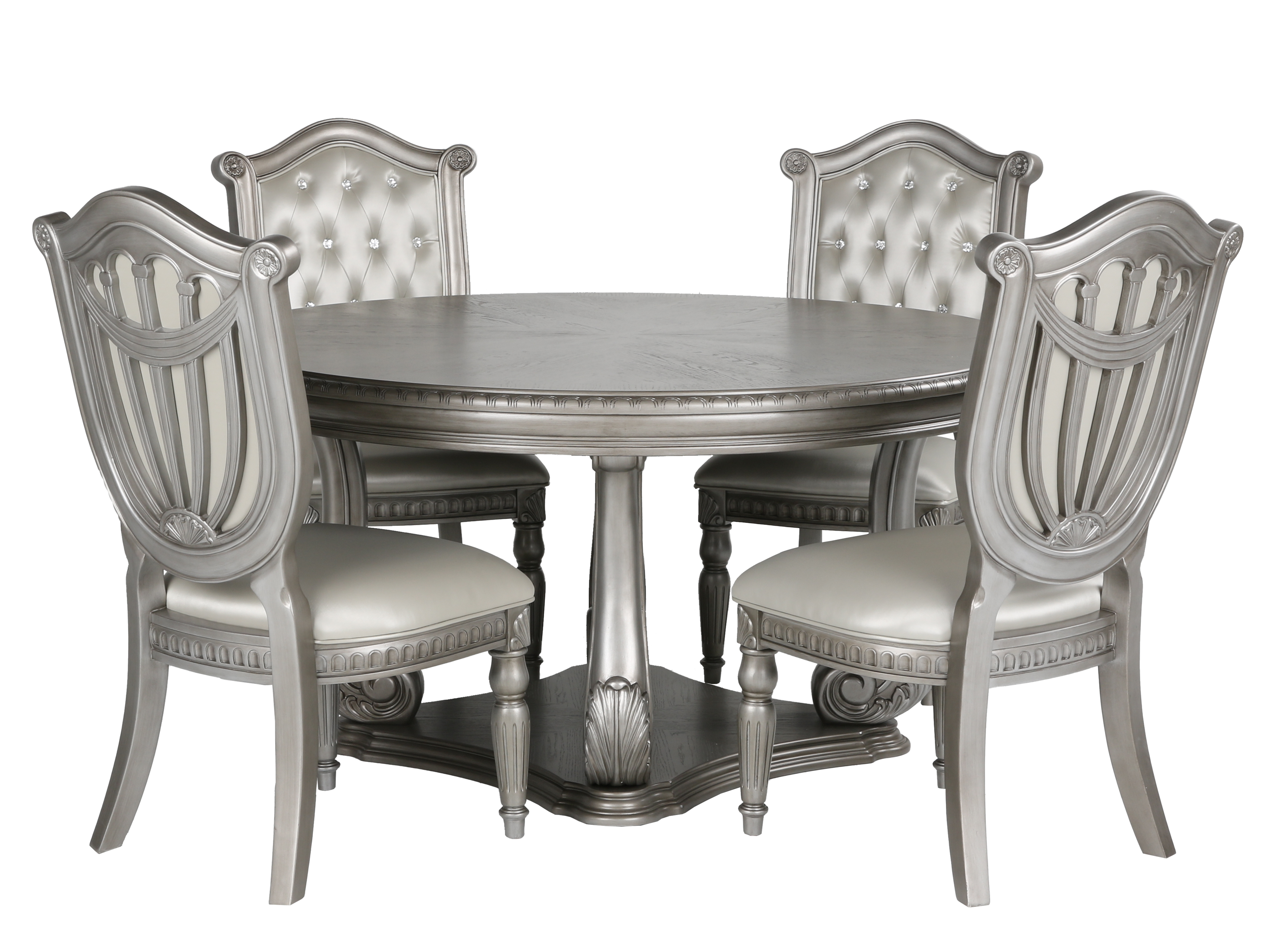This silver round dining set includes one table and four side chairs, comfortably seating up to four people for everyday meals or special occasions.