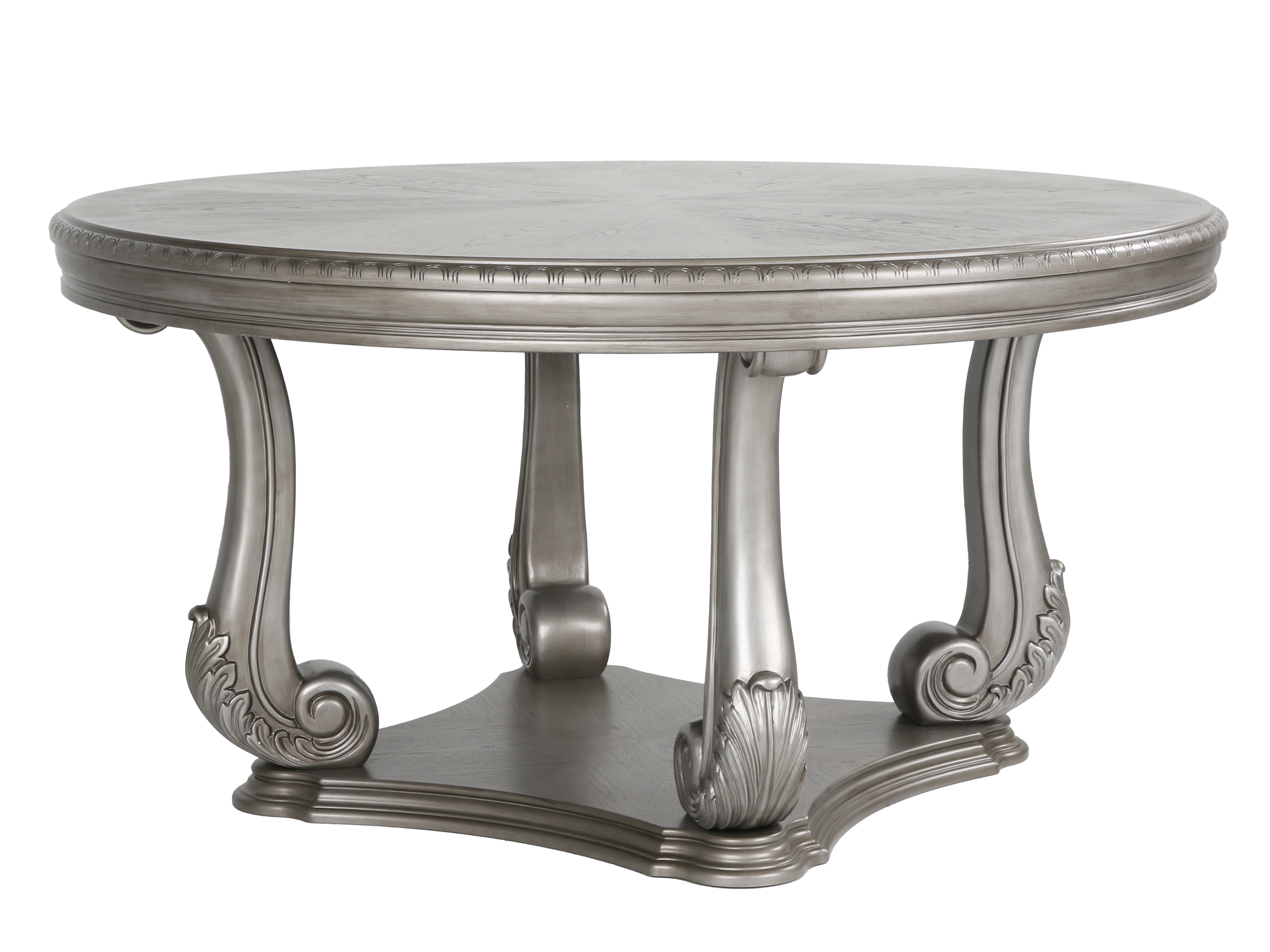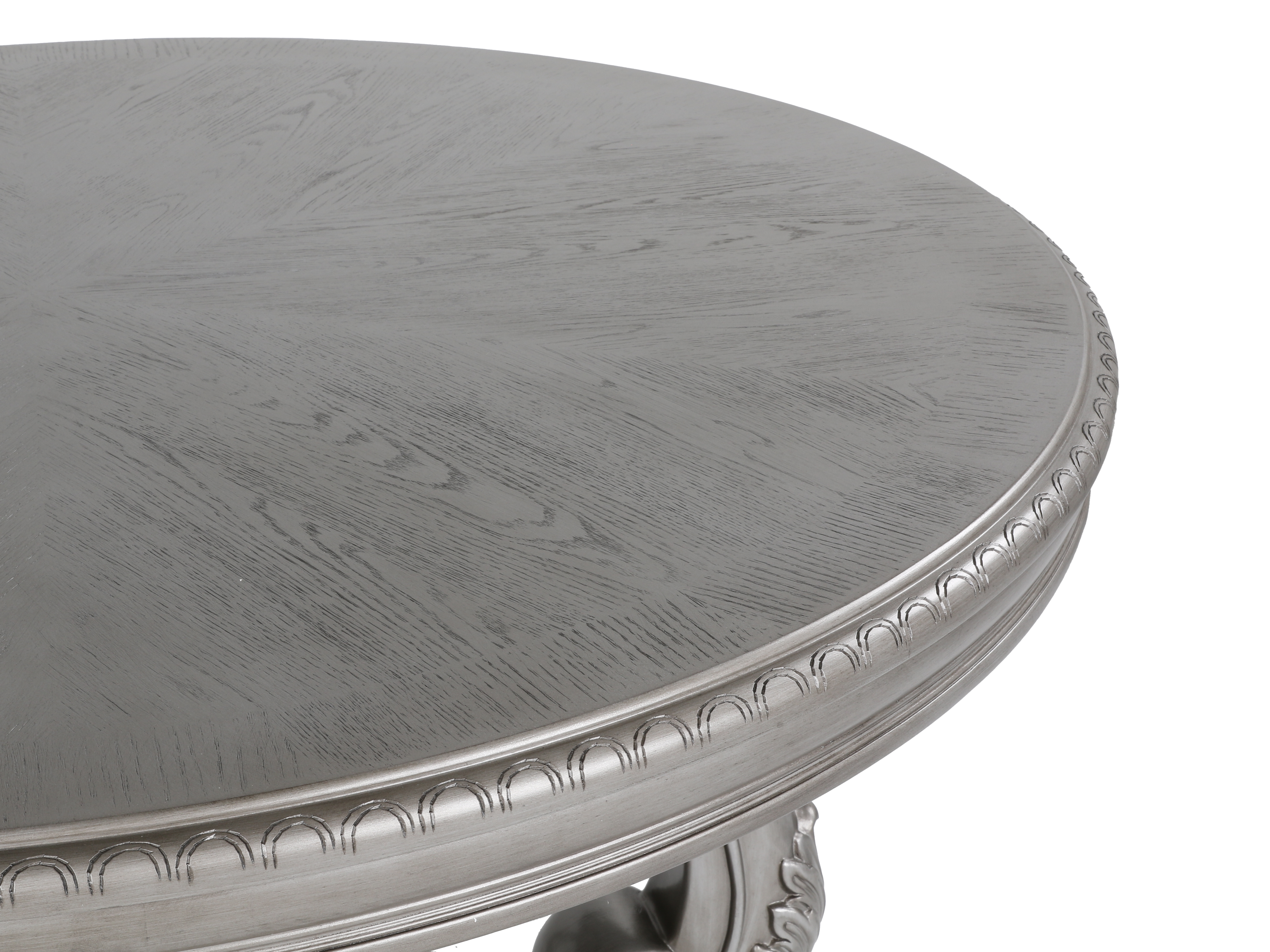 Dress up your dining space with this glamorous 5-piece silver round dining set. The round pedestal table features a beautifully patterned wood-grain top in a soft gray tone, framed by ornate edge molding and supported by sculpted scroll legs with leaf detailing. The metallic silver finish adds a refined shimmer that instantly brightens your room.