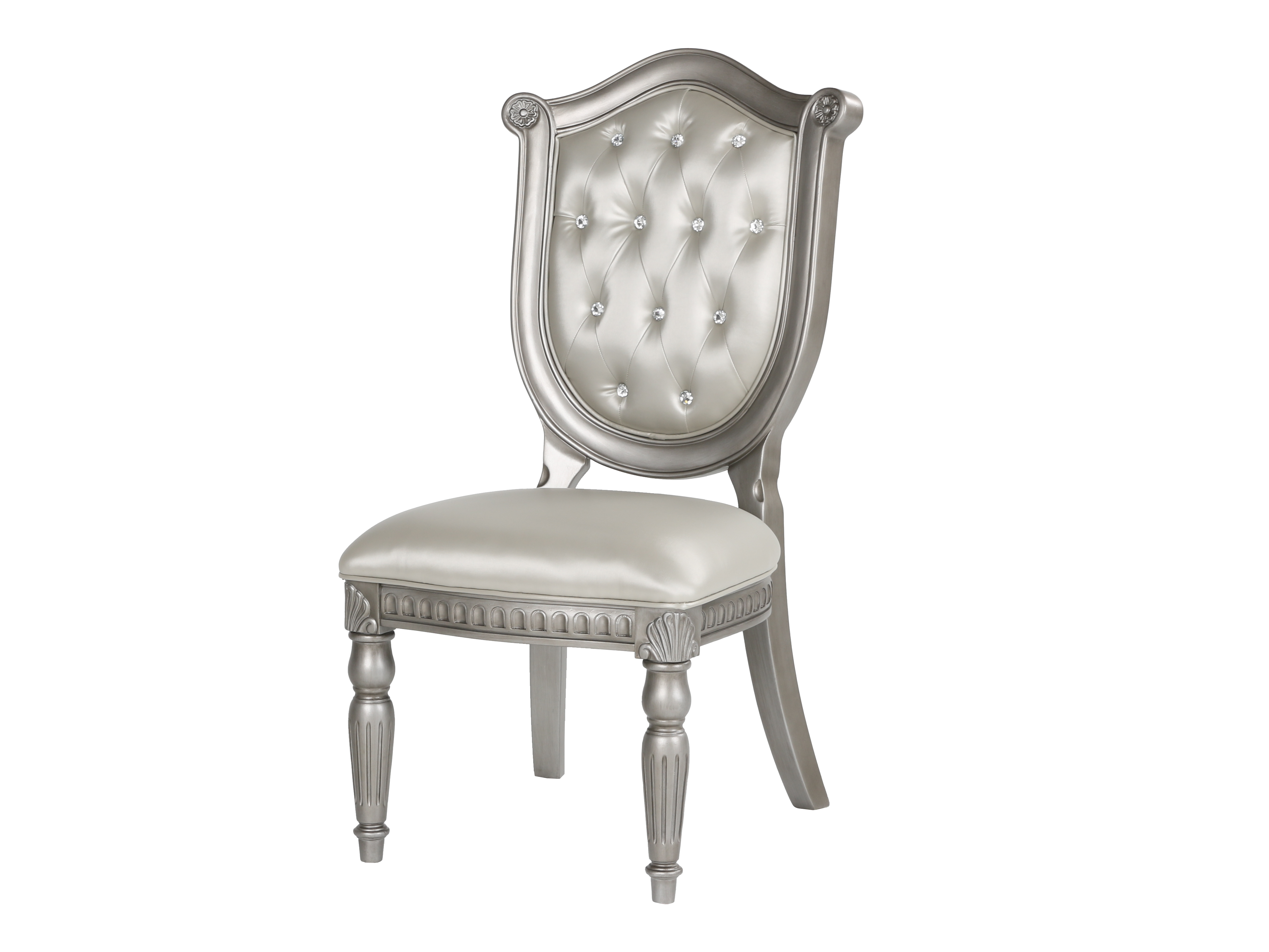 Four matching side chairs complete the set with showstopping style. The shield-shaped backs are padded and deep-tufted with sparkling crystal-style buttons, while the smooth pearl faux-leather seats keep guests comfortable through every course. Fluted front legs and carved accents echo the table base for a cohesive, high-end look.