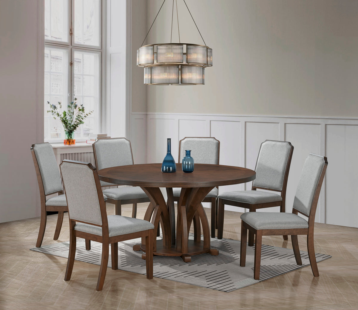 7-Piece Walnut Round Dining Set with Upholstered Side Chairs