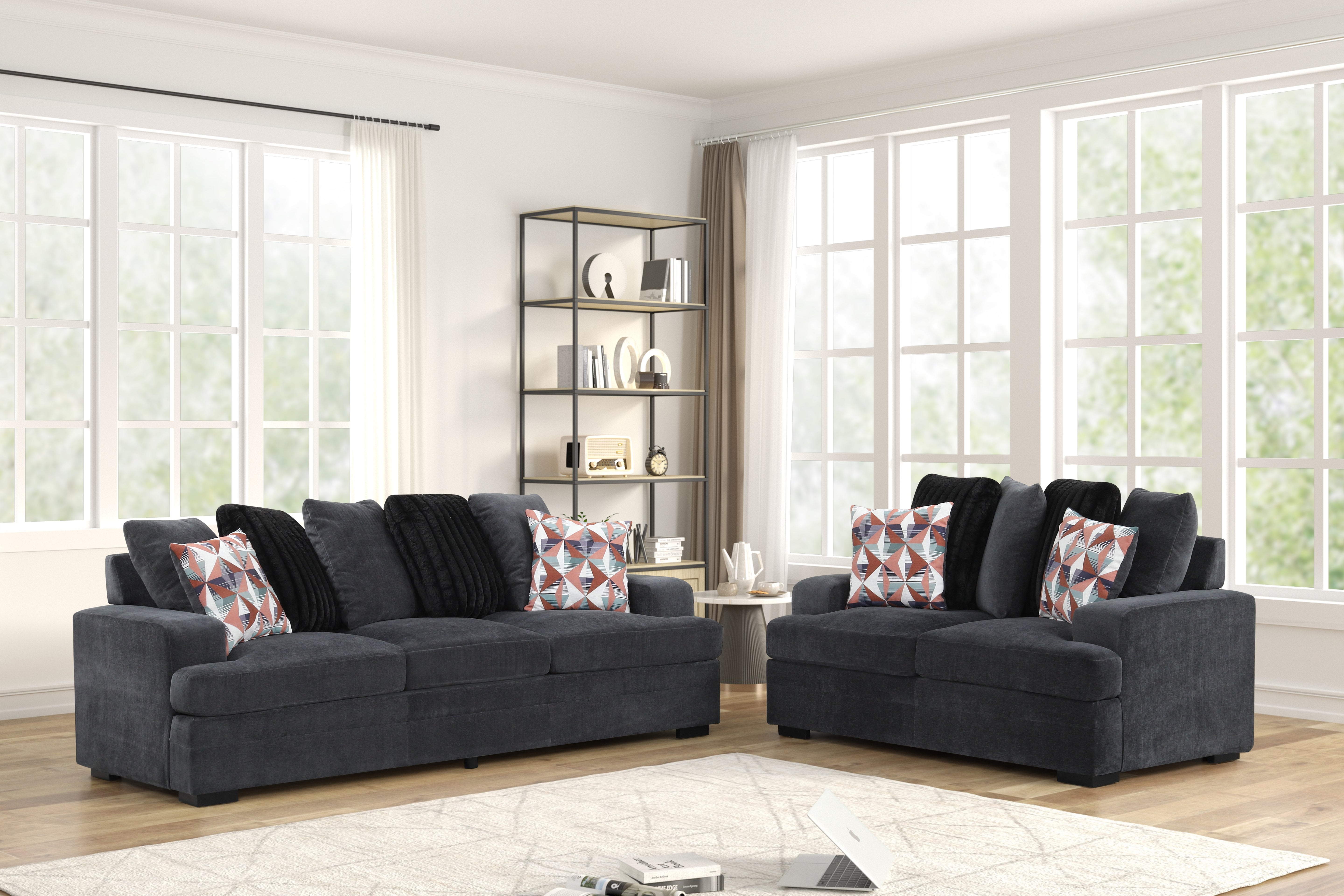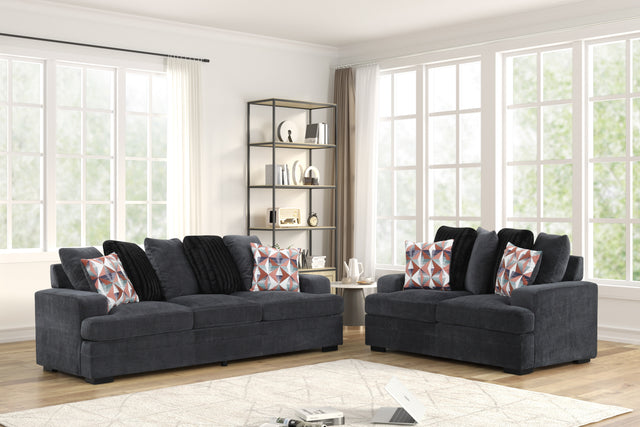 Set the tone for a relaxed, modern living room. Upholstered in a durable, easy-care performance fabric in deep charcoal, this two-piece set layers generous cushions over a kiln-dried, corner-blocked plywood frame with zig-zag spring support and high-density foam. Low, tailored arms and blocky silhouettes keep the look clean, while black wooden legs ground the pieces. Both the sofa and loveseat arrive with plush accent pillows—geometrics plus solid black—for an instant, styled finish.