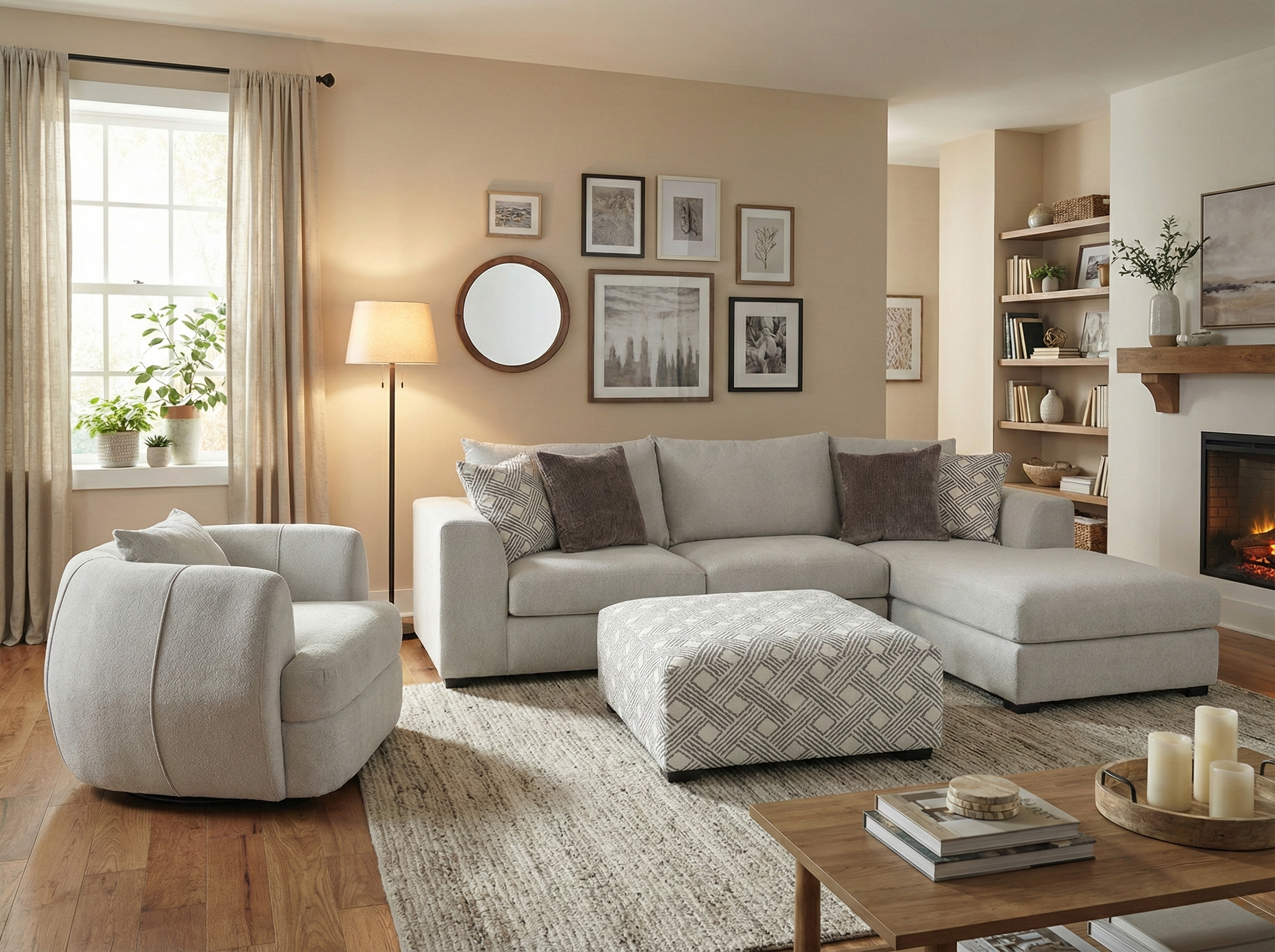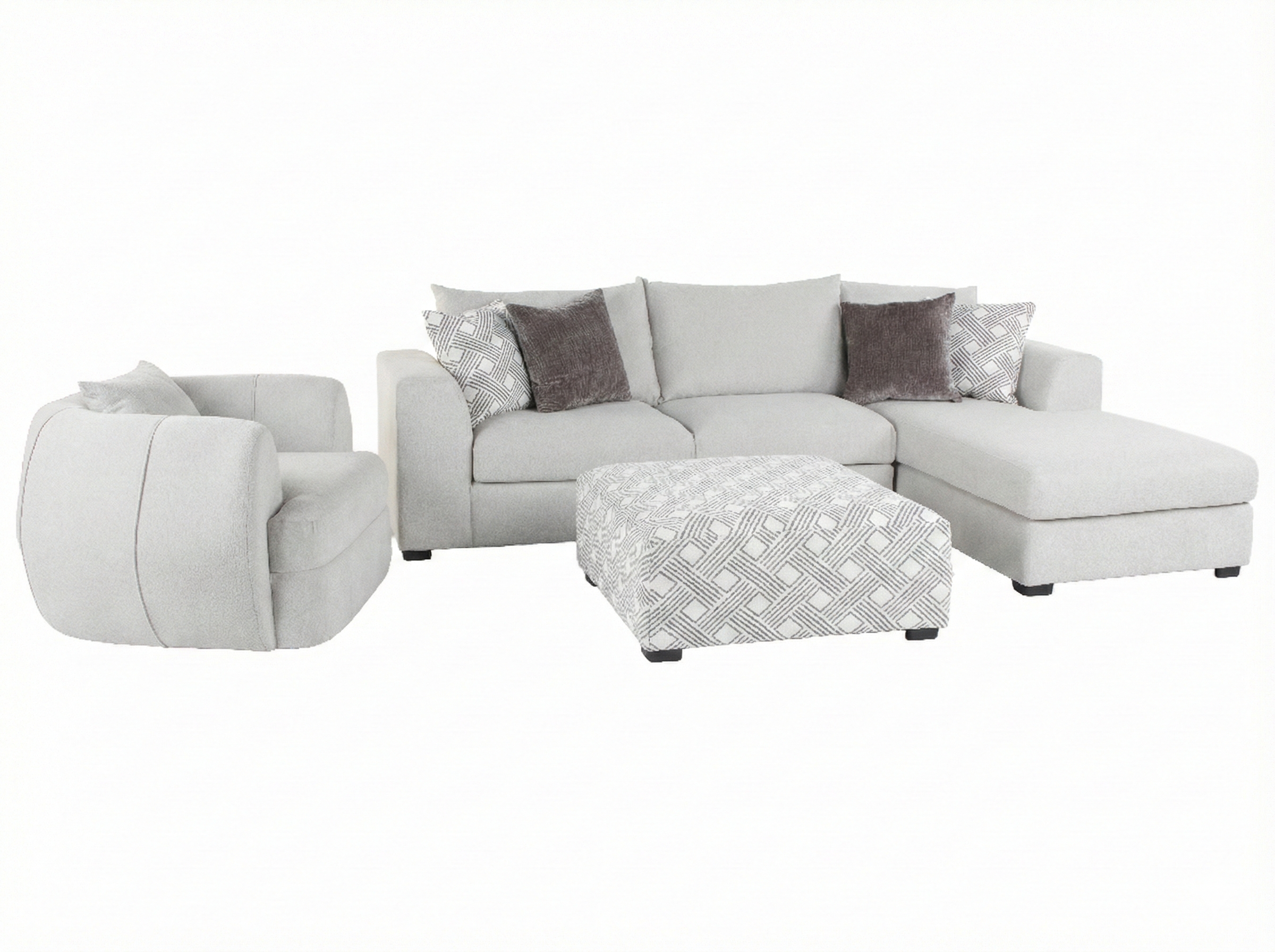 Brighten your living room with this modern, lounge-depth sectional in a soft light-silver woven fabric. Wide track arms, plush back cushions, and supportive seats keep the profile clean while dialing up everyday comfort. The right-facing chaise (on your right as you face the sofa) delivers full stretch-out space without crowding the room. Includes 4 accent pillows to layer in pattern and texture. Coordinates with the matching swivel chair and patterned ottoman (sold separately) for a complete, designer-pulled look.