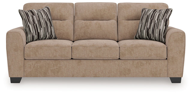 Strike a balance between the indulgent comfort you crave and the contemporary aesthetic you long for. The fabulously soft, mocha-colored upholstery of this sofa takes neutrals to new heights. Plus there's plenty of room to spread out and relax solo or with your bestie. Geometric-patterned accent pillows perfect the richly on-trend aesthetic.