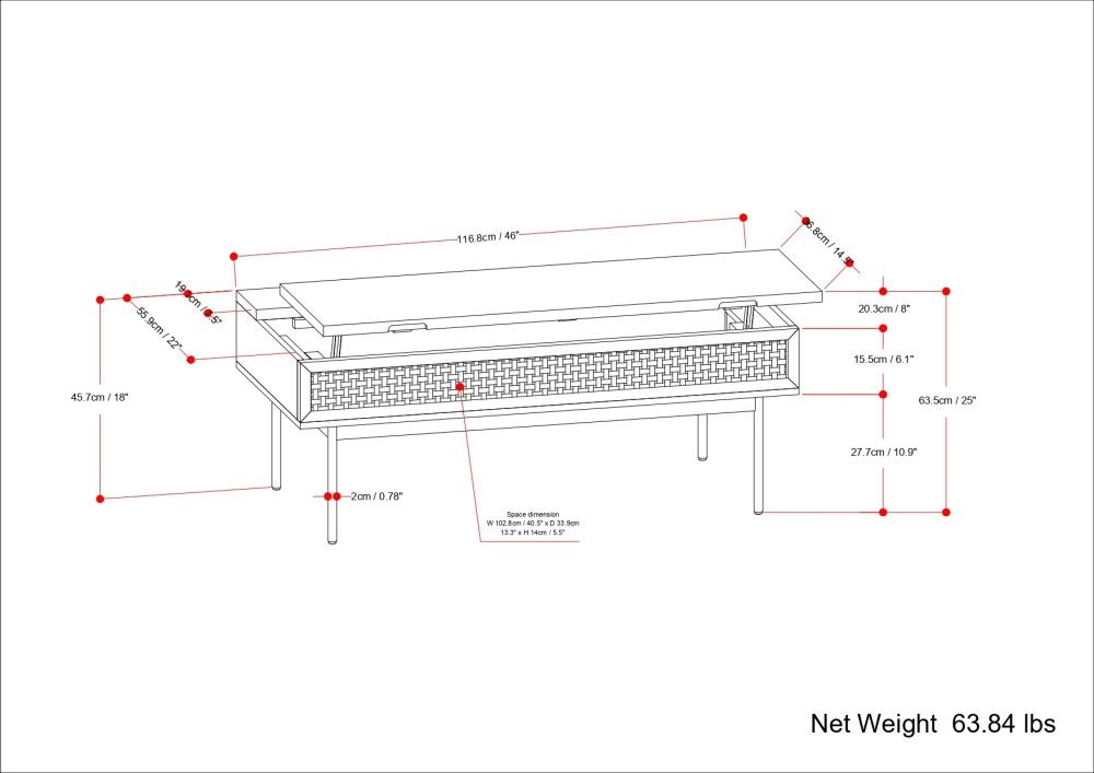 22.0"W x 46.0"D x 18.0"H - 63.7 lb