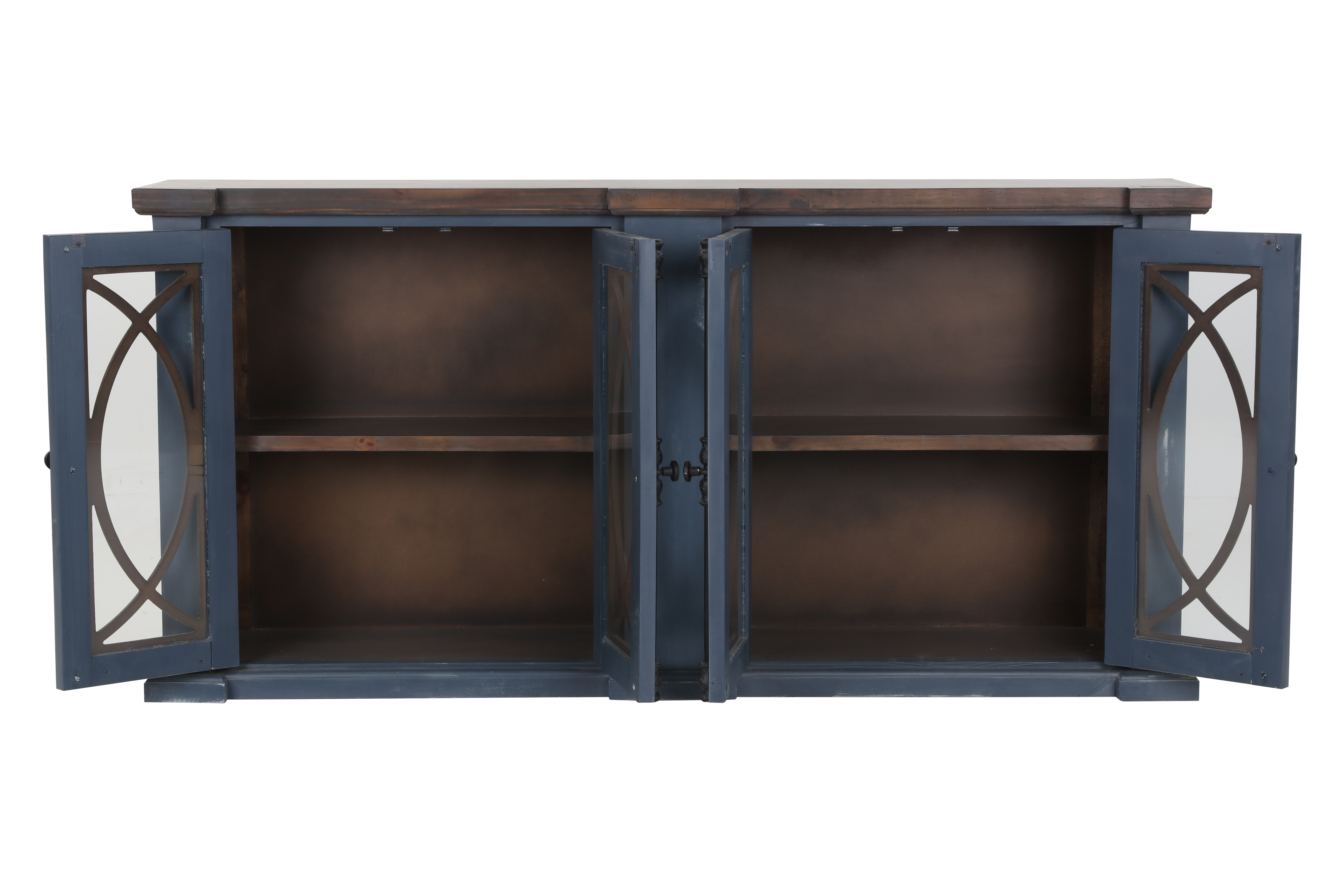 This stylish TV console is perfect for creating a cozy and inviting atmosphere in your living room. The distressed blue finish and decorative metal accents give it a rustic charm, while the glass doors add a touch of elegance. The console features ample storage space with shelves behind the doors, perfect for storing your media and decor.