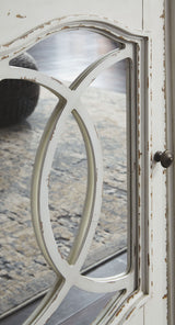 Elevating the art of traditional cottage styling, this TV stand is sure to serve you beautifully for years to come. Antiqued two-tone finish blends a chipped white with a distressed wood tone top for added charm. Cabinet door features inset mirror with filigree moulding for a fanciful twist.