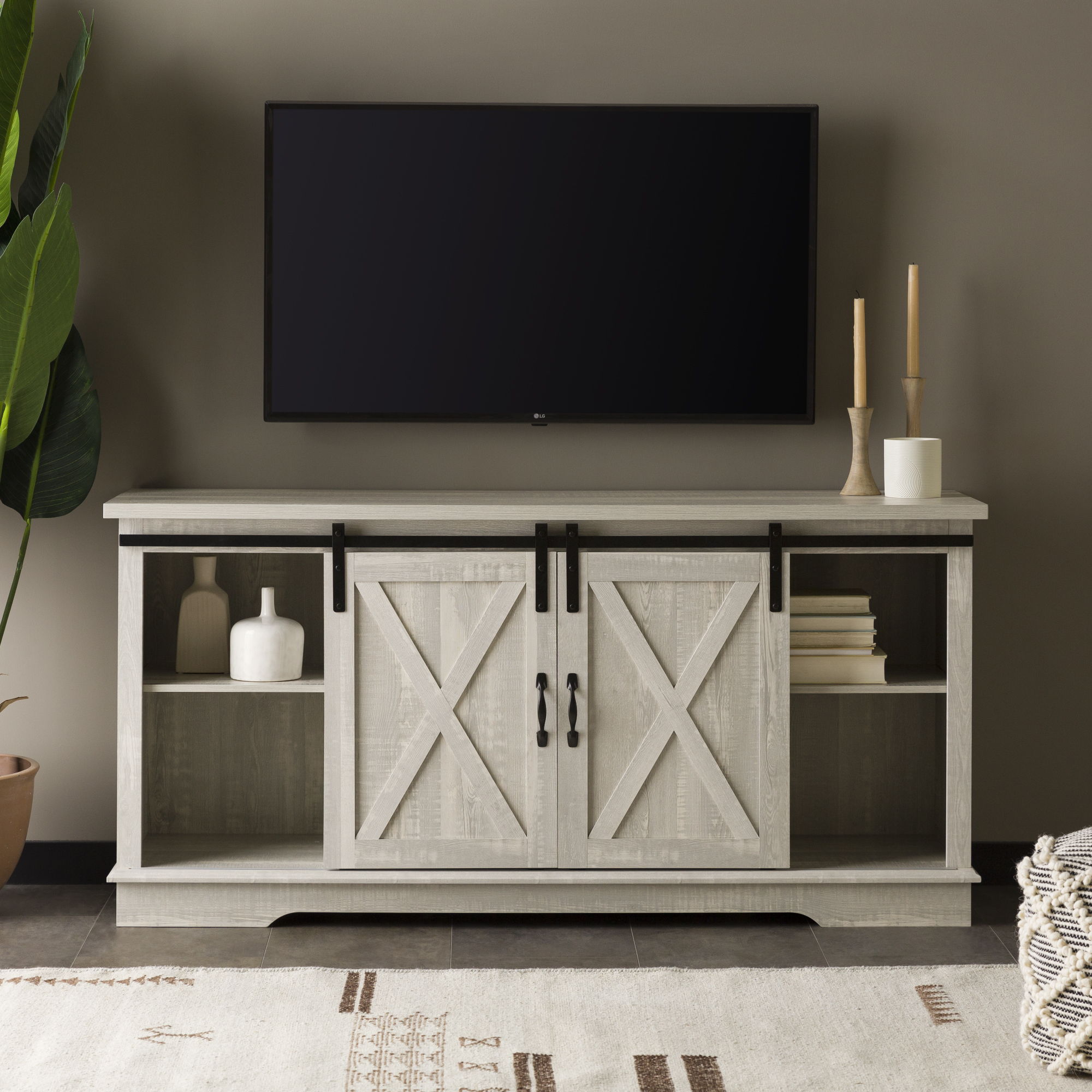 Farmhouse Sliding X Barn Door 58" TV Stand For 65" TVs - Gray Wash