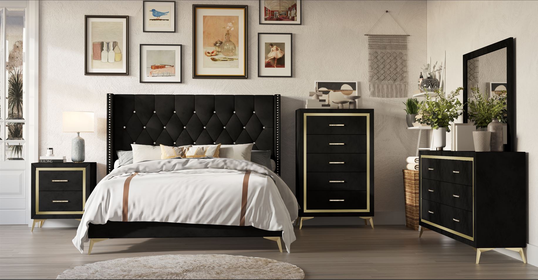 Sleek, modern, and glam, this 2-drawer nightstand finishes your room with a luxe black finish framed in warm gold-tone trim. The clean silhouette sits on tapered metal legs, and the drawers keep your nightly essentials organized. Designed to pair perfectly with the matching bed, dresser, and mirror from the collection.
